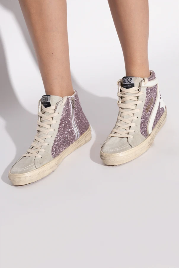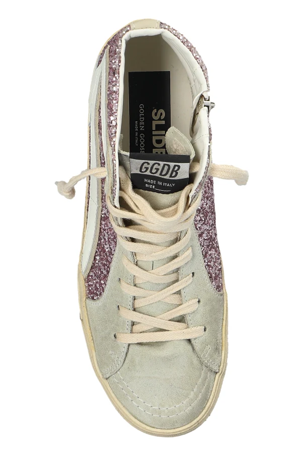Odkryj niezwykły wymiar stylu dzięki butom sportowym SLIDE CLASSIC od marki Golden Goose. To ikona luksusu utrzymana w duchu miejskiej nonszalancji, perfekcyjnie łącząca klasyczną sylwetkę sneakersów z ponadczasową estetyką retro koszykówki. Model wyróżnia się wysoką cholewką oraz fioletowym brokatowym panelem , nadającym całości wyjątkowego, artystycznego wyrazu.