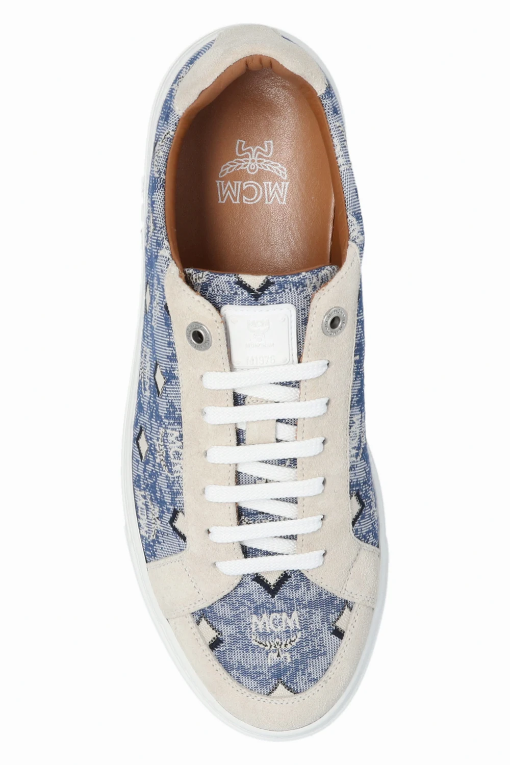 Niebiesko-biało-kremowe sznurowane buty sportowe MCM. Ozdobione żakardowym wzorem ‘Vintage Monogram’. Na języku biała naszywka z logo. Biała, gumowa podeszwa.