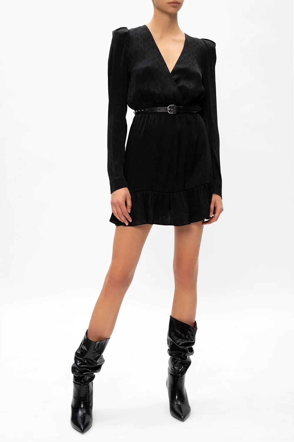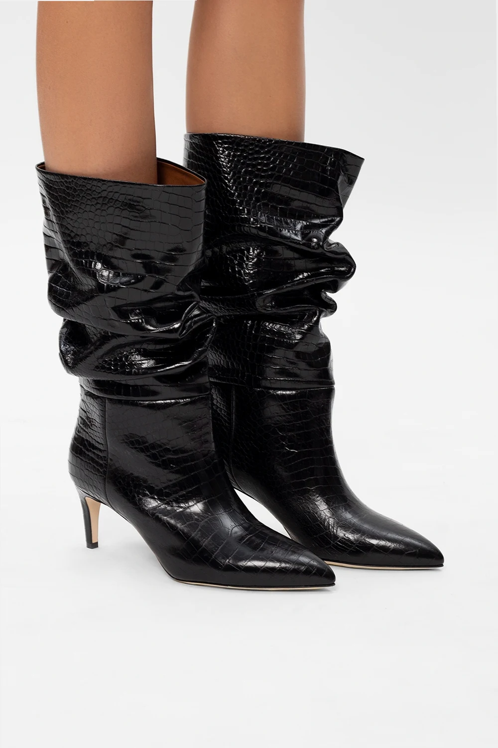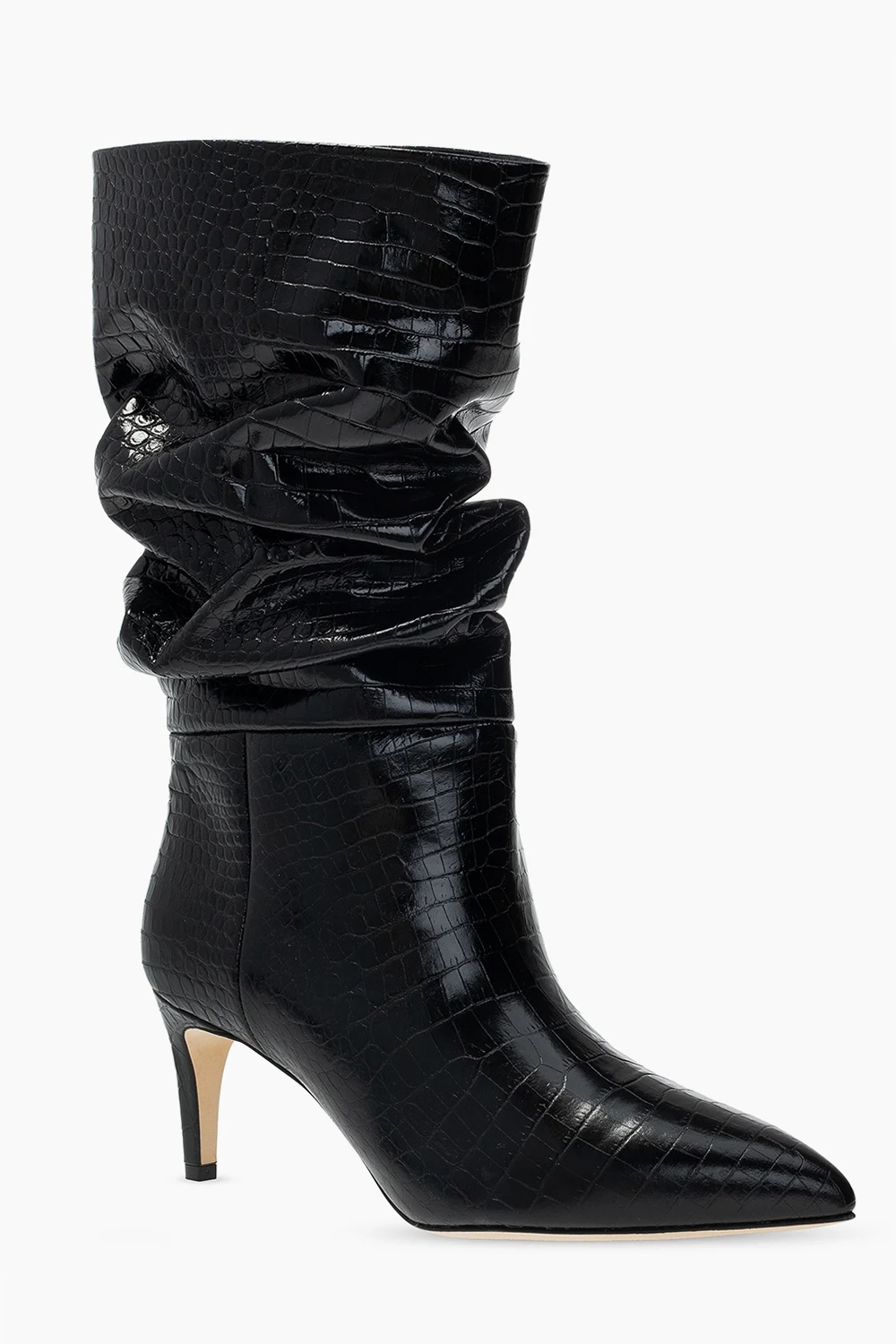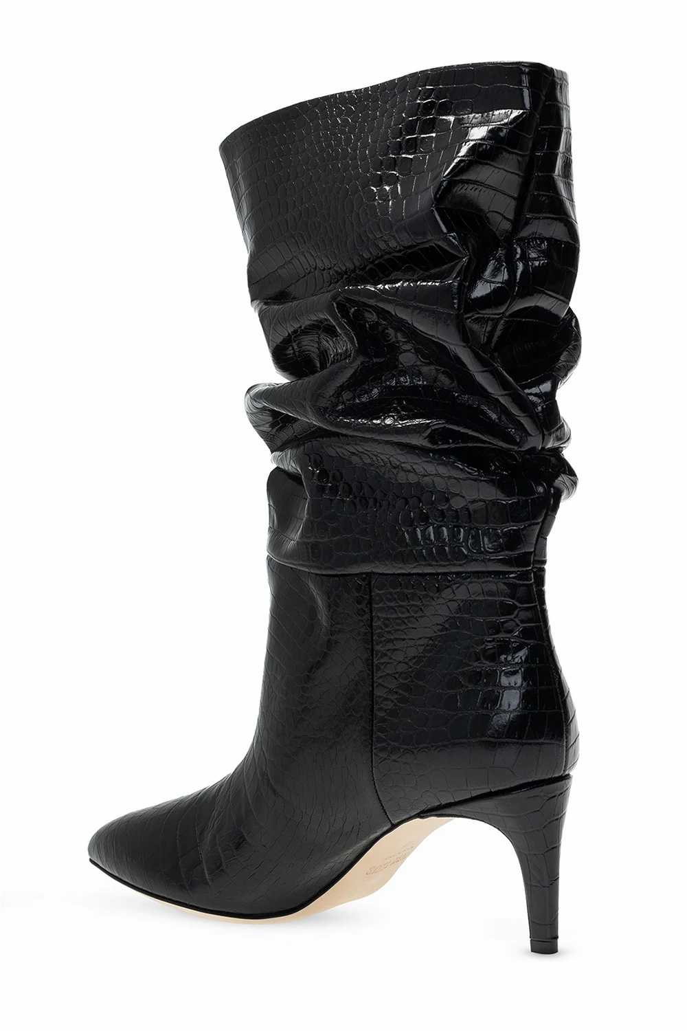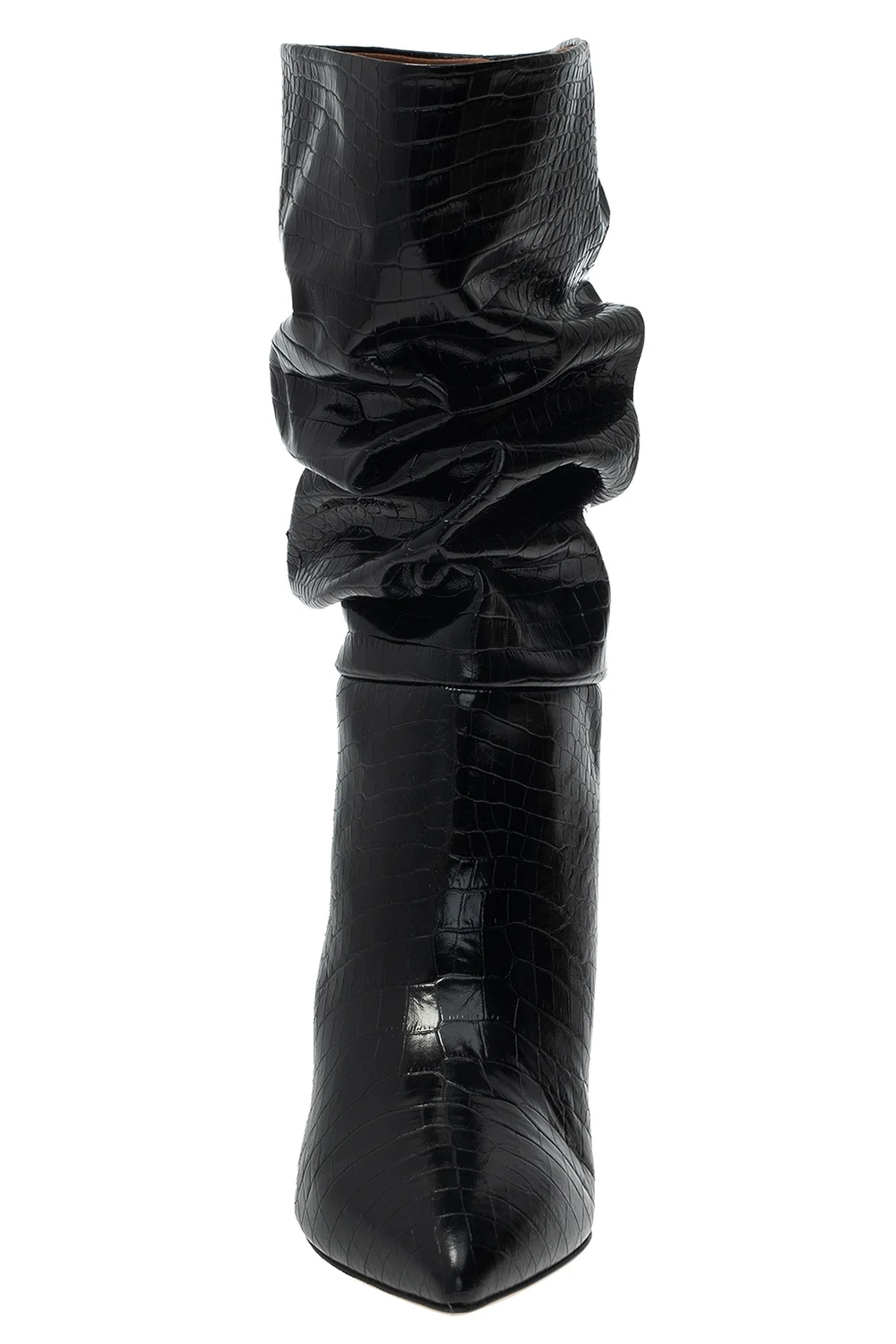 Czarne botki na obcasie, model ‘Slouchy’ Paris Texas. Wykonane ze skóry o specjalnej fakturze imitującej skórę krokodyla. Dekoracyjne marszczenie. Nosek w szpic. Beżowa, skórzana podeszwa.