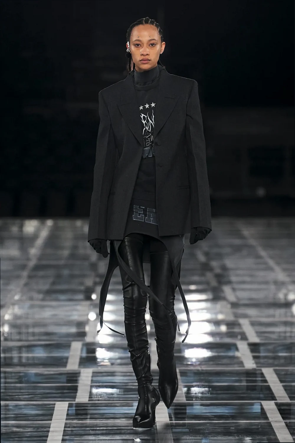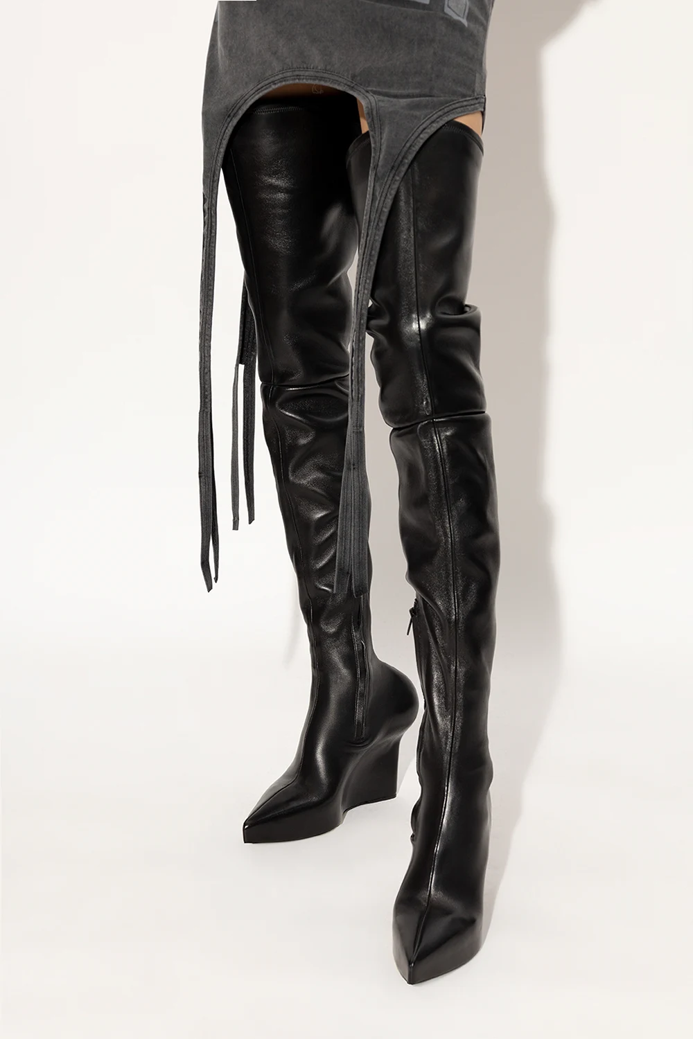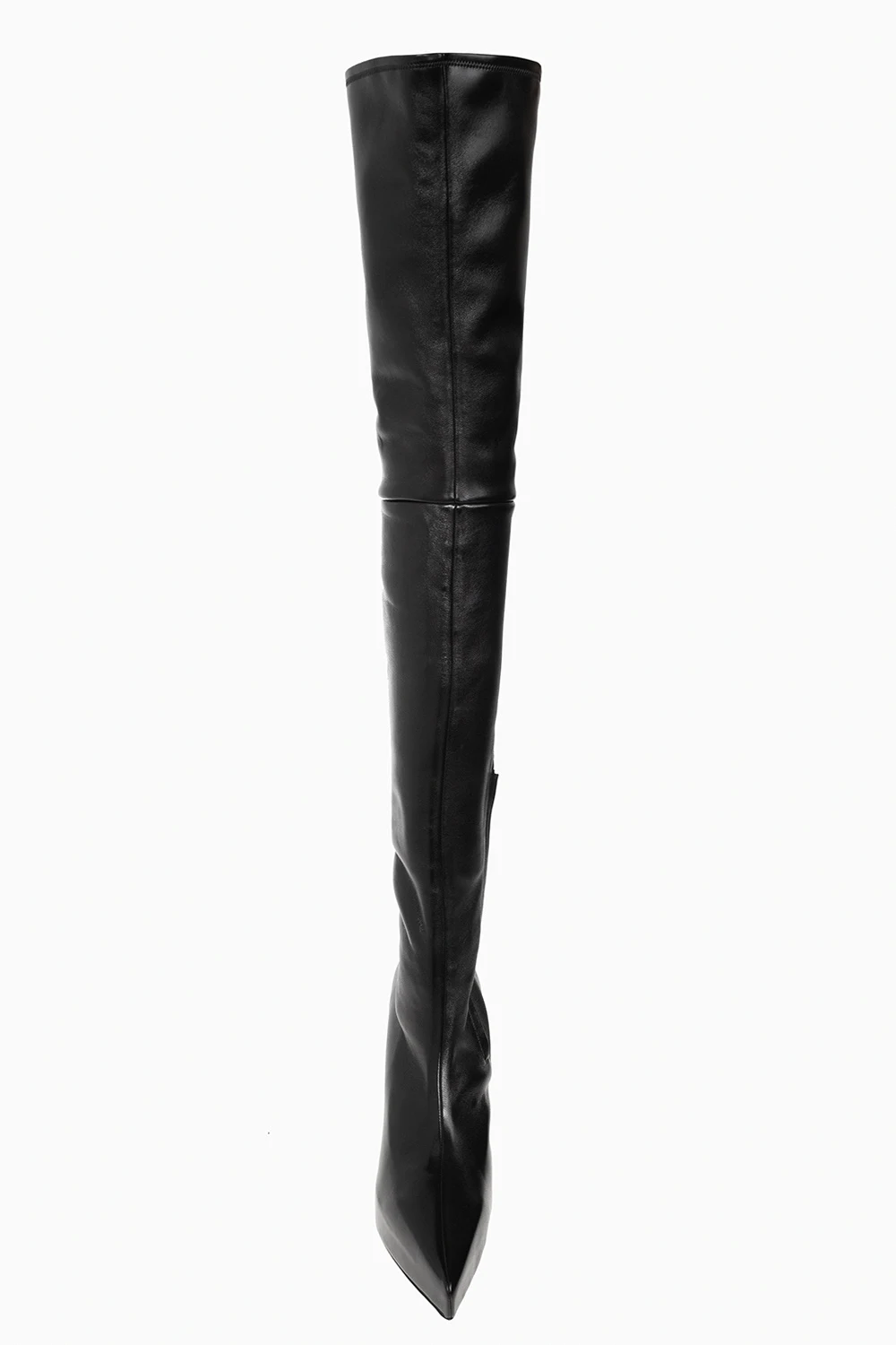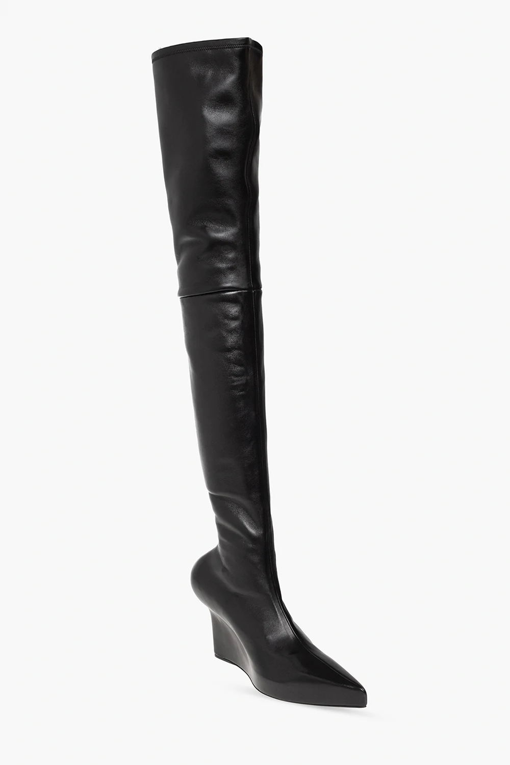 Czarne kozaki na koturnie Givenchy. Wykonane ze skóry jagnięcej. Zapinane z boku na zamek. Długa, dopasowana cholewka o długości za kolano. Zaokrąglona pięta, wydłużony nosek w szpic. Czarna, skórzana podeszwa.