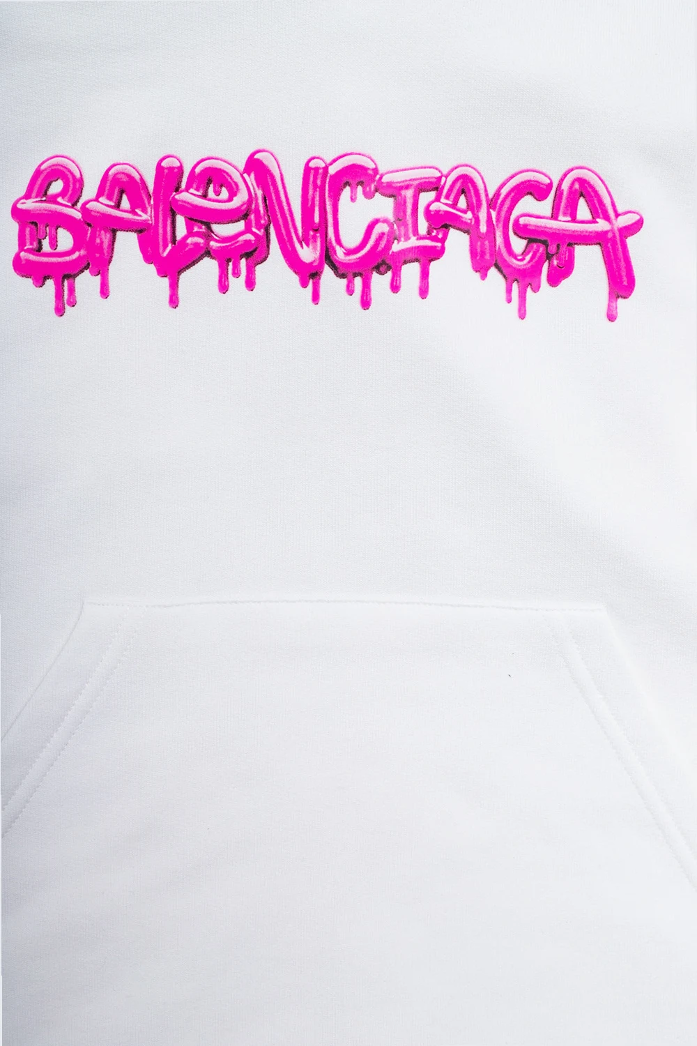 Biała, bawełniana bluza z kapturem Balenciaga Kids. Z przodu ozdobiona różowym nadrukiem z logo. Wsuwana kieszeń. Długie rękawy oraz dół wykończone ściągaczem.