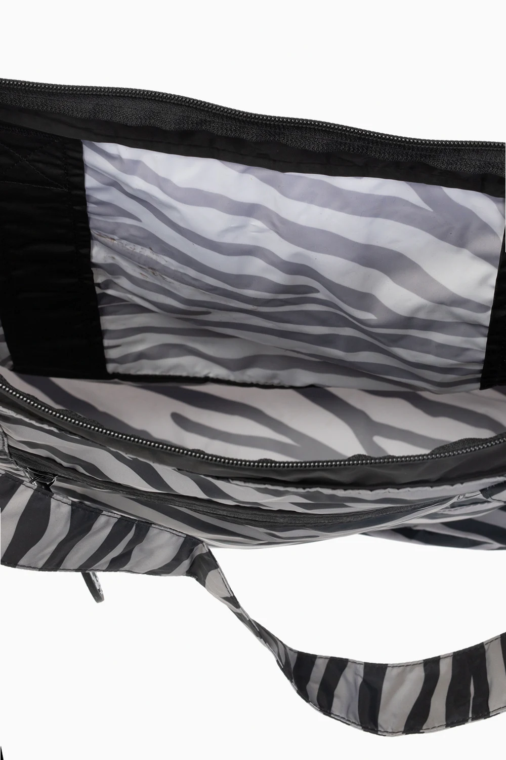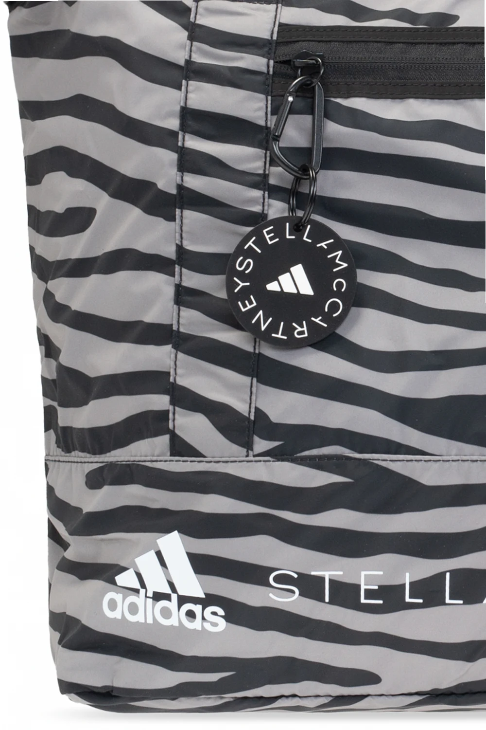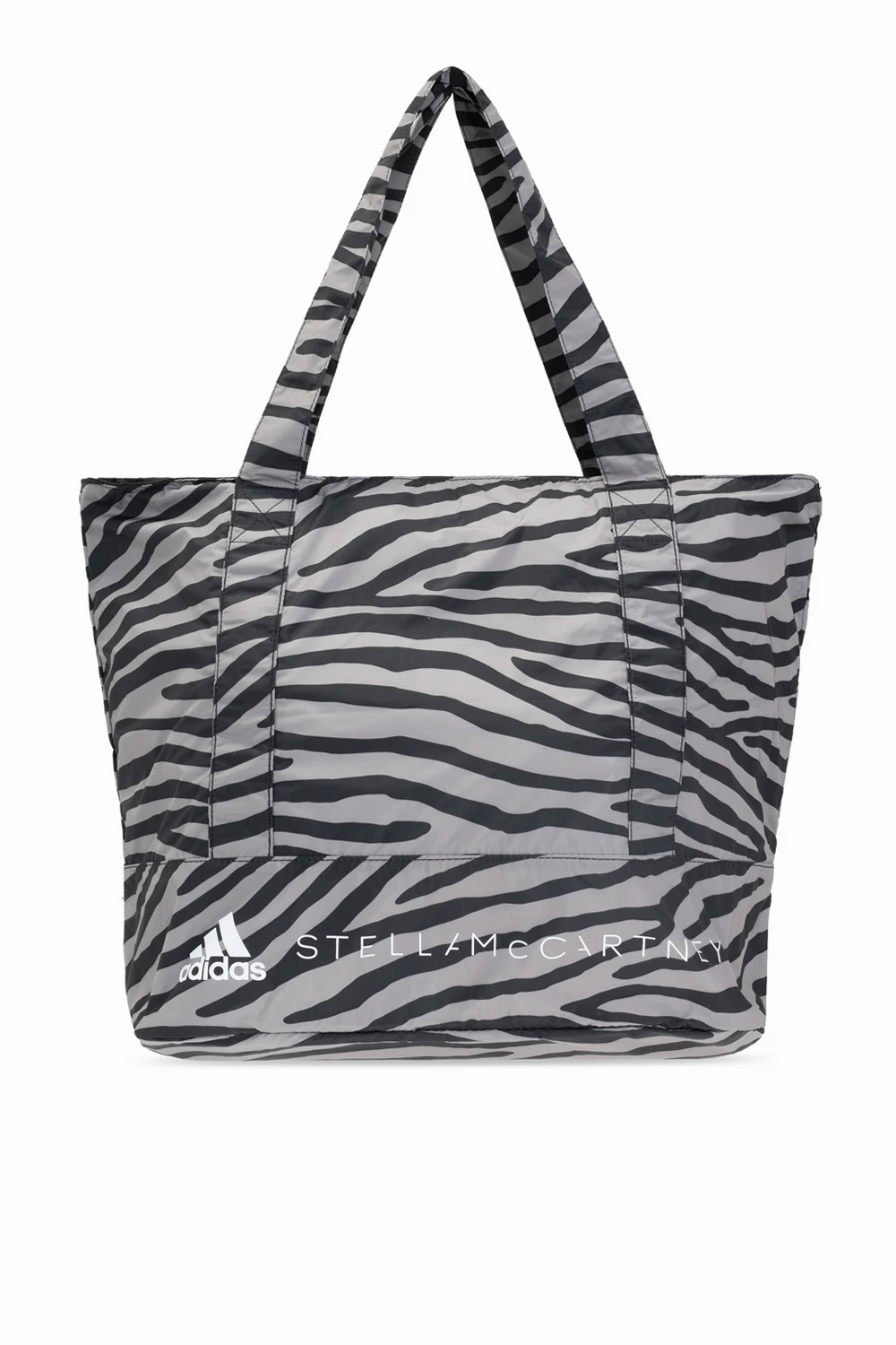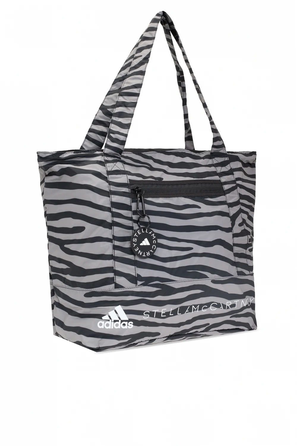 Czarno-szara torba na ramię ADIDAS by Stella McCartney. Zamykana na zamek. Ozdobiona motywem zwierzęcym oraz nadrukowanym białym logo. Z przodu kieszeń zapinana na zamek z karabińczykiem z logo. Dwa półokrągłe paski. Wewnątrz komora.