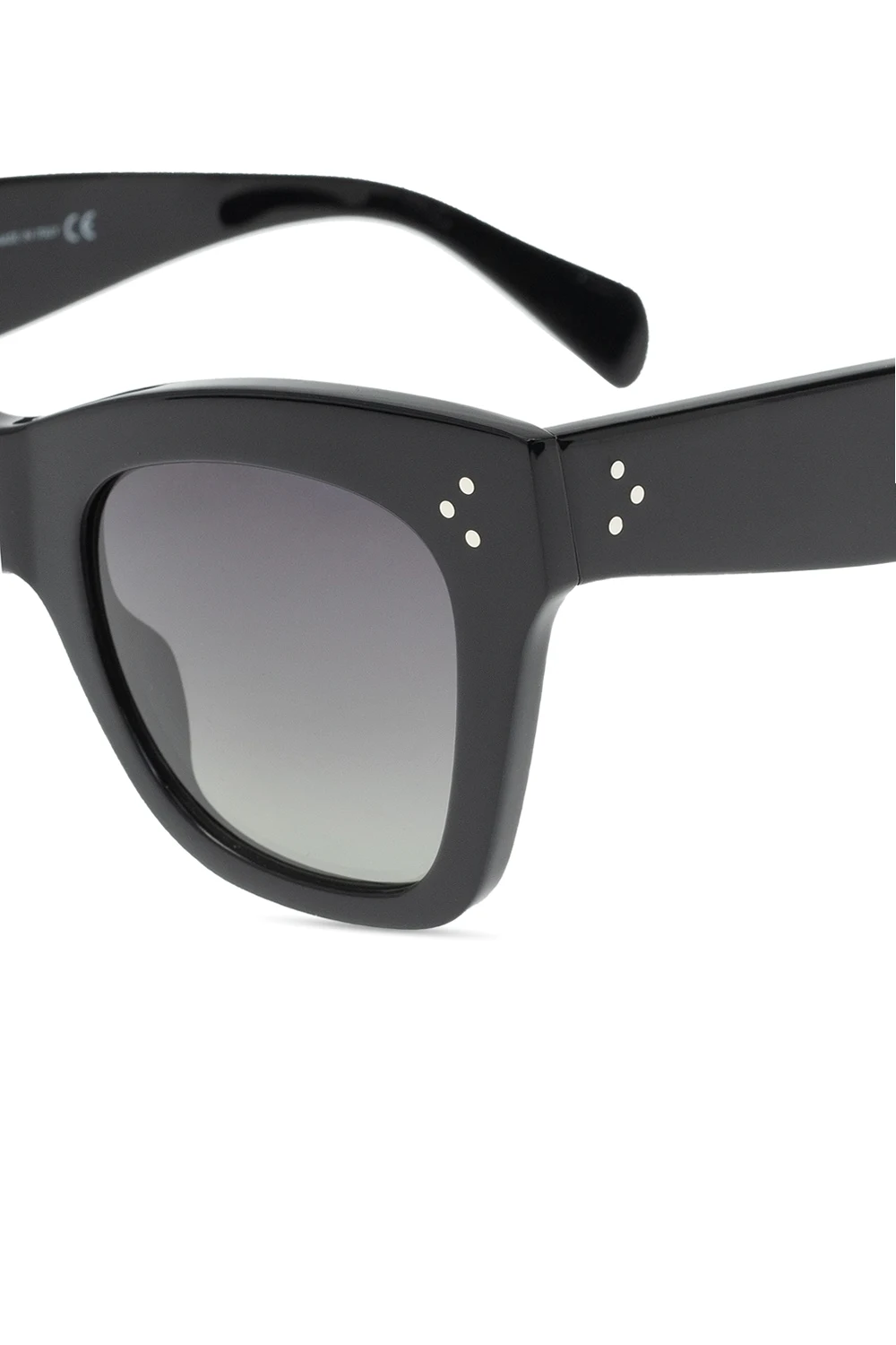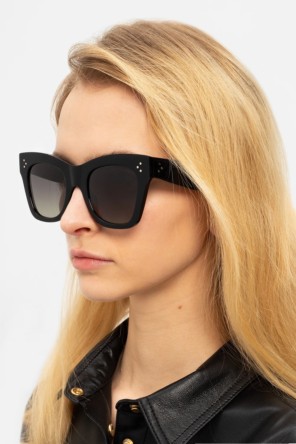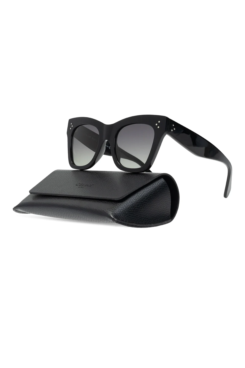 Czarne okulary przeciwsłoneczne Celine. Ozdobione dekoracyjnymi elementami w kolorze złotym. Certyfikowane, czarne soczewki UVA/UVB. Dołączone czarne etui.