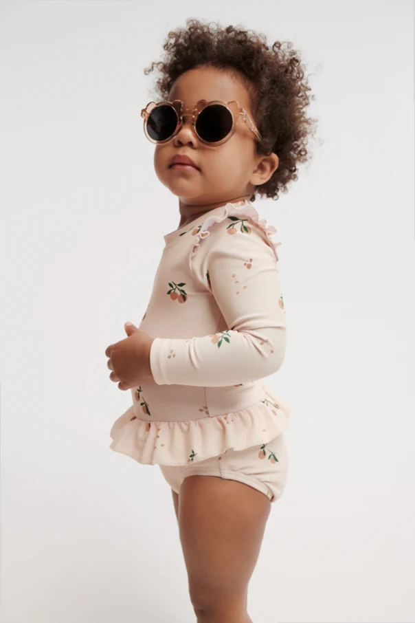 Jednolite, ciemne soczewki zapewniają skuteczną ochronę przed słońcem, gwarantując przy tym niezwykły komfort użytkowania. Dyskretne logo projektanta Liewood, umieszczone na zauszniku, subtelnie podkreśla unikatowość wyrobu i jego ekskluzywne pochodzenie. Minimalistyczny wzór i dbałość o detale czynią z tego modelu doskonały wybór na letni spacer czy rodzinny wyjazd.