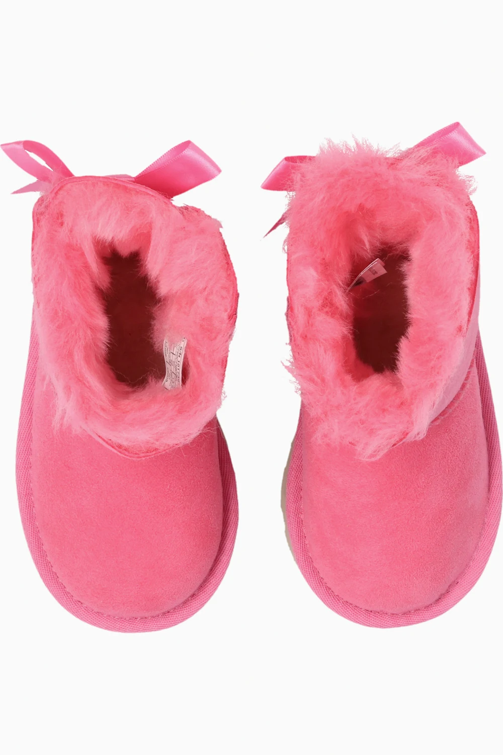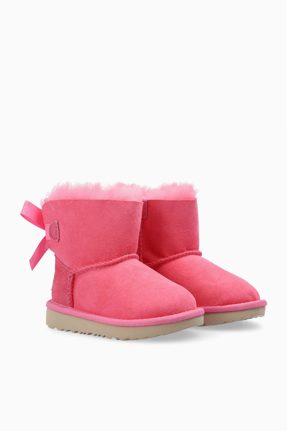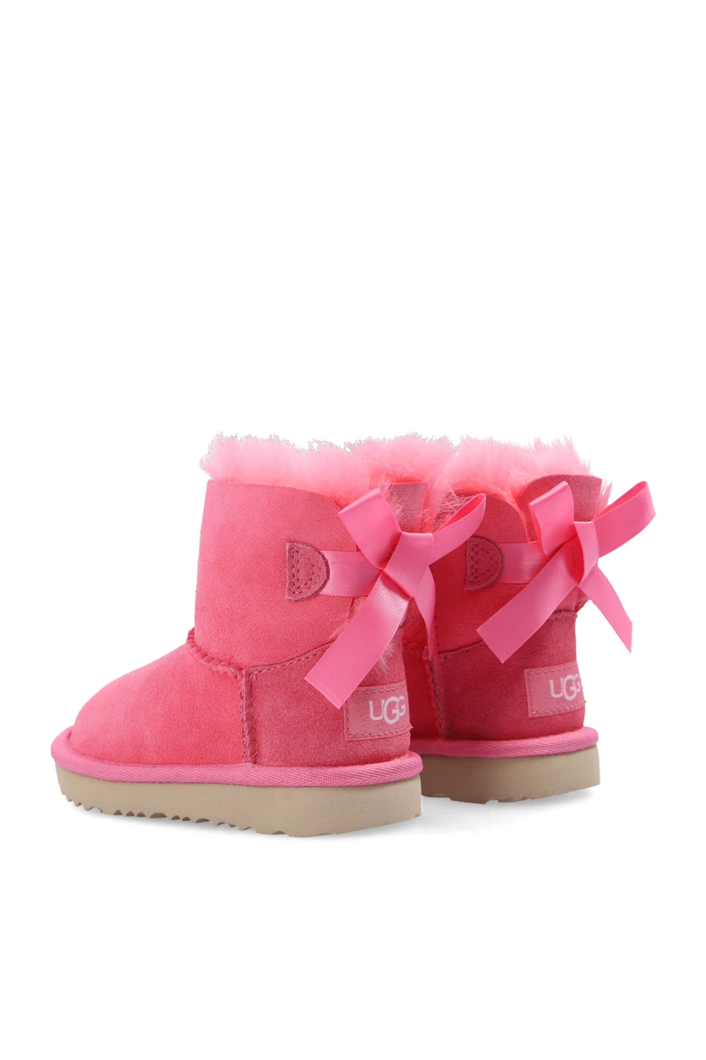 Różowe śniegowce, model ‘Mini Bailey Bow II’ UGG Kids. Wykonane ze skóry owczej. Z tyłu dekoracyjna kokarda oraz naszywka z logo. Ocieplane futrem z wyściółką z wełny UGGpure™. Beżowa, gumowa podeszwa.