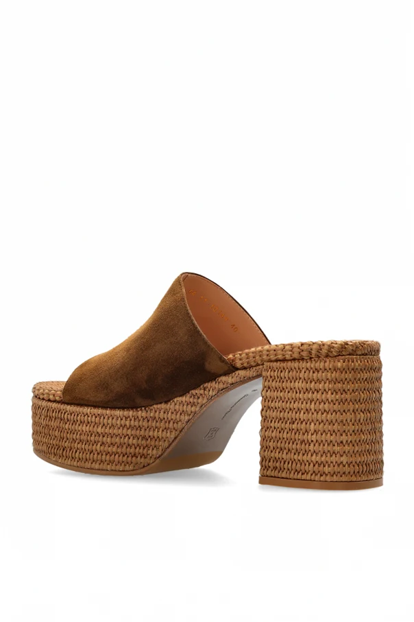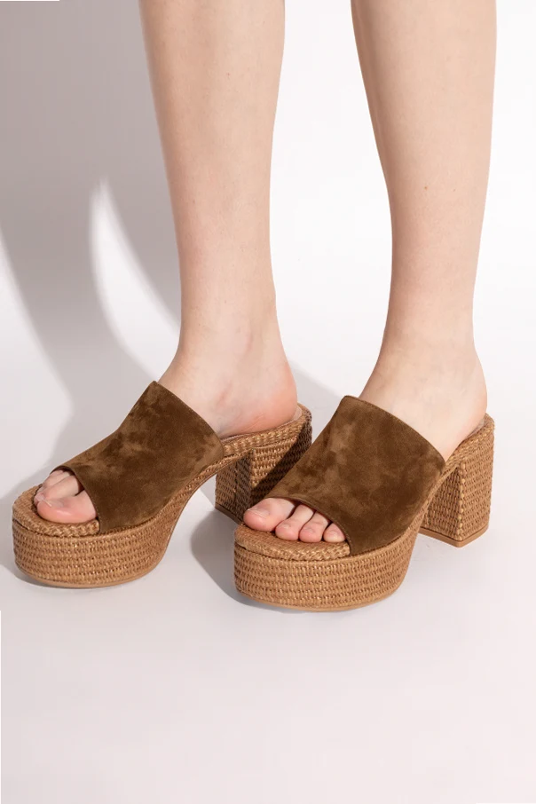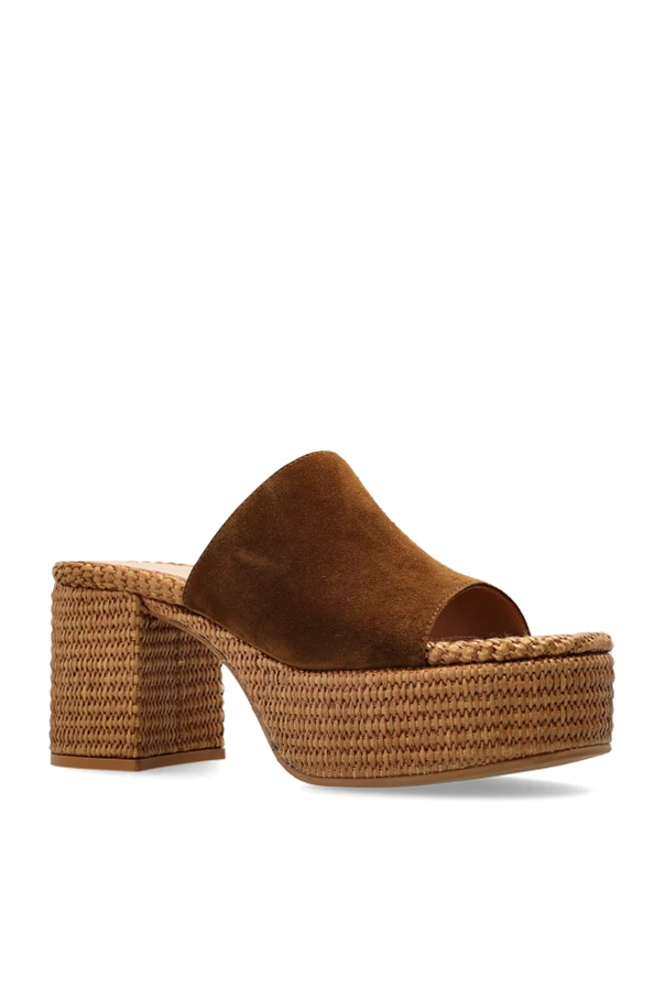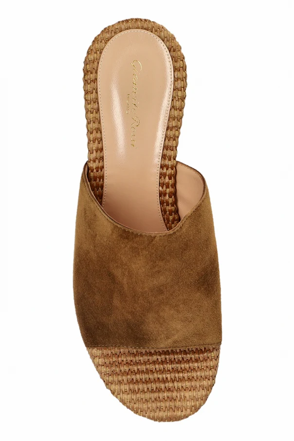 Klapki na platformie marki Gianvito Rossi to synonim nowoczesnej elegancji oraz ponadczasowej subtelności. Brązowy zamsz szerokiego paska doskonale komponuje się z efektowną, masywną platformą i szerokim obcasem typu klocek, oplecionymi materiałem imitującym plecionkę, przywodzącym na myśl rzemieślniczą precyzję. Delikatne przejście faktur oraz brak zbędnych zdobień podkreślają minimalistyczny, wyrafinowany charakter produktu.