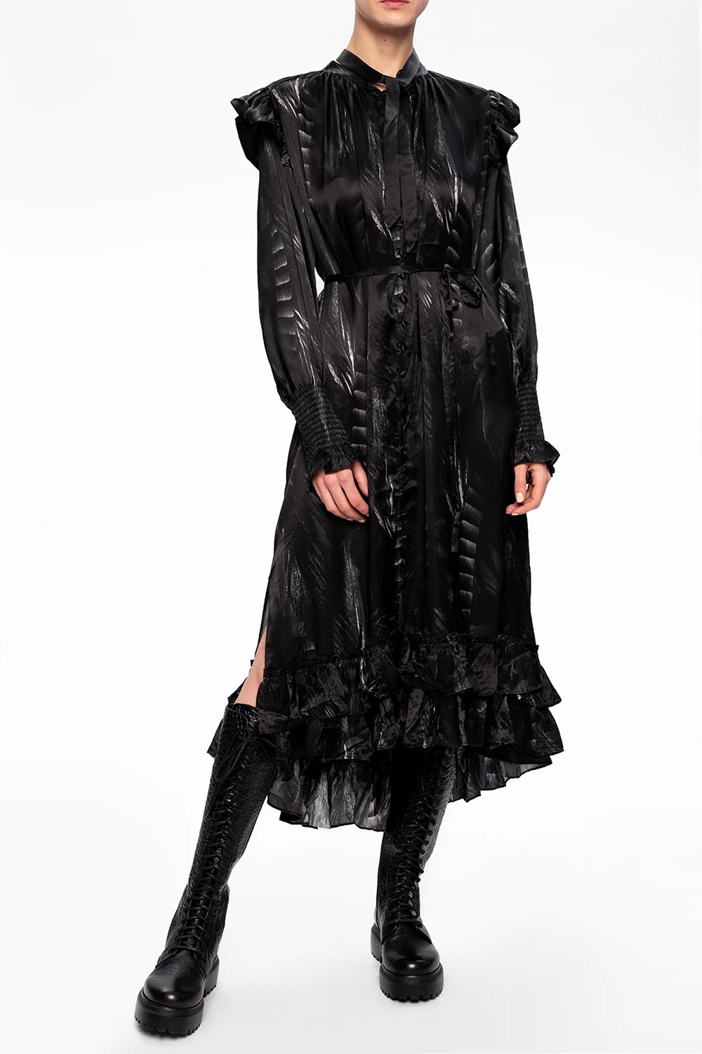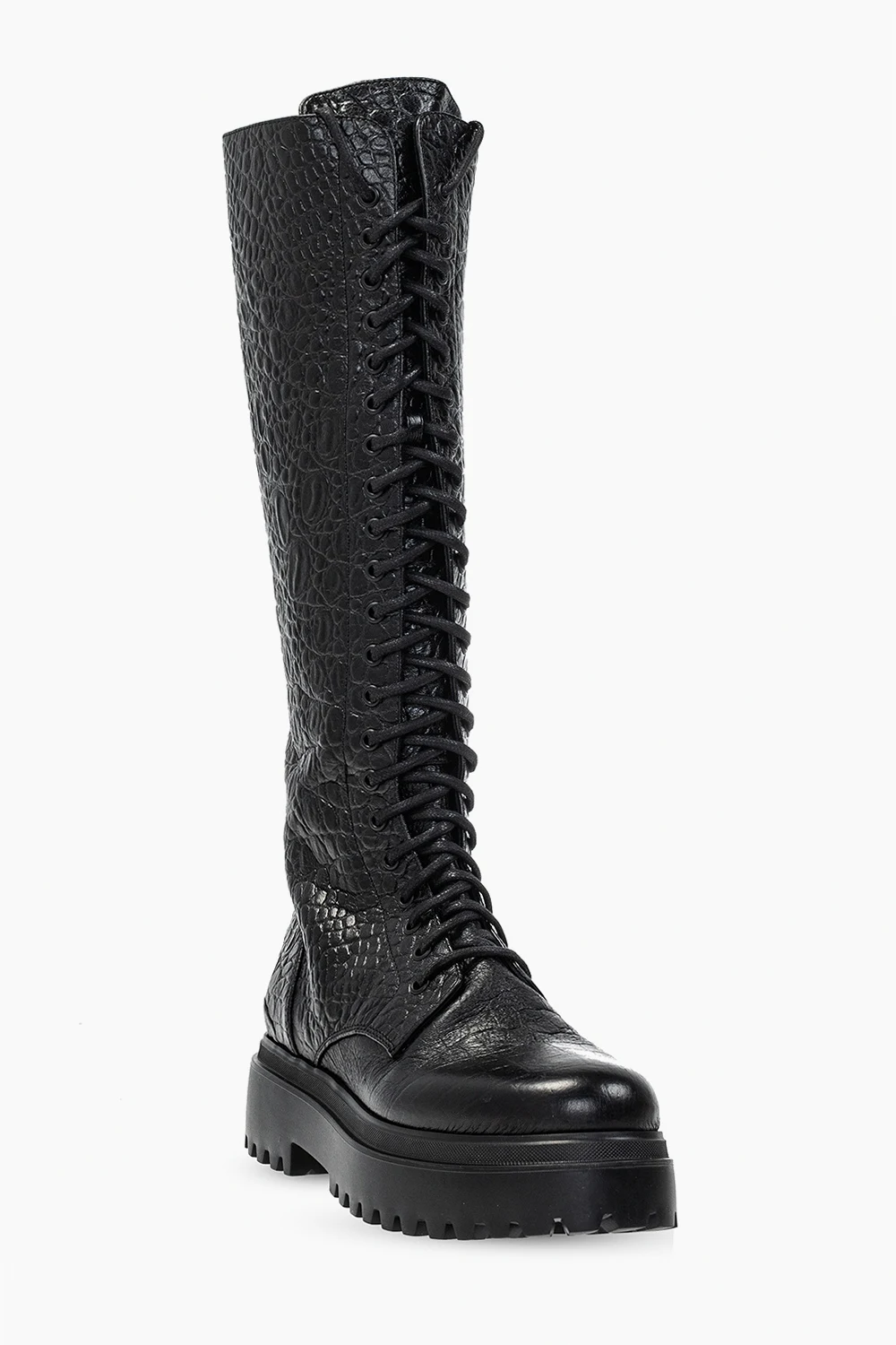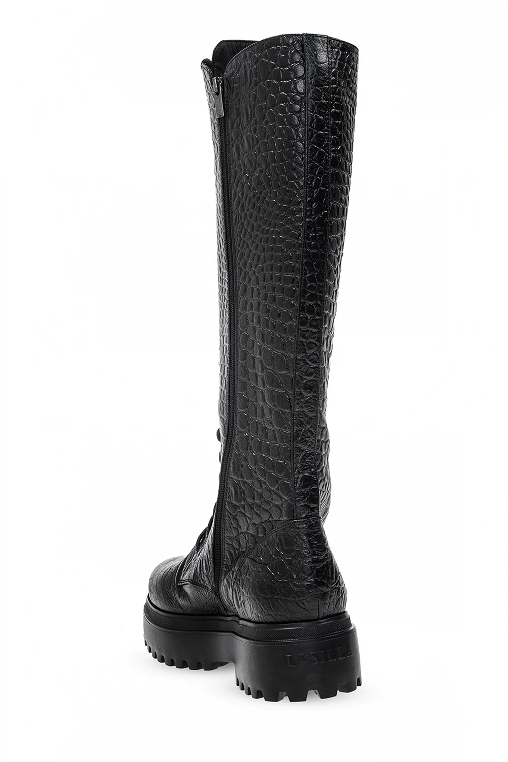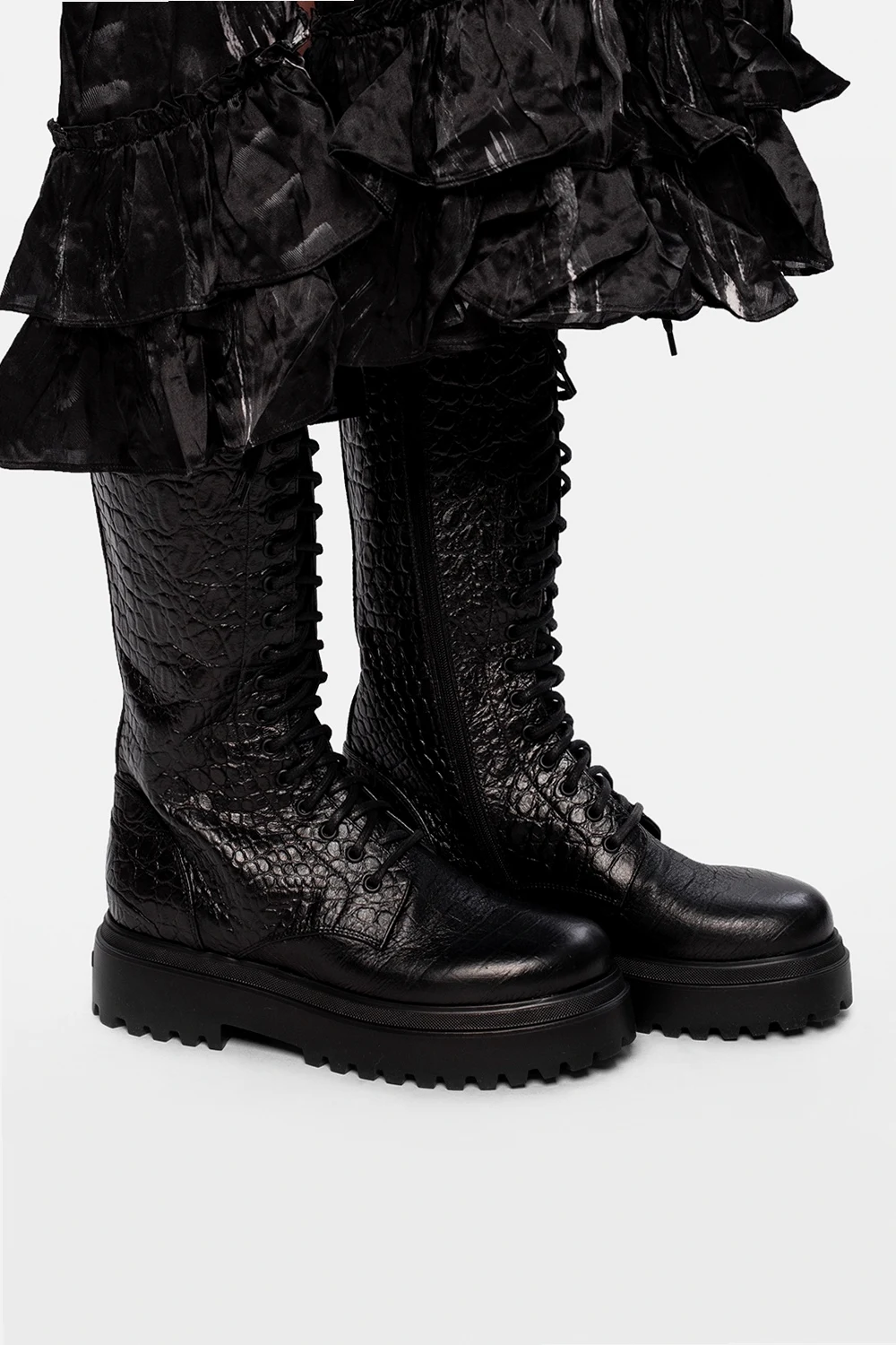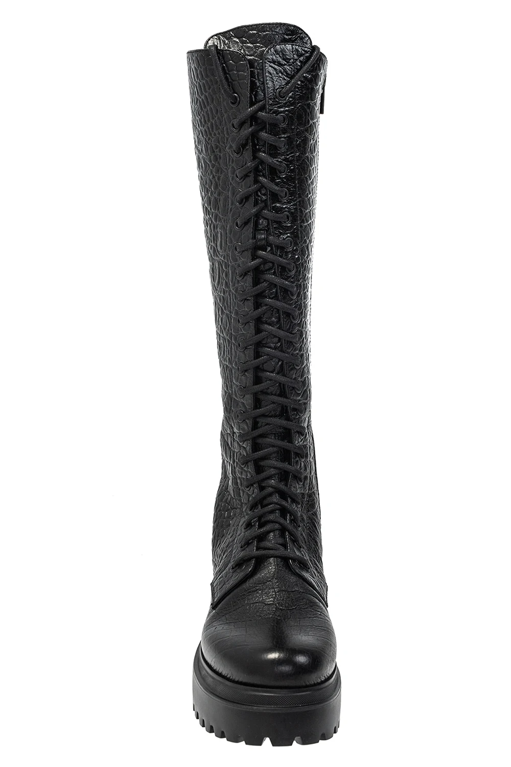 Czarne, sznurowane kozaki, model ‘Ranger’ Le Silla. Wykonane ze skóry o specjalnej fakturze imitującej skórę krokodyla. Z boku zapinane na zamek. Czarna, gumowa podeszwa.
