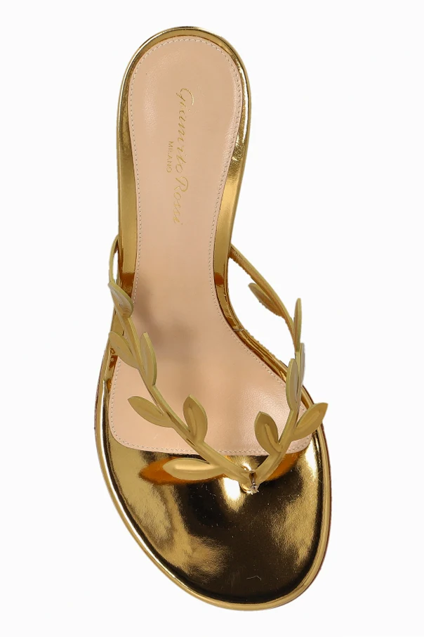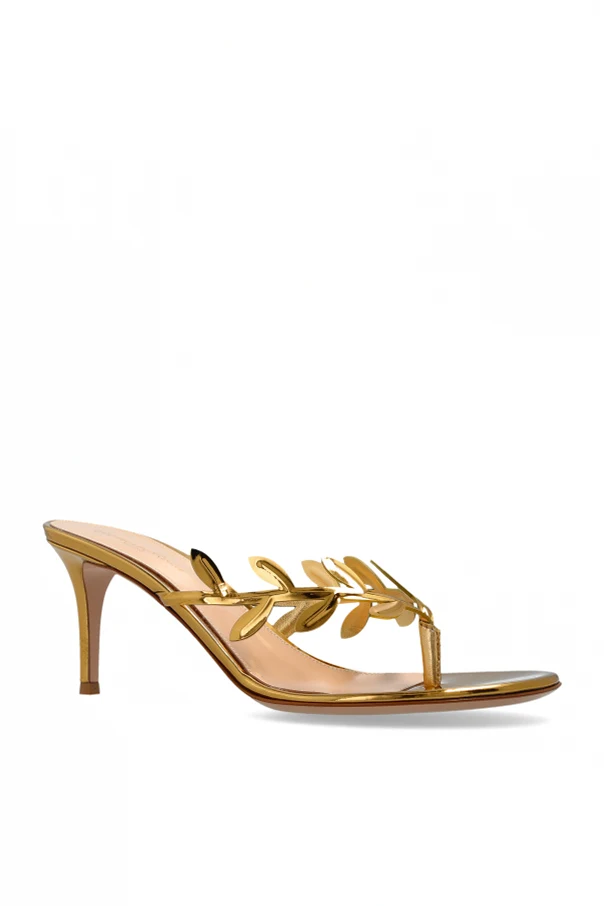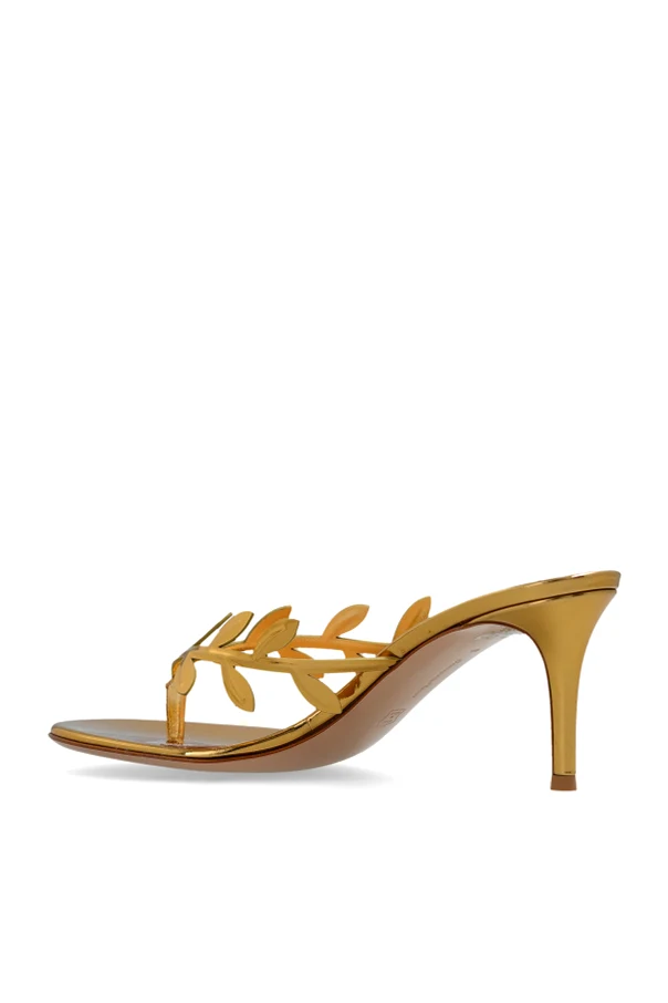 Klapki na obcasie marki Gianvito Rossi to kwintesencja wyrafinowanego stylu, dedykowana kobietom ceniącym luksus w najczystszej postaci. Model ten zachwyca złotym wykończeniem o lustrzanej, metalicznej fakturze, która subtelnie podkreśla wyrafinowanie każdej stylizacji.