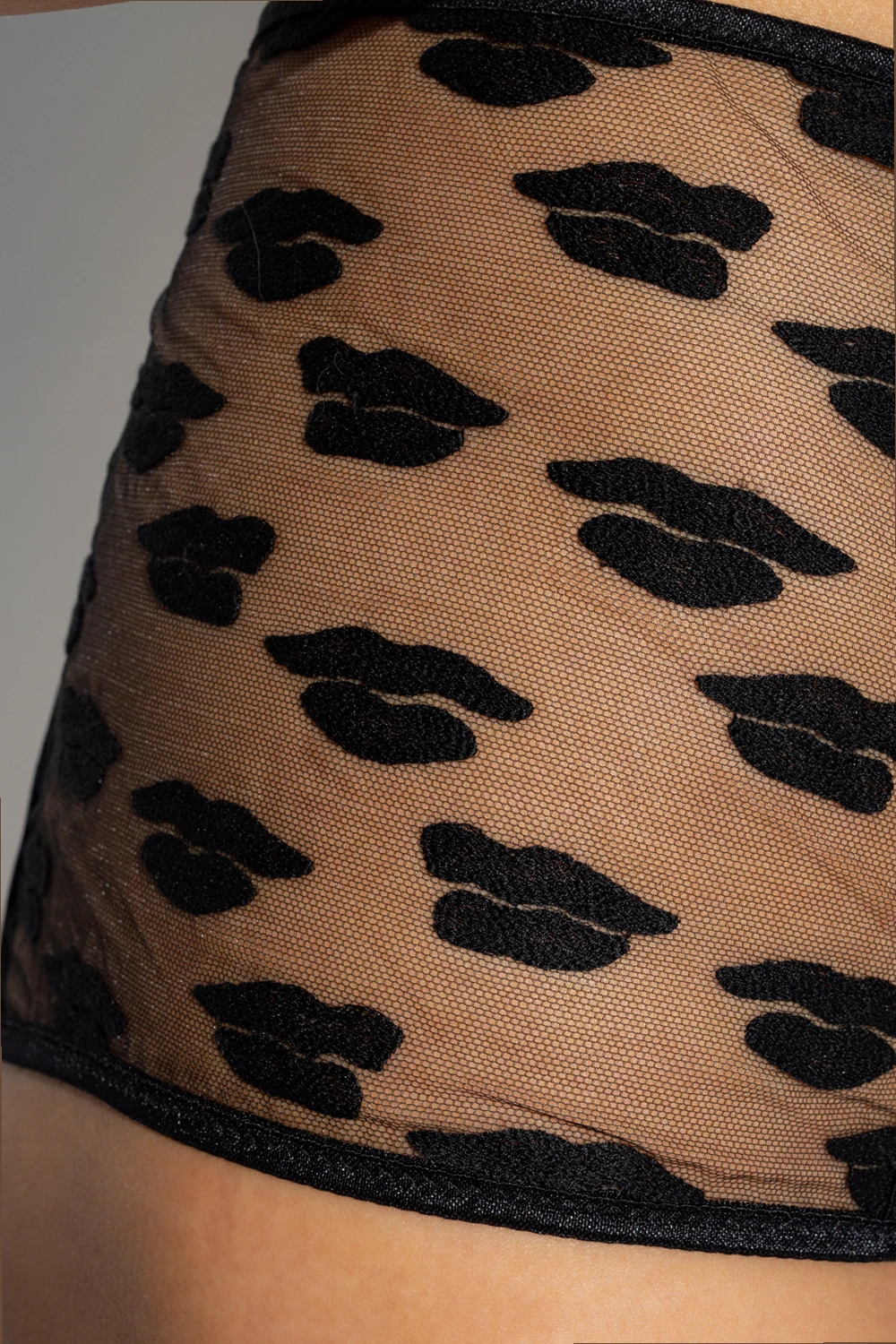 Czarny komplet bielizny: biustonosz i figi Fendi. Wykonany z koronki oraz tiulu. Ozdobiony wyszytym motywem ust oraz wzorem nawiązującym do twórczości ilustratora mody Antonio Lopeza. Trójkątny biustonosz ze skrzyżowanymi cienkimi ramiączkami z możliwością regulacji długości. Ozdobiony z przodu aplikacją ‘Fendi O’Lock’ w kolorze złotym. Figi z wysokim stanem.