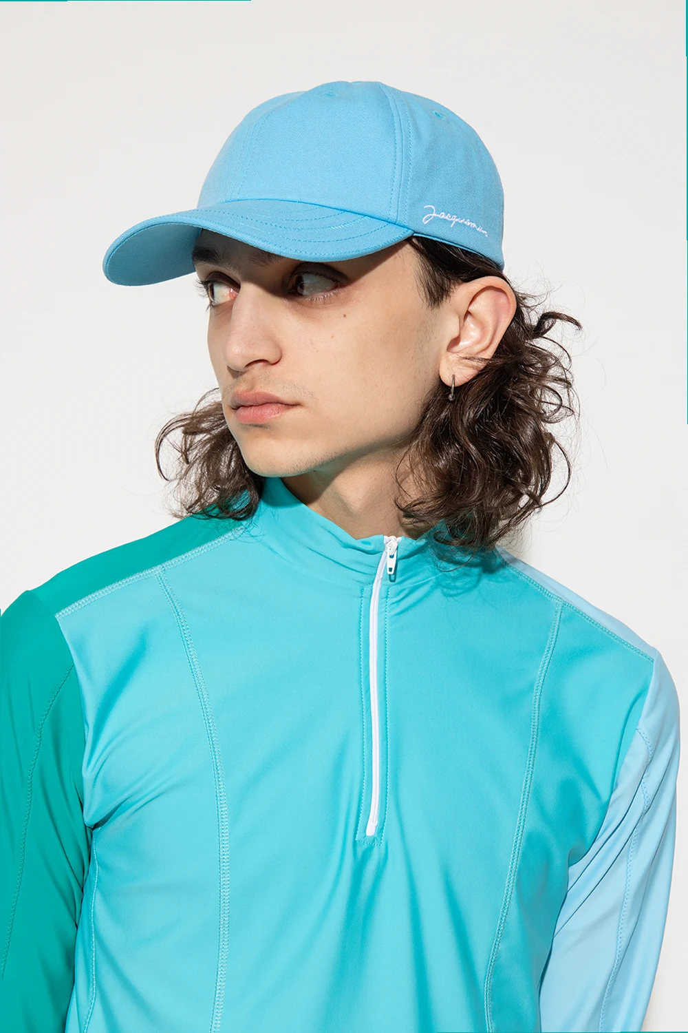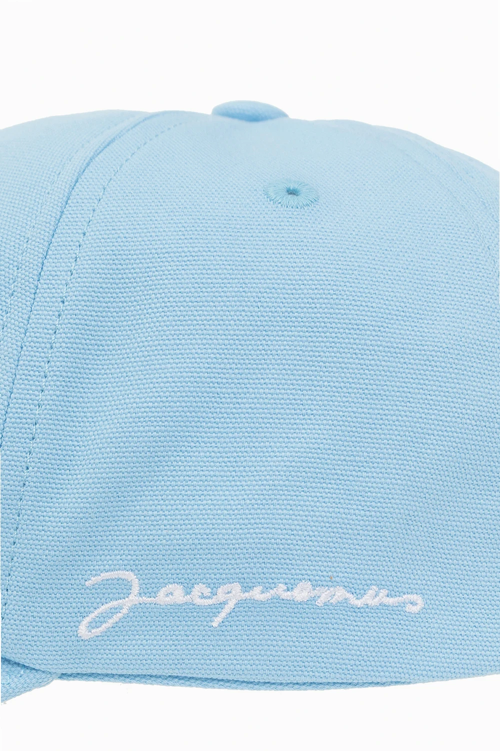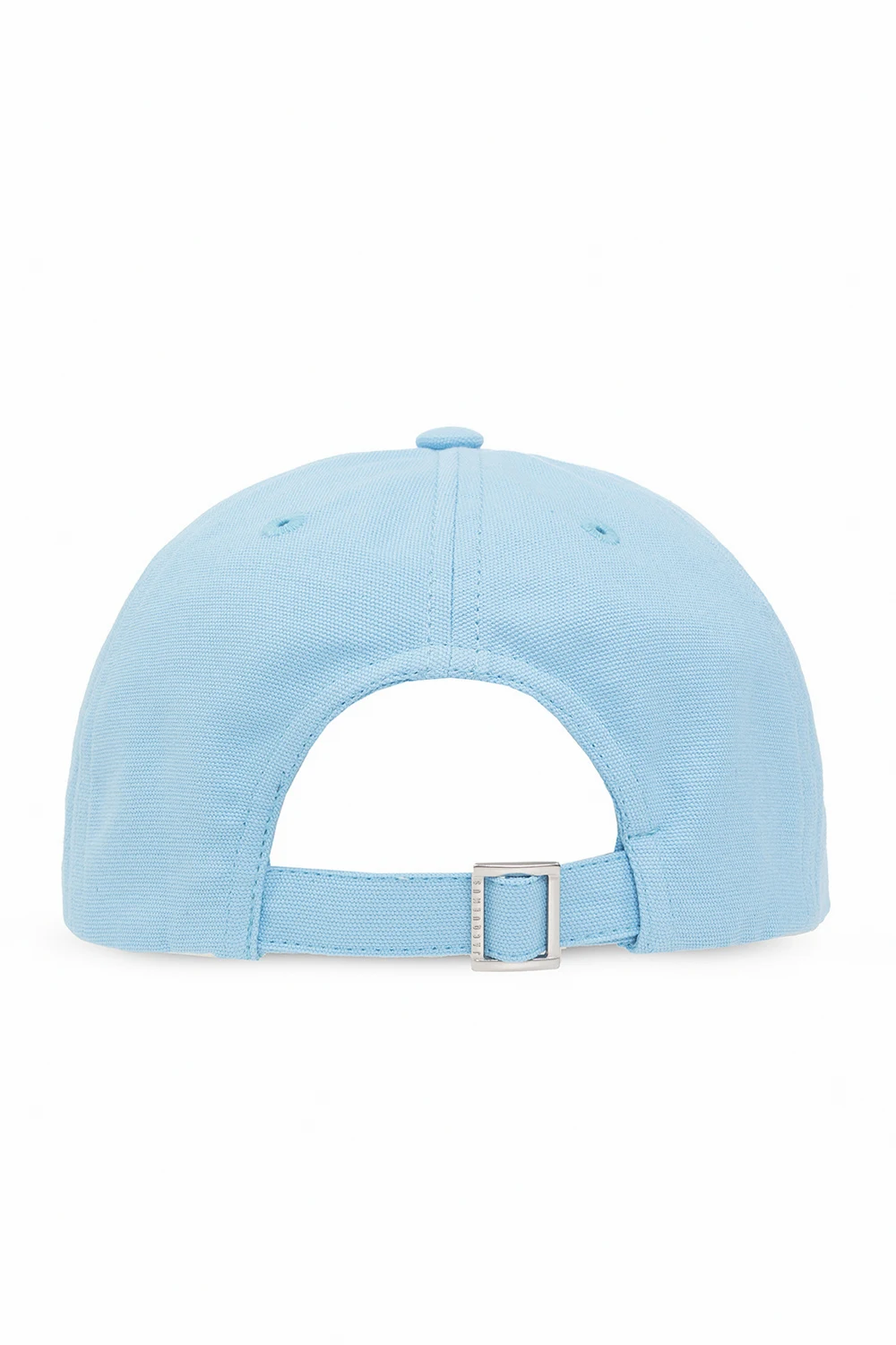Niebieska czapka z daszkiem Jacquemus. Wykonana z bawełnianego płótna. Z tyłu regulowane zapięcie z metalową klamrą. Z boku wyszyte logo w kolorze białym.