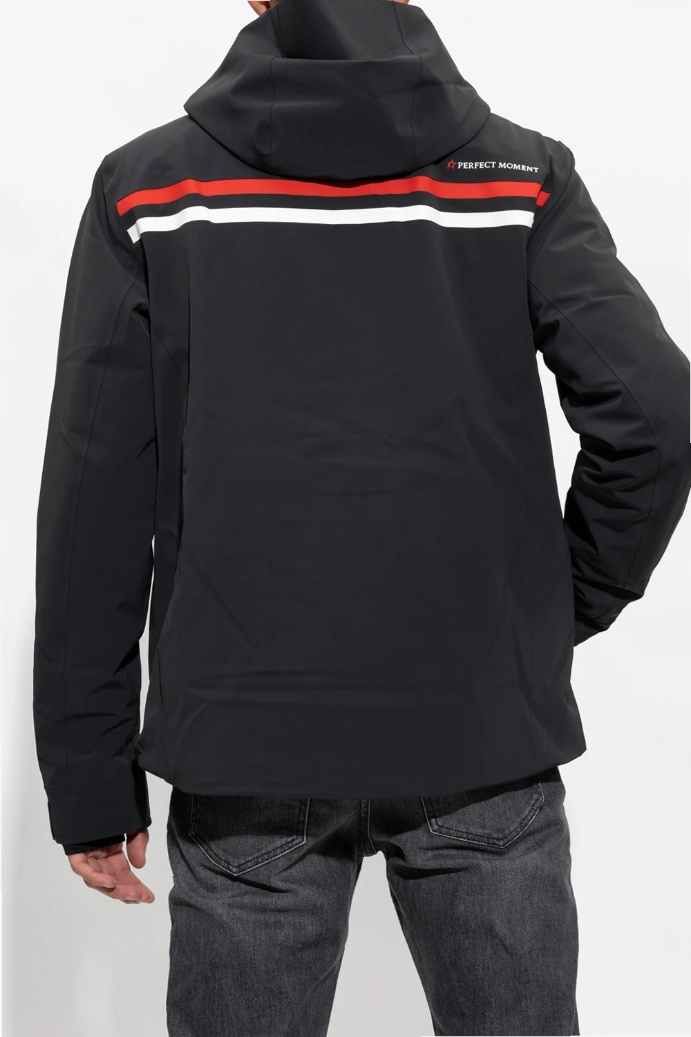 Czarna kurtka narciarska, model ‘Boreal’ Perfect Moment. Zapinana na dwubiegunowy zamek i zatrzaski. Czerwono-białe wstawki. Ozdobiona logo. Odpinany kaptur ściągany trokami. Z przodu dwie kieszenie zapinane na zamek. Długie rękawy zakończone ściągaczem z wycięciem na kciuk. Wewnętrzna kieszeń na gogle narciarskie.