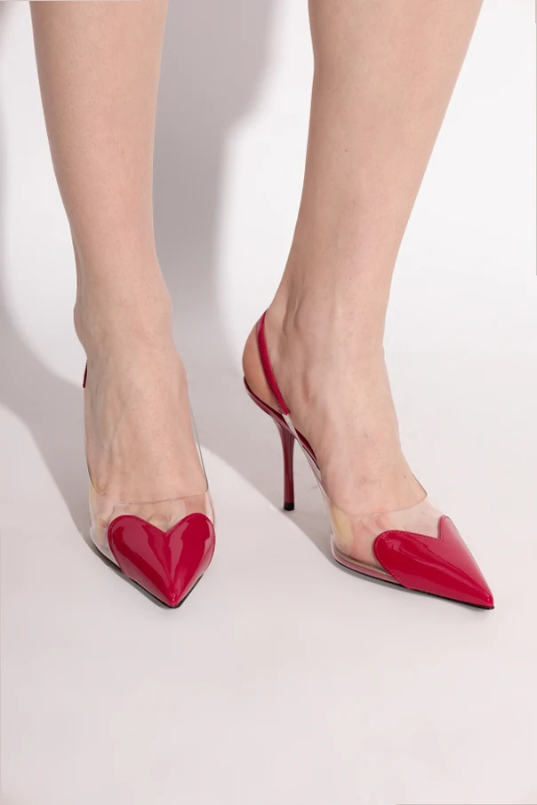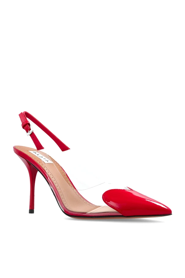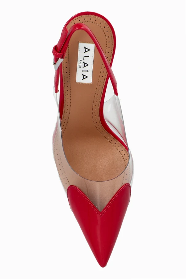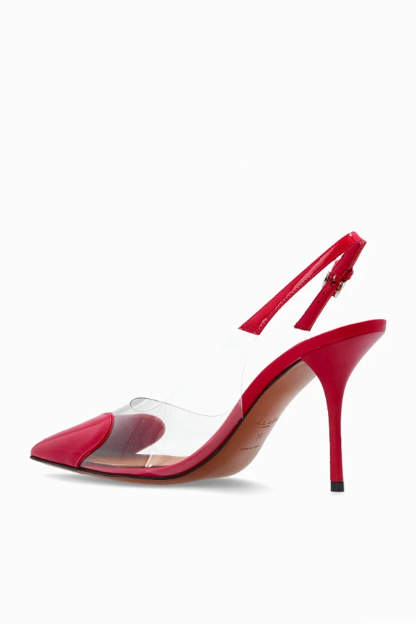 Intensywnie czerwony przód z błyszczącej lakierowanej skóry subtelnie kontrastuje z przezroczystymi bokami z tworzywa PVC, delikatnie eksponując linię stopy. Regulowany pasek na piętę ze srebrną sprzączką zapewnia doskonałe dopasowanie, podkreślając luksusowy charakter modelu. Na wkładce widnieje charakterystyczna metka z nazwą „ALAÏA PARIS”, będąca świadectwem najwyższej jakości wykonania.