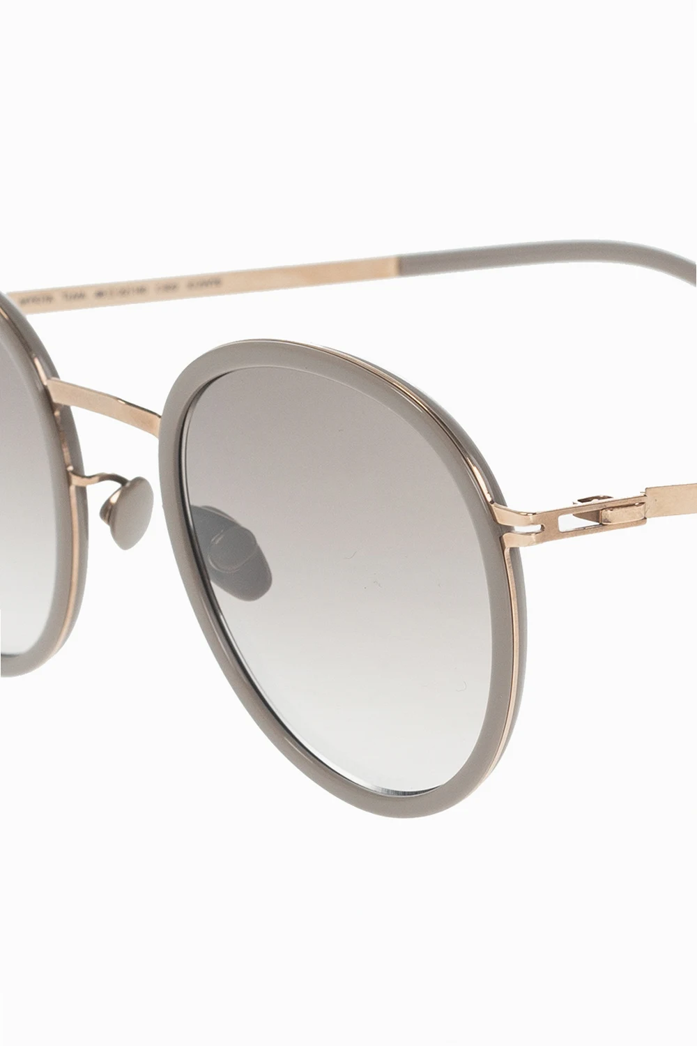 Beżowoszare okulary przeciwsłoneczne, model ‘Tuva’ Mykita. Wykonane ze stali nierdzewnej i acetatu. Wykończone stalowymi zausznikami w kolorze złota z opatentowanym zawiasem spiralnym. Końcówki zauszników i noski w kolorze beżowoszarym. Przyciemniane, gradientowe, certyfikowane soczewki 100% UVA i UVB w kolorze szarym. Wykonane ręcznie w Berlinie.