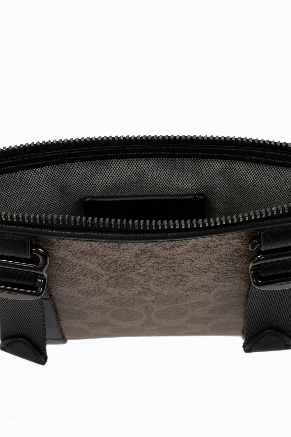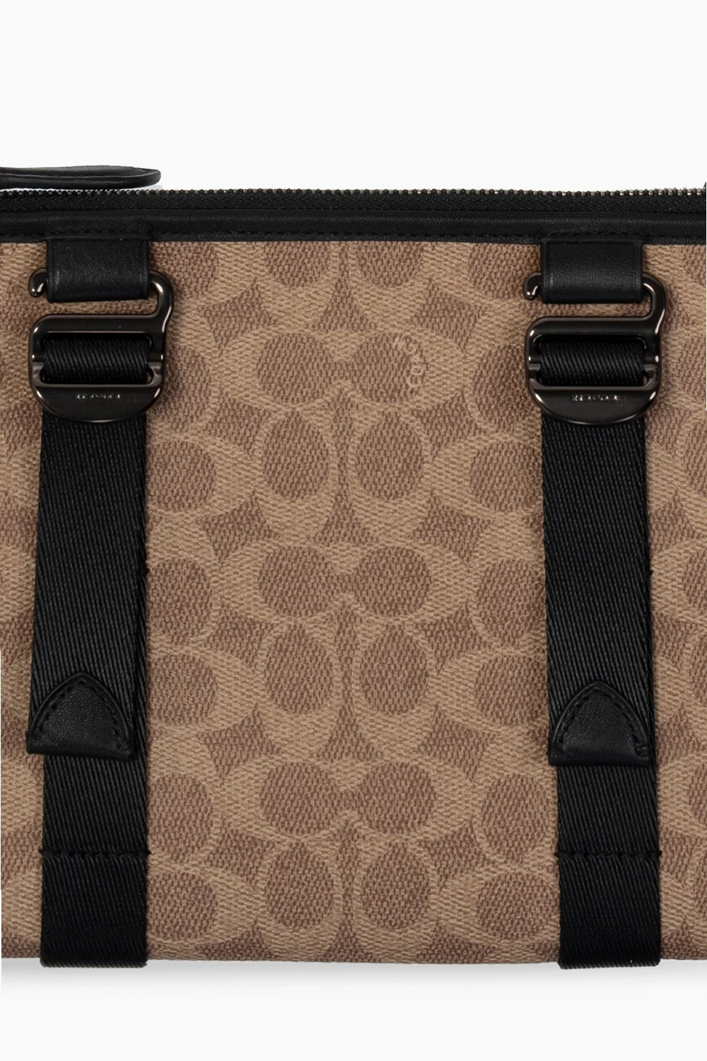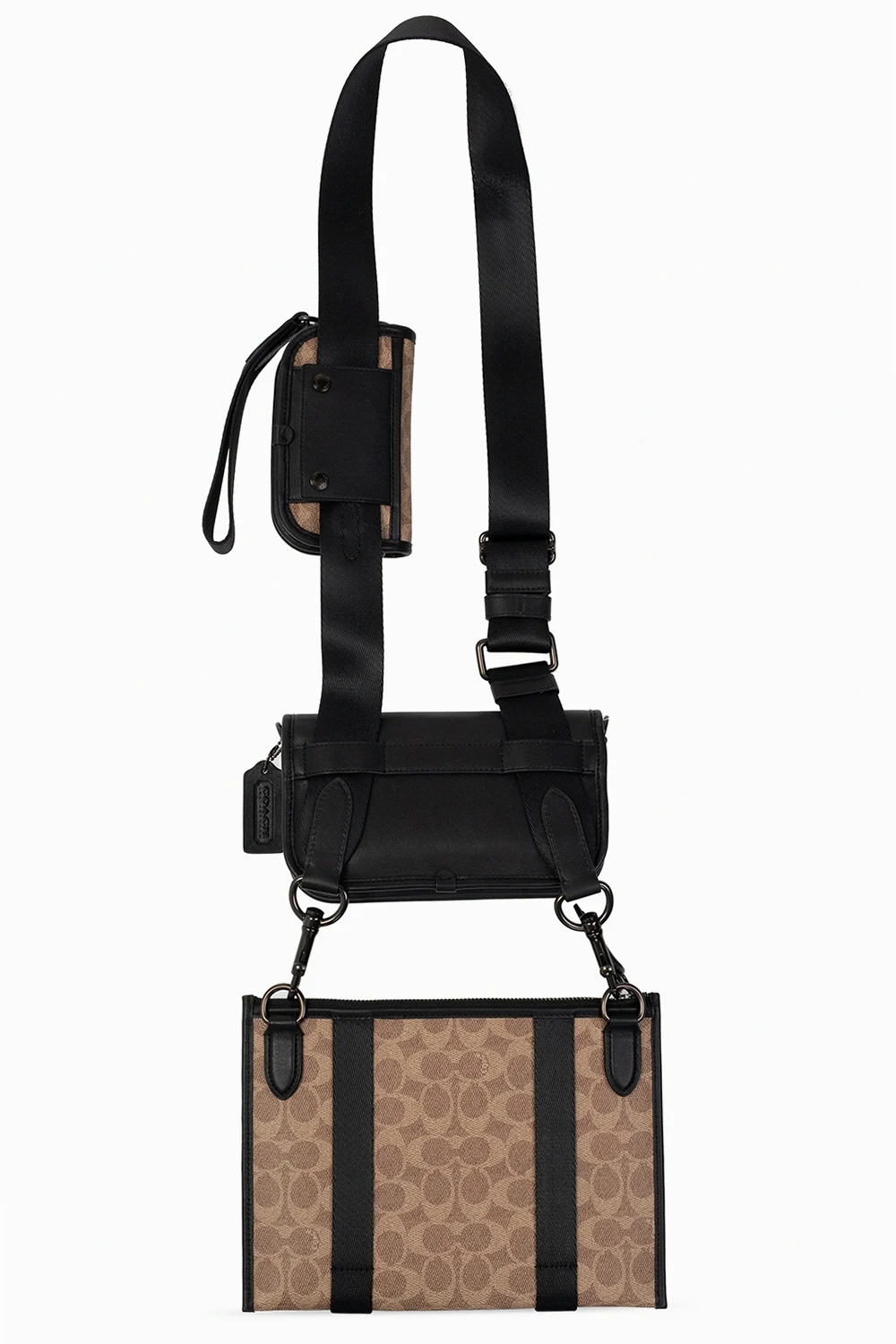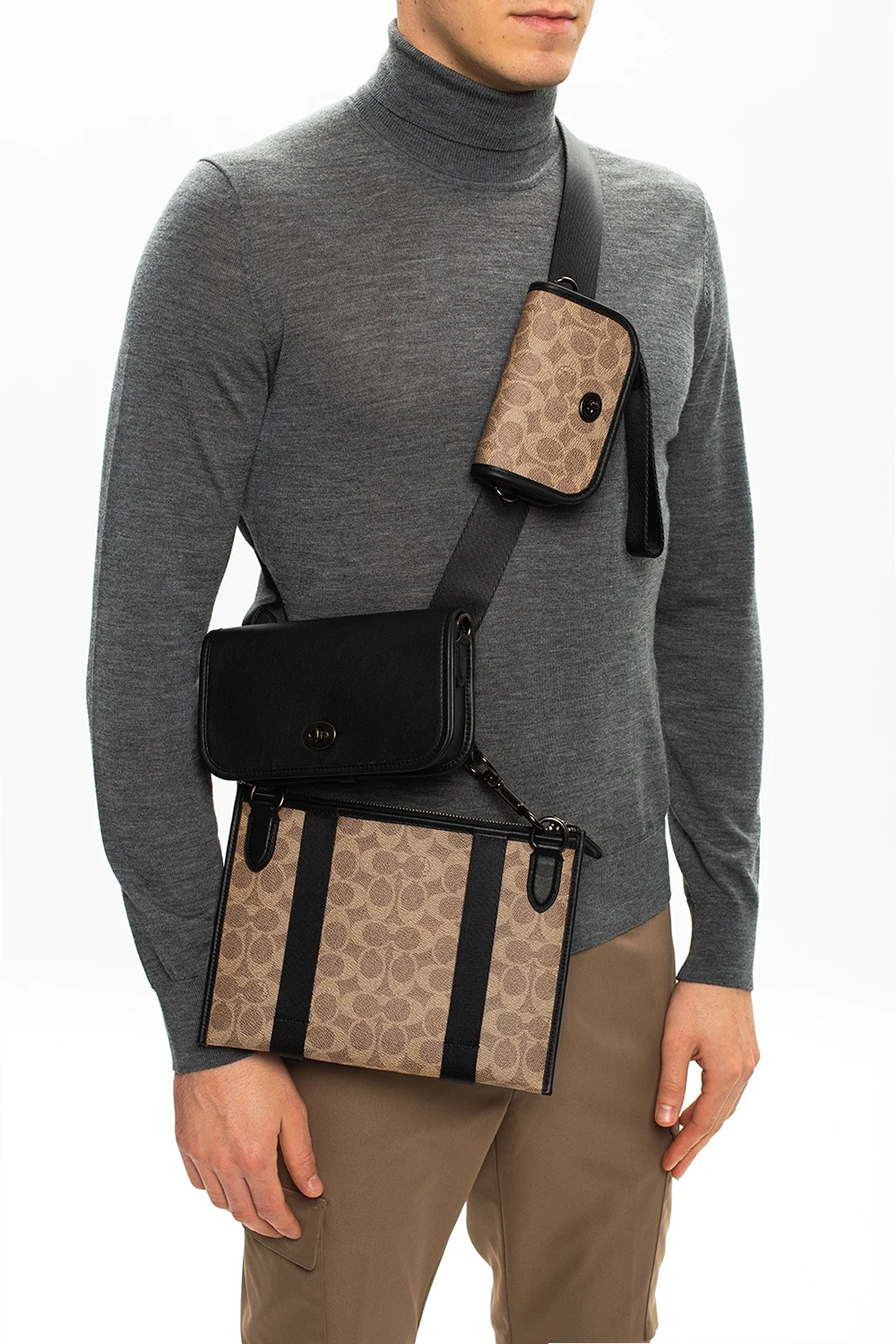 Zestaw trzech saszetek na pas Coach. Największa w kolorze beżowo-kremowo-czarnym. Zamykana na zamek. Wykonana z płótna. Wykończona skórą. Ozdobiona wzorem z logo. Wewnątrz komora. Średnia w kolorze czarnym. Wykonana ze skóry. Zamykana na dekoracyjne zapięcie. Wewnątrz komora oraz kieszeń zamykana na zamek. Najmniejsza w kolorze beżowo-kremowo-czarnym. Zamykana na dekoracyjne zapięcie. Ozdobiona nadrukowanym logo. Wewnątrz komora. Dołączony pasek na nadgarstek.