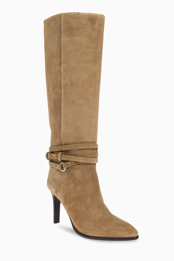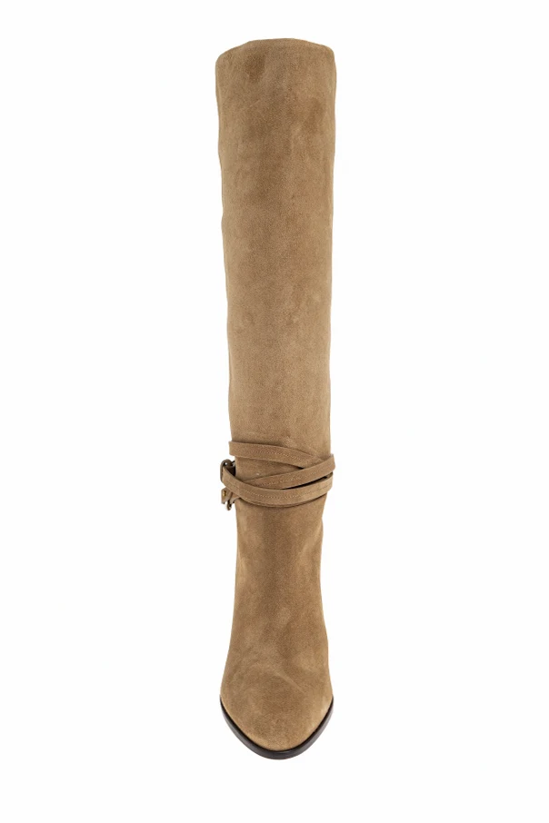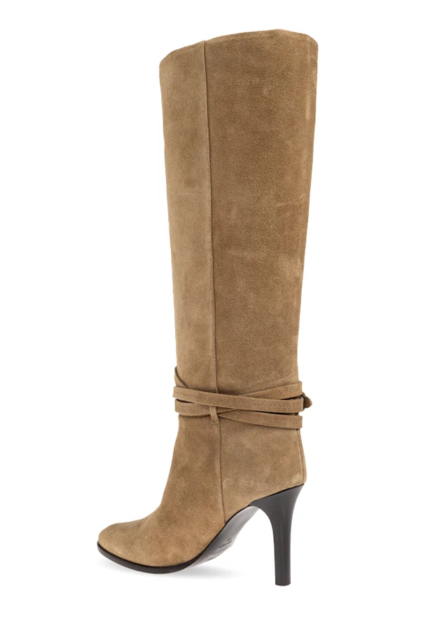 Zamszowe kozaki ‘Ieva Twin’ projektu Isabel Marant to uosobienie wysublimowanej elegancji. Model wyróżnia się klasyczną długością do kolana oraz smukłą, wydłużoną linią cholewki, która subtelnie podkreśla kobiecą sylwetkę. Beżowy odcień zamszu urzeka szlachetnością, a miękka, jednolita faktura sprawia, że buty zachwycają w dotyku.