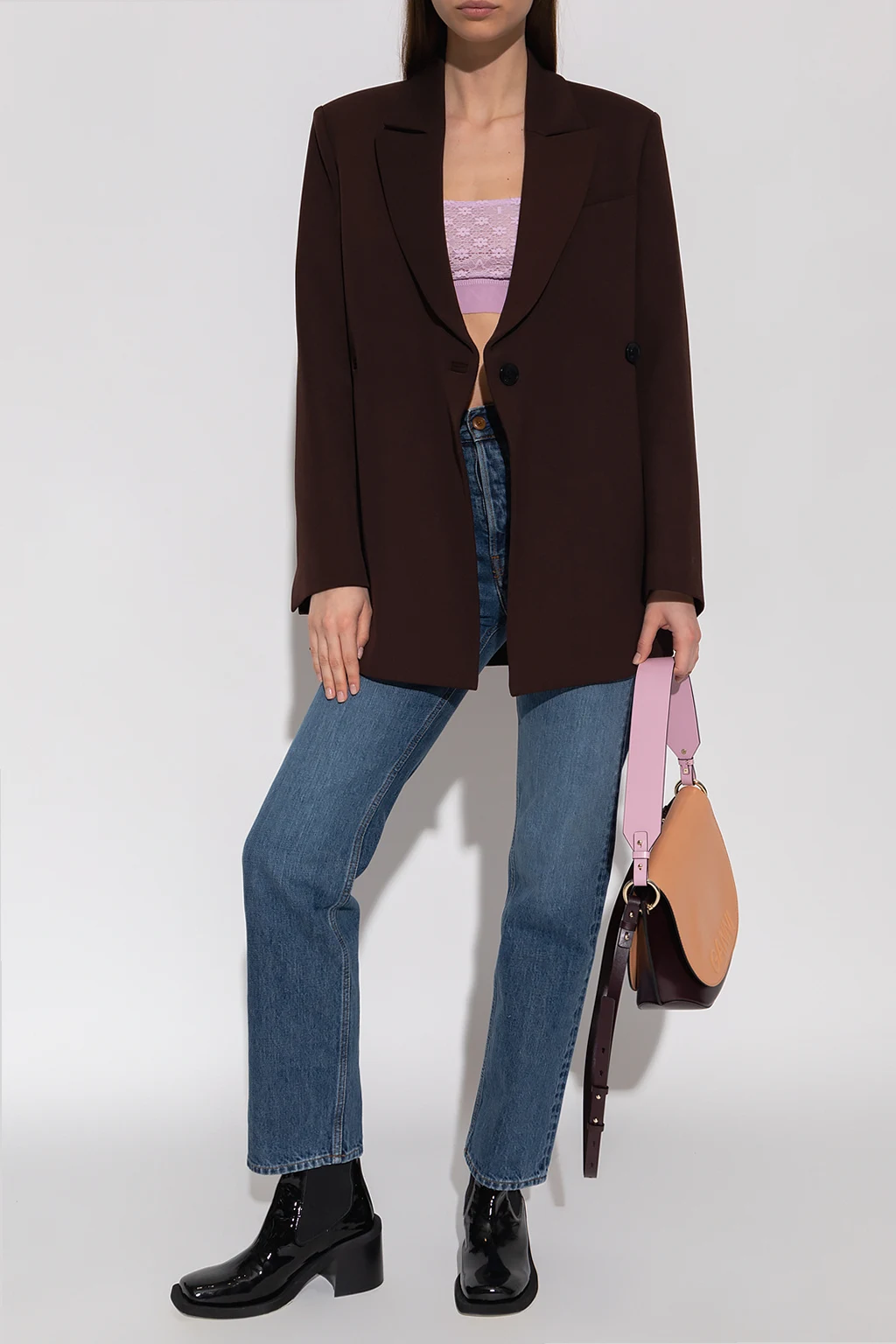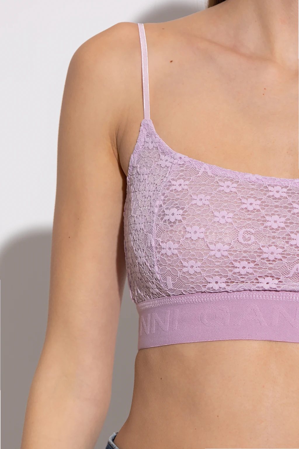 Jasnofioletowy biustonosz Ganni. Wykonany z koronki z motywem kwiatowym oraz logo. Usztywniany fiszbinami. Cienkie ramiączka z możliwością regulacji długości. Dół wykończony elastyczną gumą z wyszytym logo.