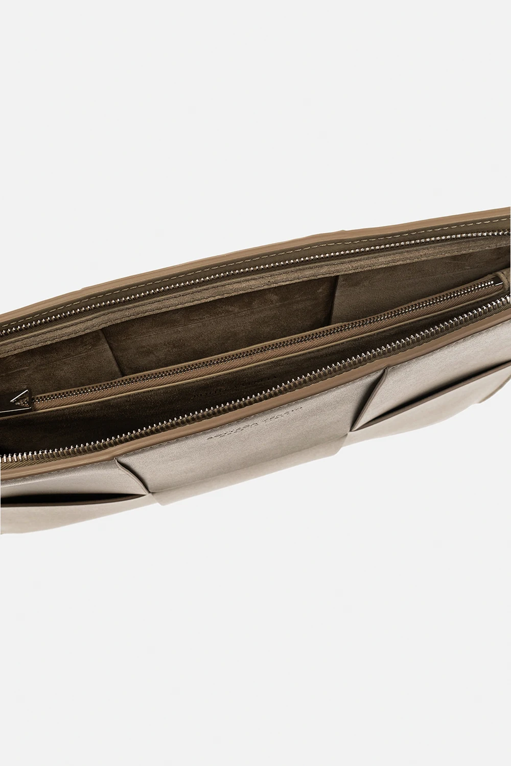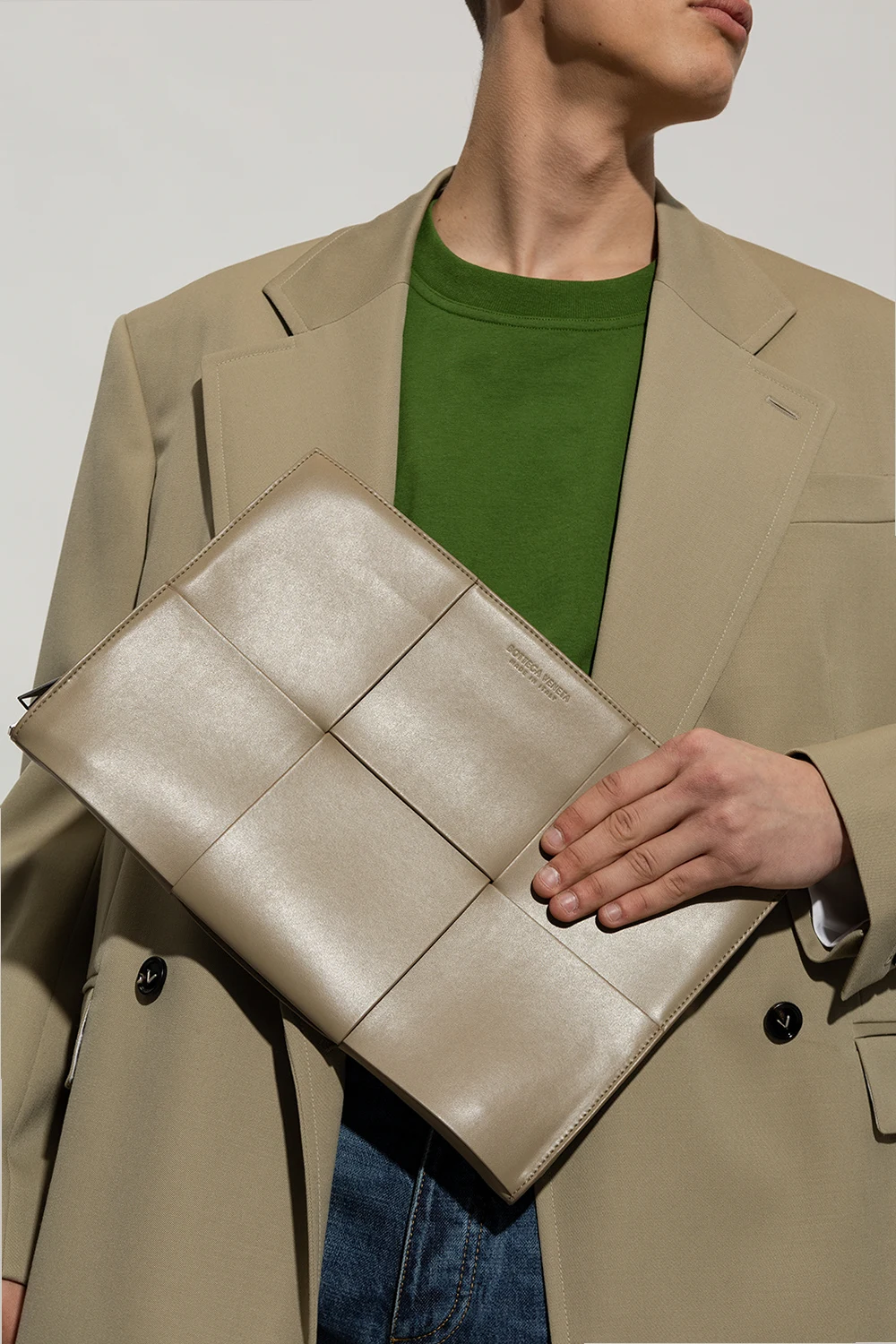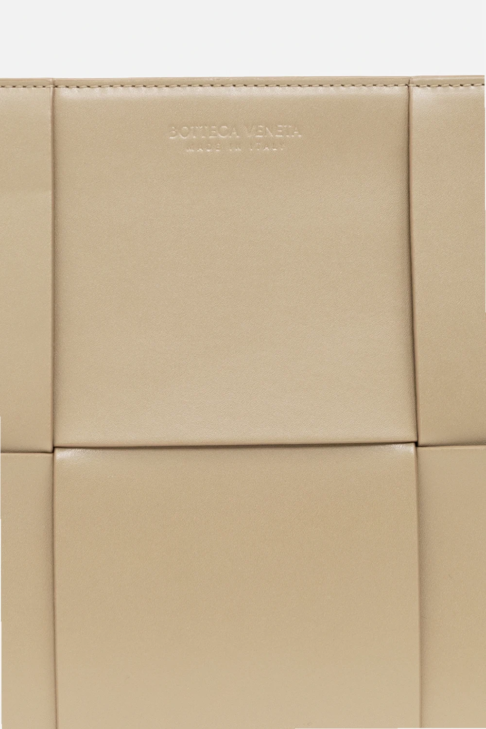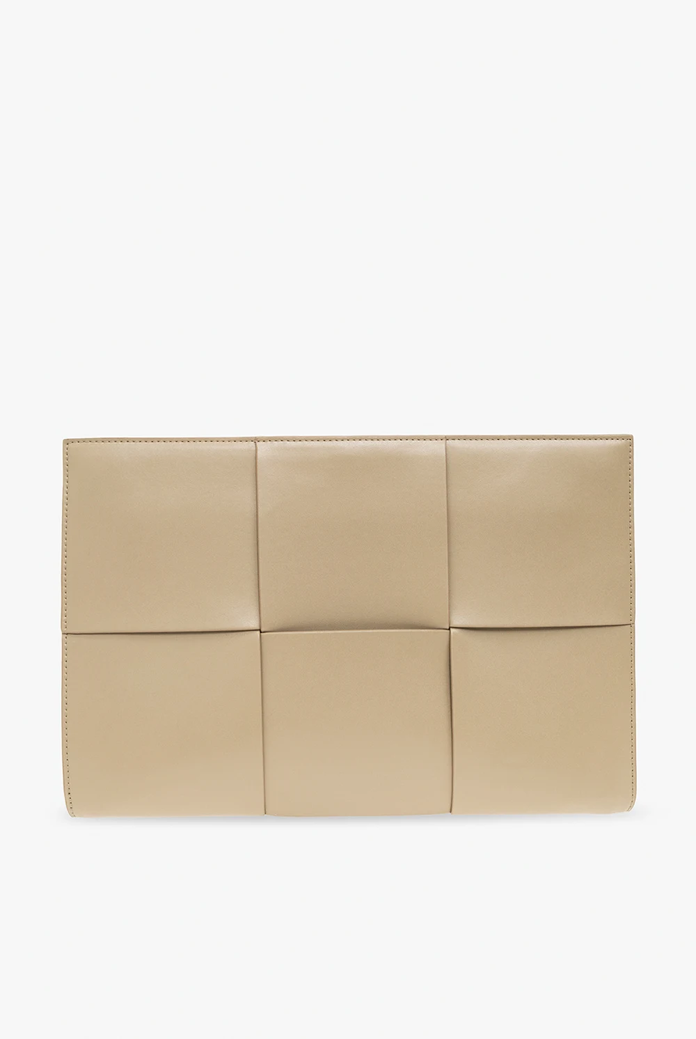 Jasnobeżowe etui na dokumenty, model ‘Acro’ Bottega Veneta. Zamykane na dwubiegunowy zamek. Wykonane ze skóry cielęcej. Ozdobione z charakterystyczną dla marki plecionką. Wewnątrz komora oraz kieszeń zamykana na zamek. Metalowe wykończenie w kolorze srebrnym.