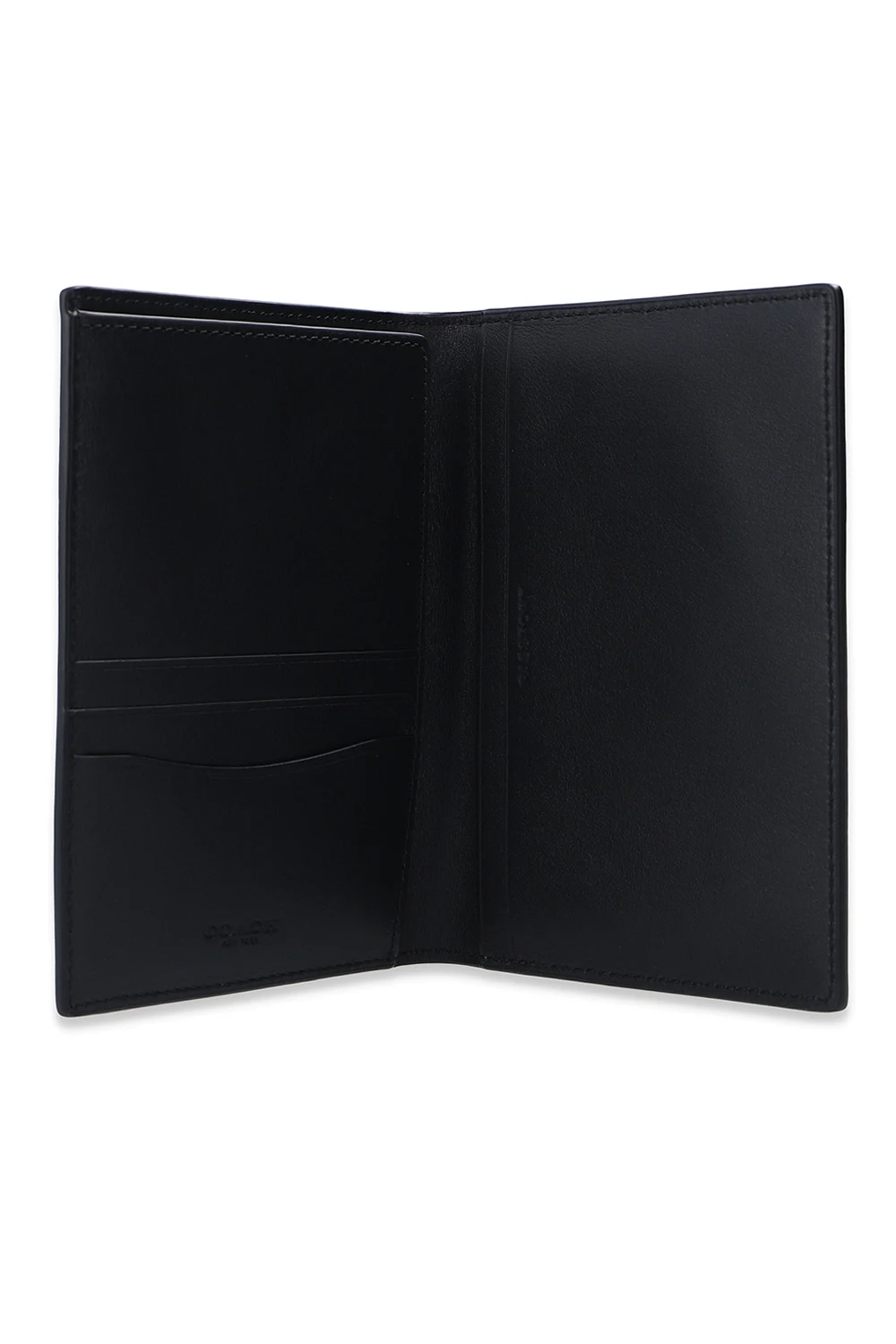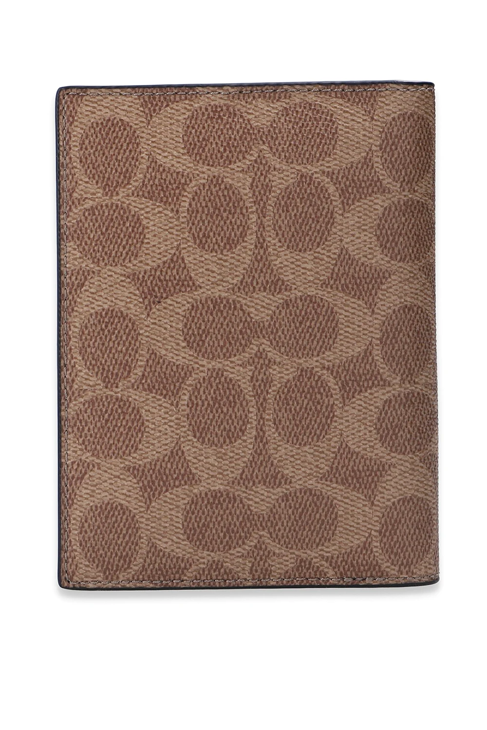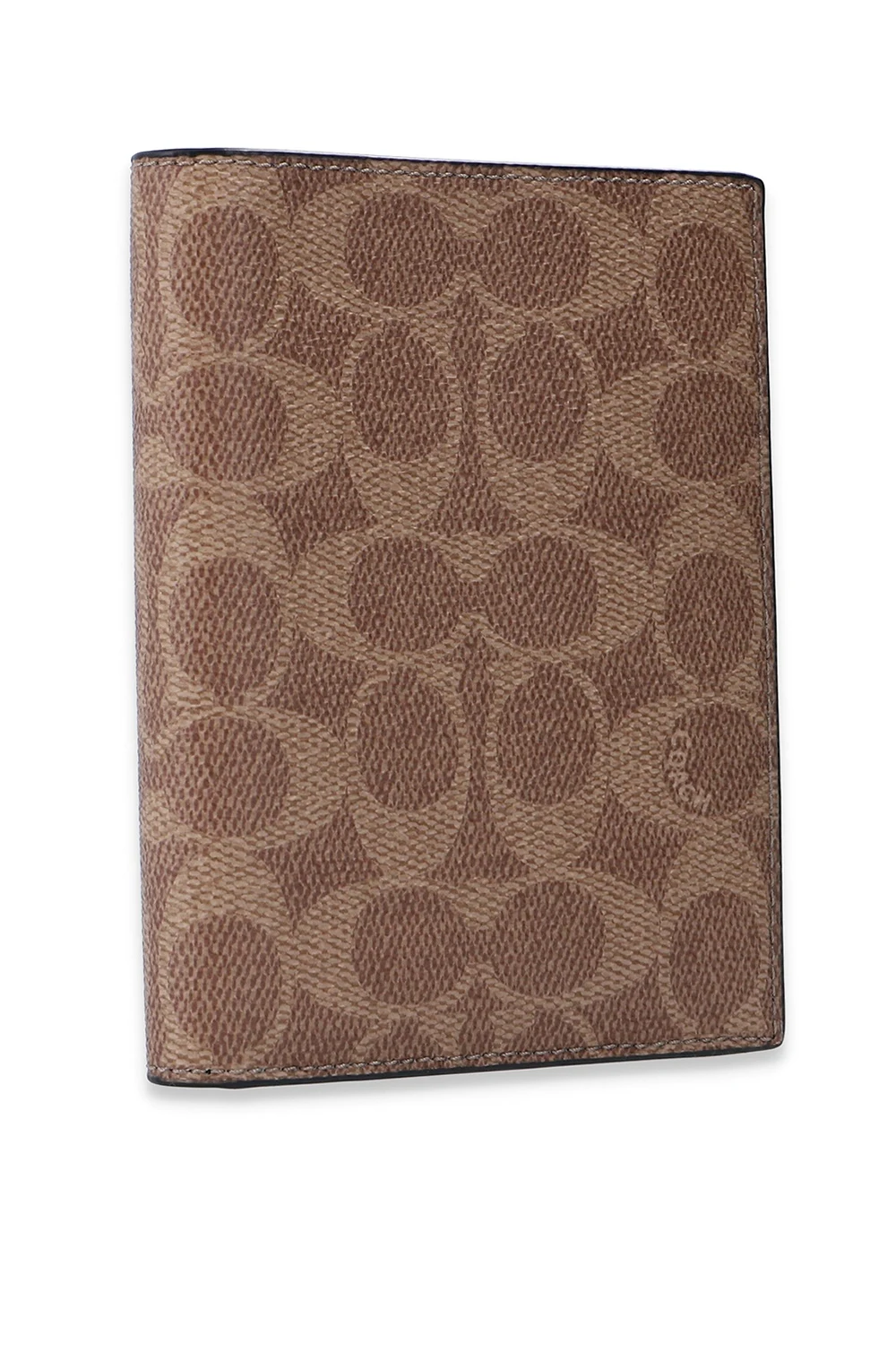 Beżowo-brązowe etui na paszport Coach. Ozdobione wzorem z logo. Wewnątrz kieszeń na paszport, kieszeń wsuwana oraz trzy miejsca na karty.