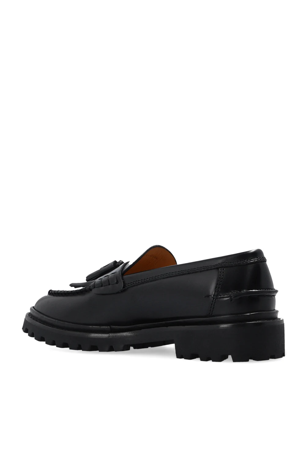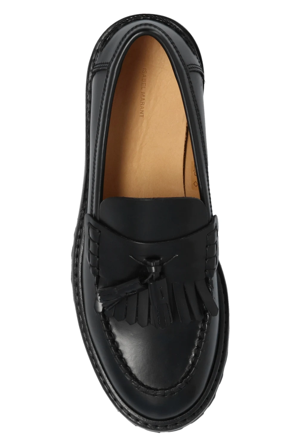 Czarne, skórzane mokasyny, model ‘Frezza’ Isabel Marant. Z przodu ozdobione pasem z frędzlami. Czarna, gumowa podeszwa.