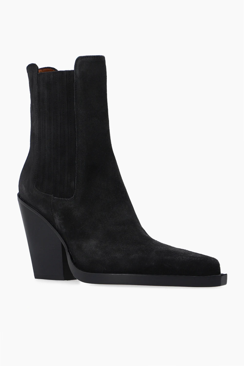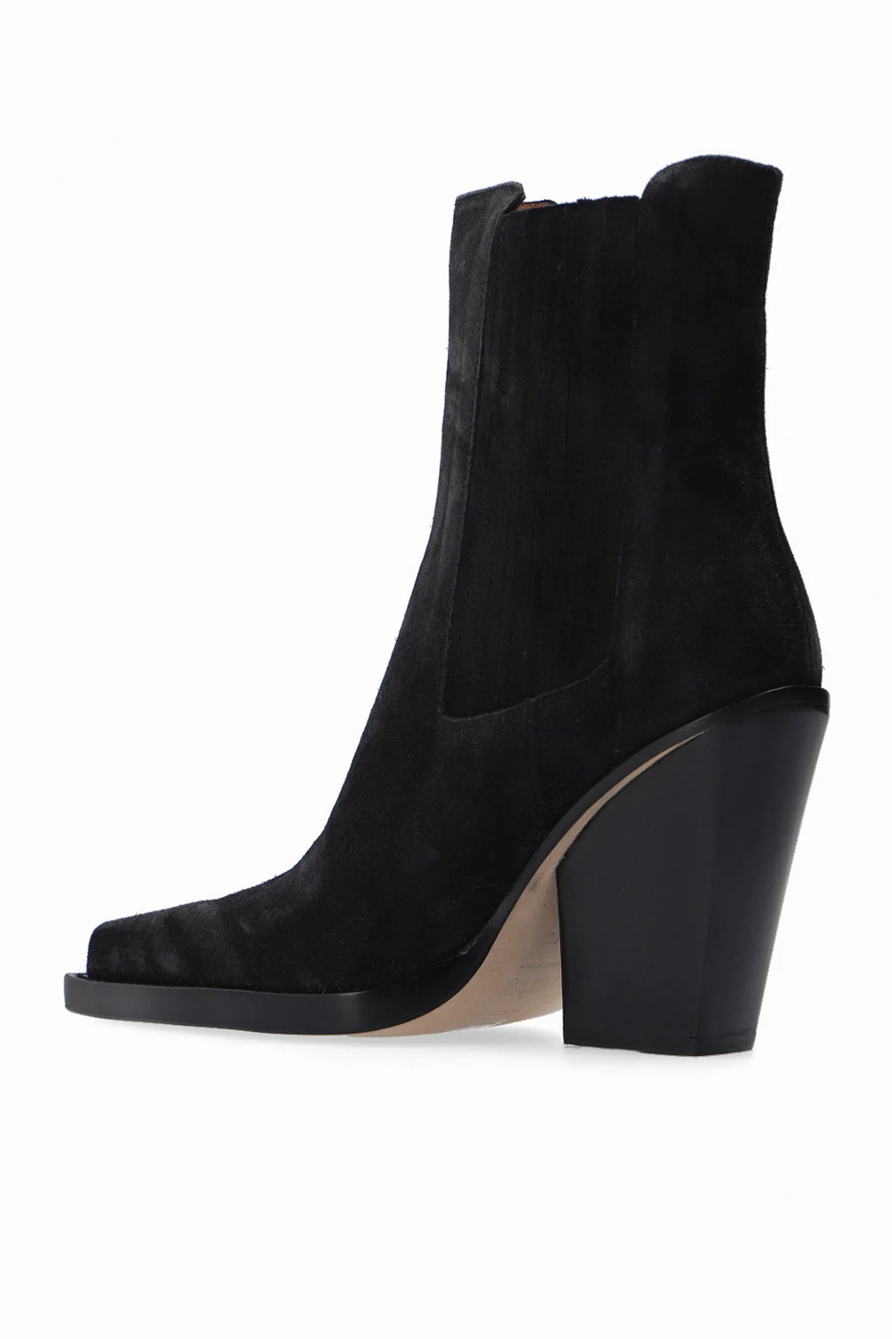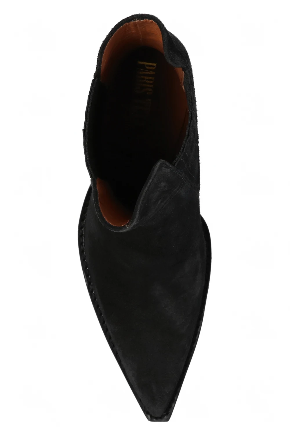 Czarne botki na obcasie, model ‘Dallas’ Paris Texas. Wykonane z zamszu. Nosek w szpic. Beżowa, skórzana podeszwa.