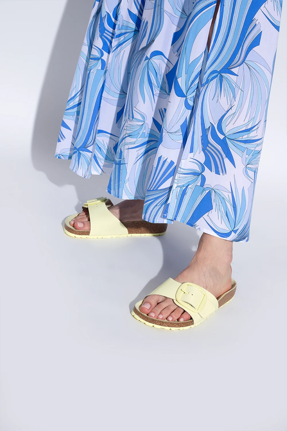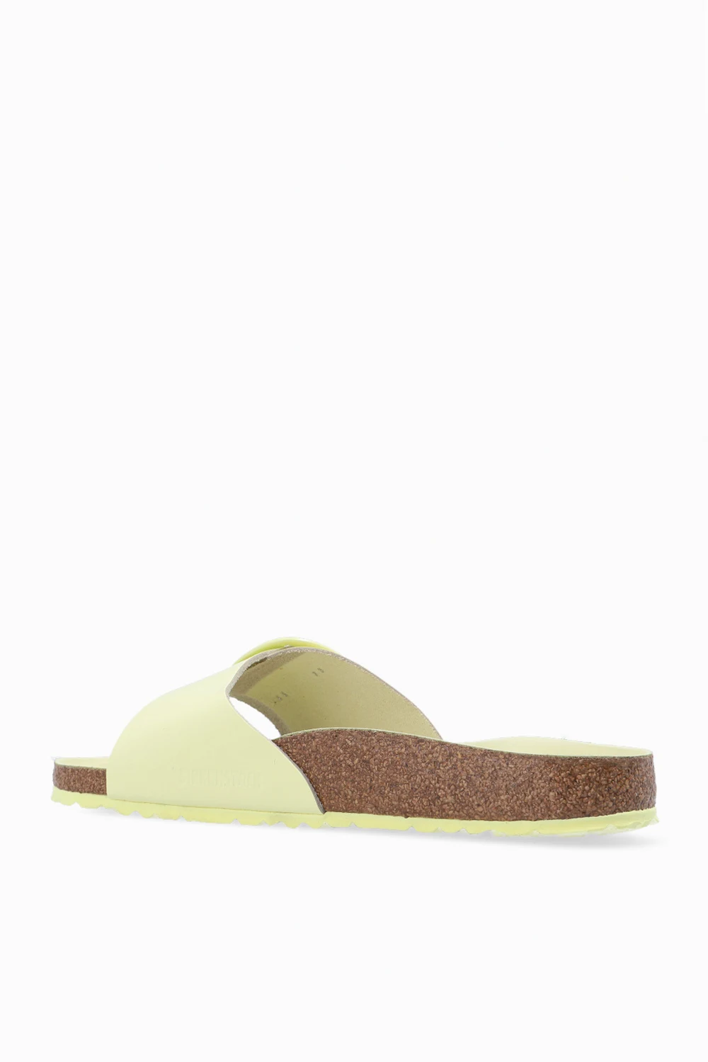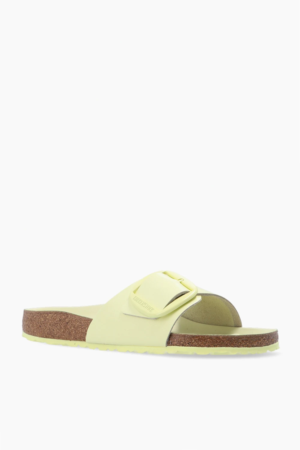 Żółte klapki, model 'Madrid Big Buckle’ Birkenstock. Wykonane z lakierowanej skóry. Regulowany pasek z klamrą z logo. Z boku wytłoczone logo. Żółta podeszwa wykonana z naturalnego korka oraz pianki EVA.