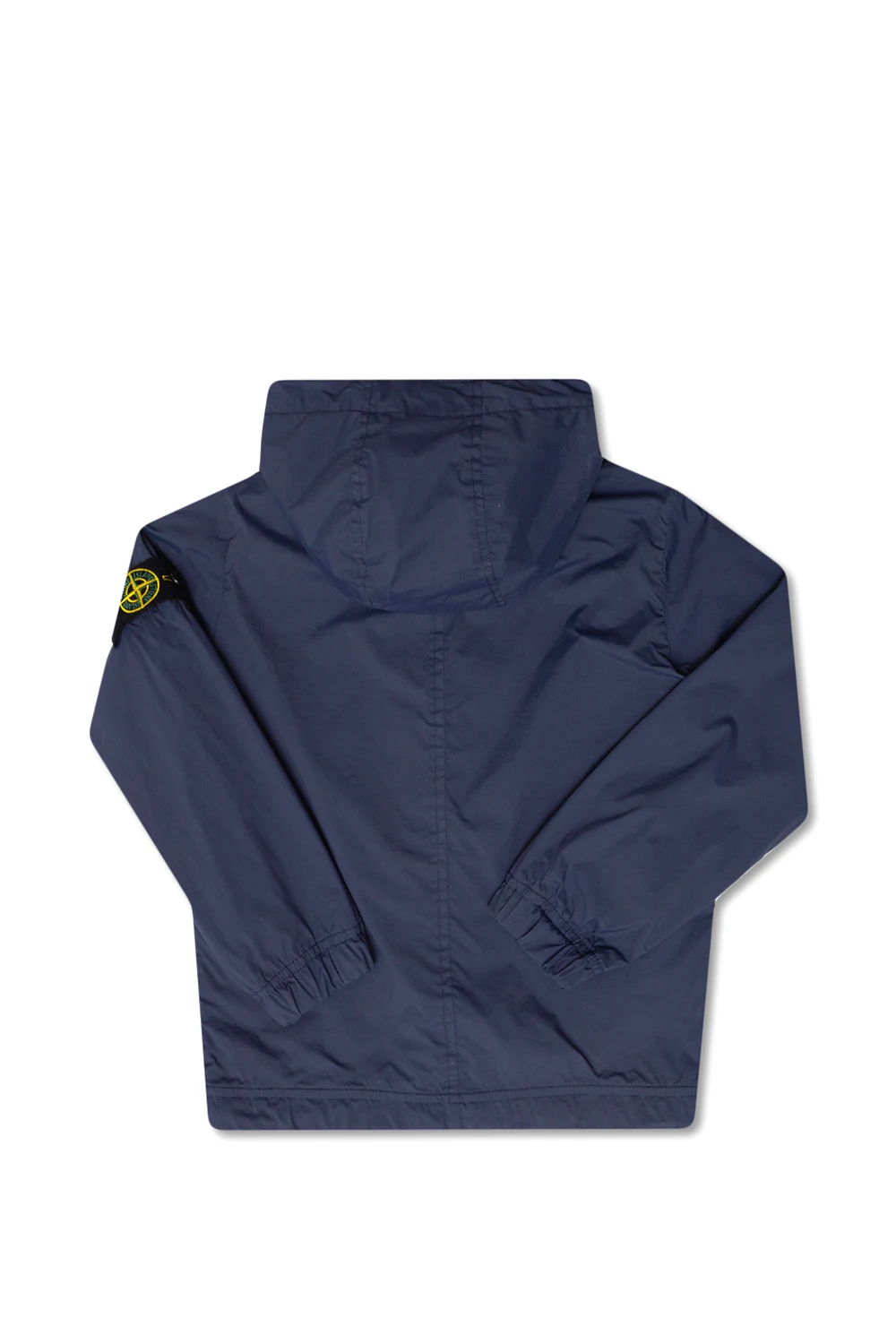 Granatowa, przeciwdeszczowa kurtka z kapturem Stone Island Kids. Zapinana na zamek. Na rękawie czarna, odpinana naszywka z logo w kolorze żółto-zielonym. Z przodu dwie kieszenie zamykane na zamki z frędzlami. Dół ściągany trokami.