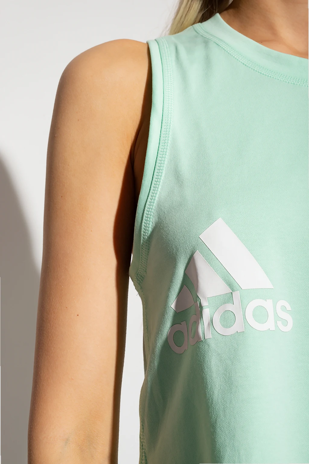Jasnozielony top treningowy bez rękawów ADIDAS by Stella McCartney. Wykonany z mieszanki bawełny organicznej oraz materiału pochodzącego z recyklingu. Luźny krój ozdobiony białymi przeszyciami oraz nadrukami z logo. Okrągły dekolt wykończony ściągaczem, na dole po bokach rozcięcia.