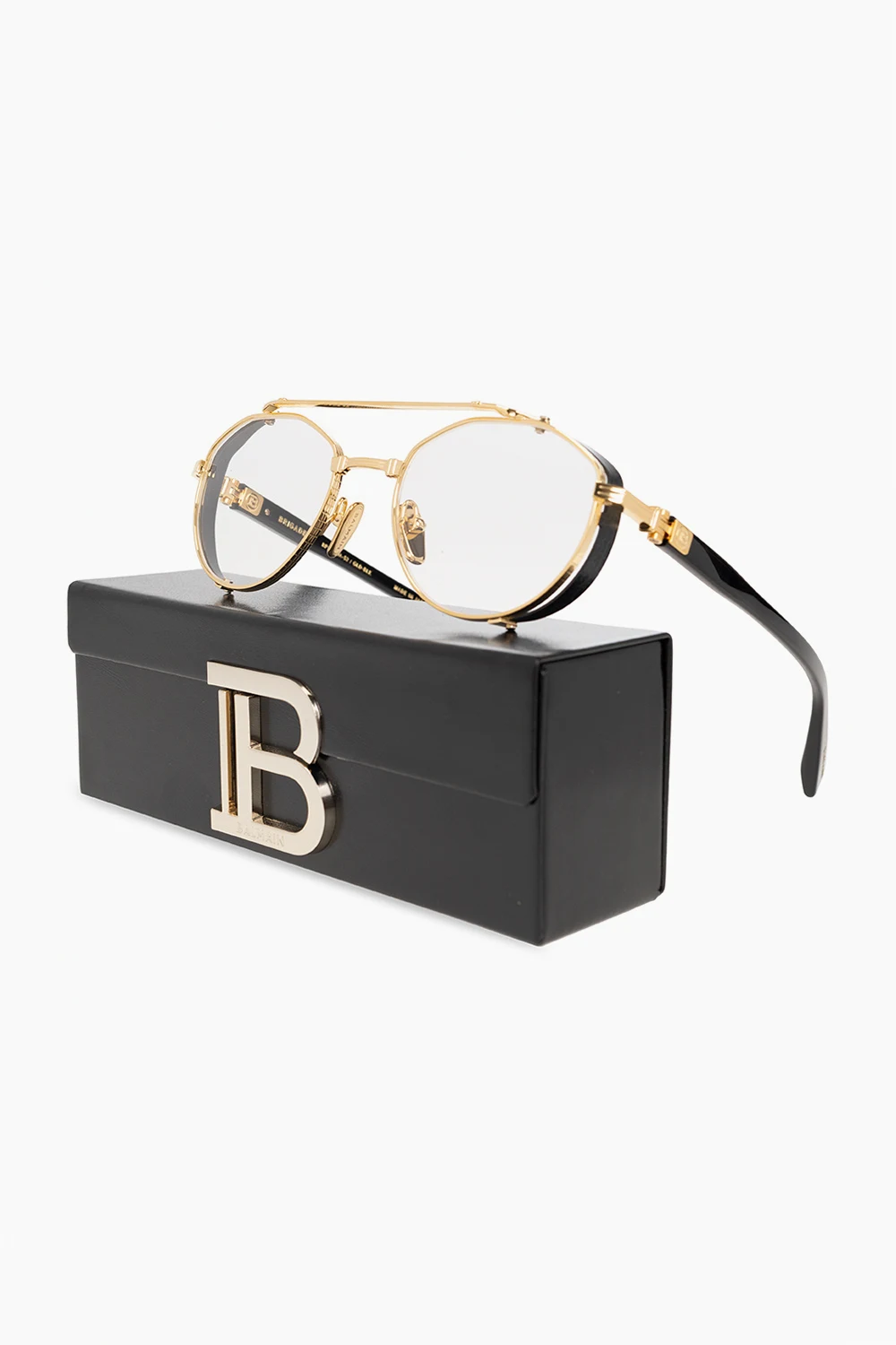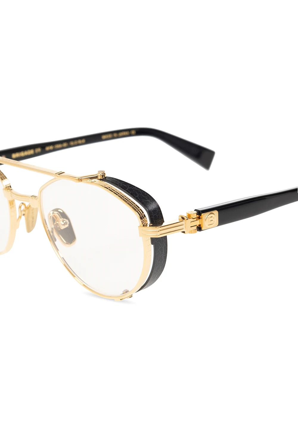 Okulary korekcyjne w kolorze czarno-złotym, model ‘Brigade-IV’ Balmain. Owalne oprawki z wykończeniem w stylu ‘vintage’ z bocznymi osłonami z tytanu. Transparentne soczewki z powłoką antyrefleksyjną. Dołączone etui.