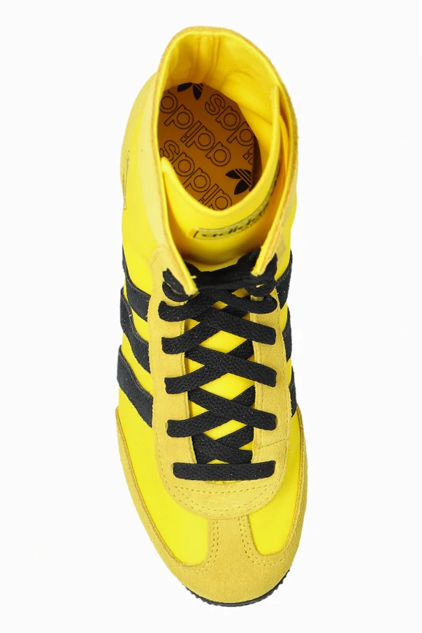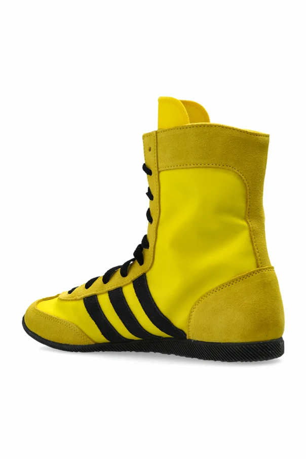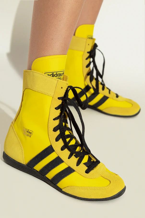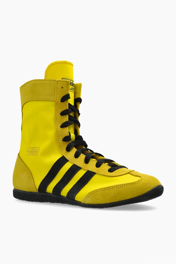 Połączenie żółtej skóry syntetycznej oraz zamszowych wstawek w górnej części cholewki, na pięcie i nosku, gwarantuje estetykę oraz trwałość. Złoty napis "adidas JAPAN" oraz unikatowe logo na języku i wkładce podkreślają prestiż, a kontrastujące czarne sznurówki dopełniają całość. Ciemna, cienka i elastyczna podeszwa gumowa zapewnia komfort, dynamikę oraz przyczepność, typowe dla modeli lekkoatletycznych.