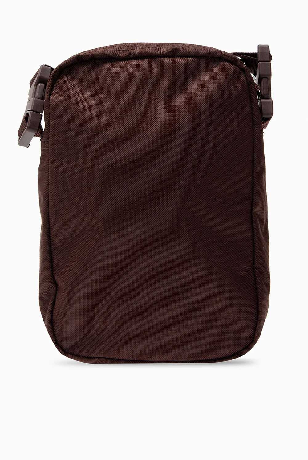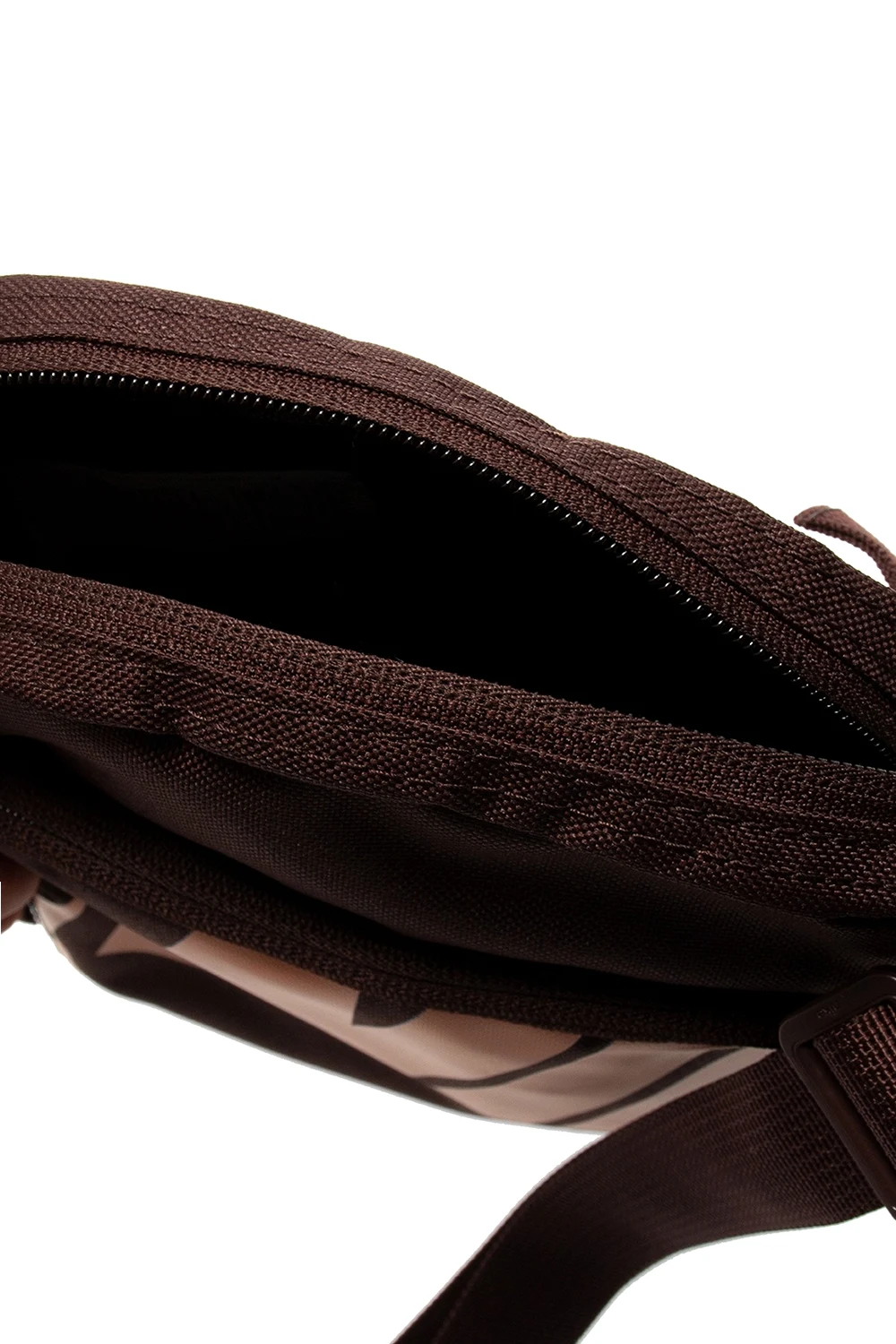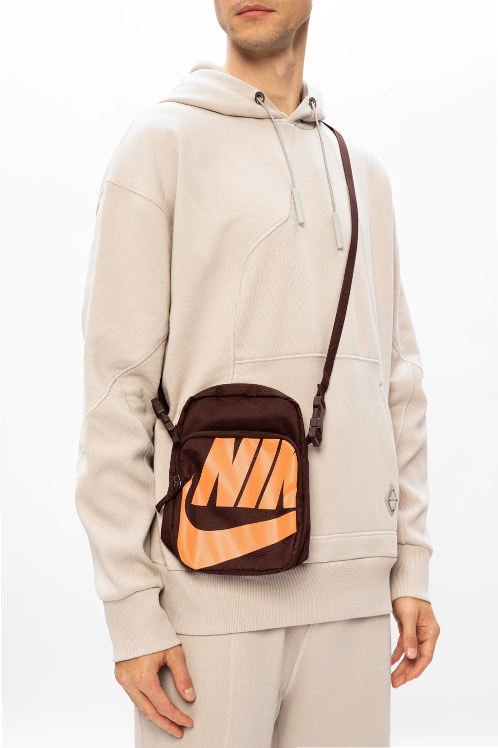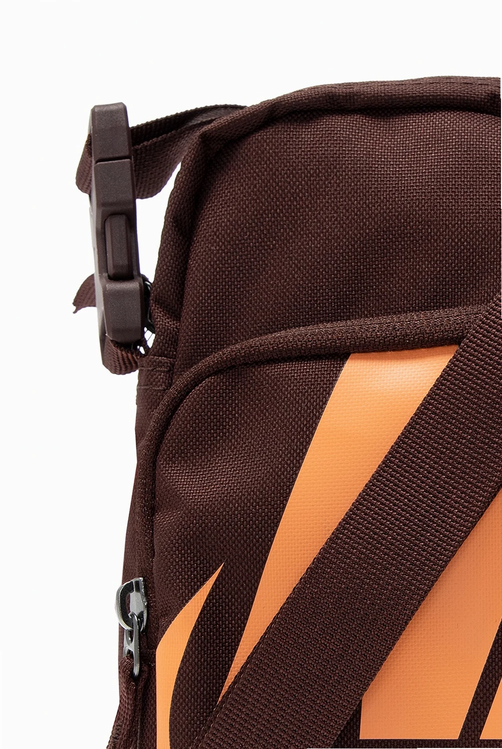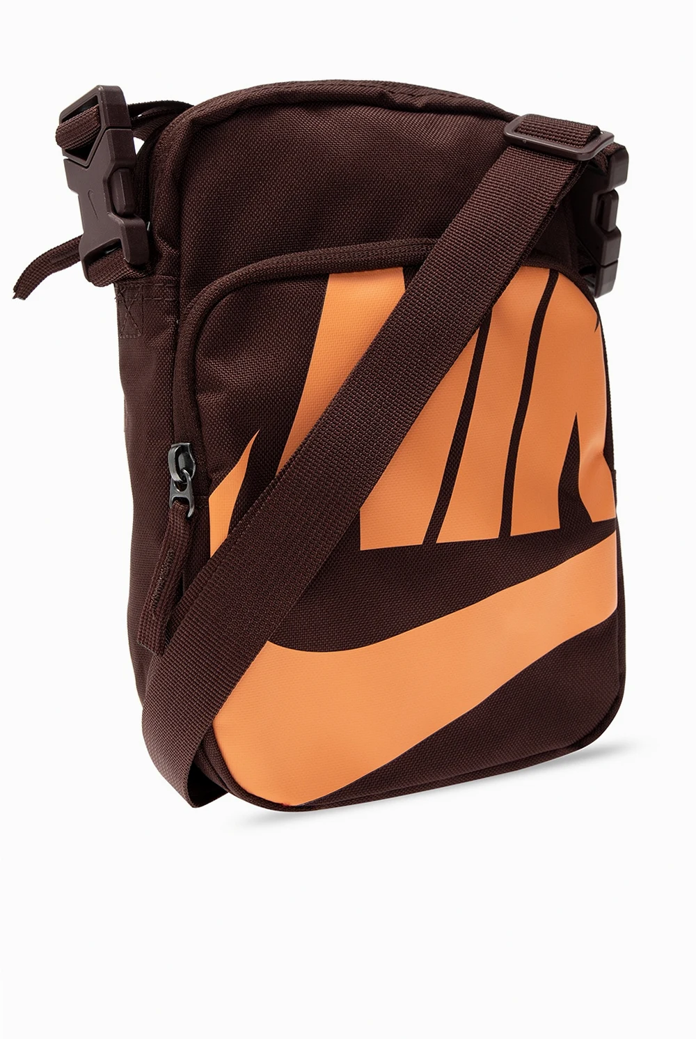 Brązowa torba na ramię Nike. Zapinana na zamek. Nadruk z logo w kolorze pomarańczowym. Z przodu kieszeń zapinana na zamek. Odpinany pasek na ramię z możliwością regulacji. Wewnątrz komora oraz wsuwana kieszeń.