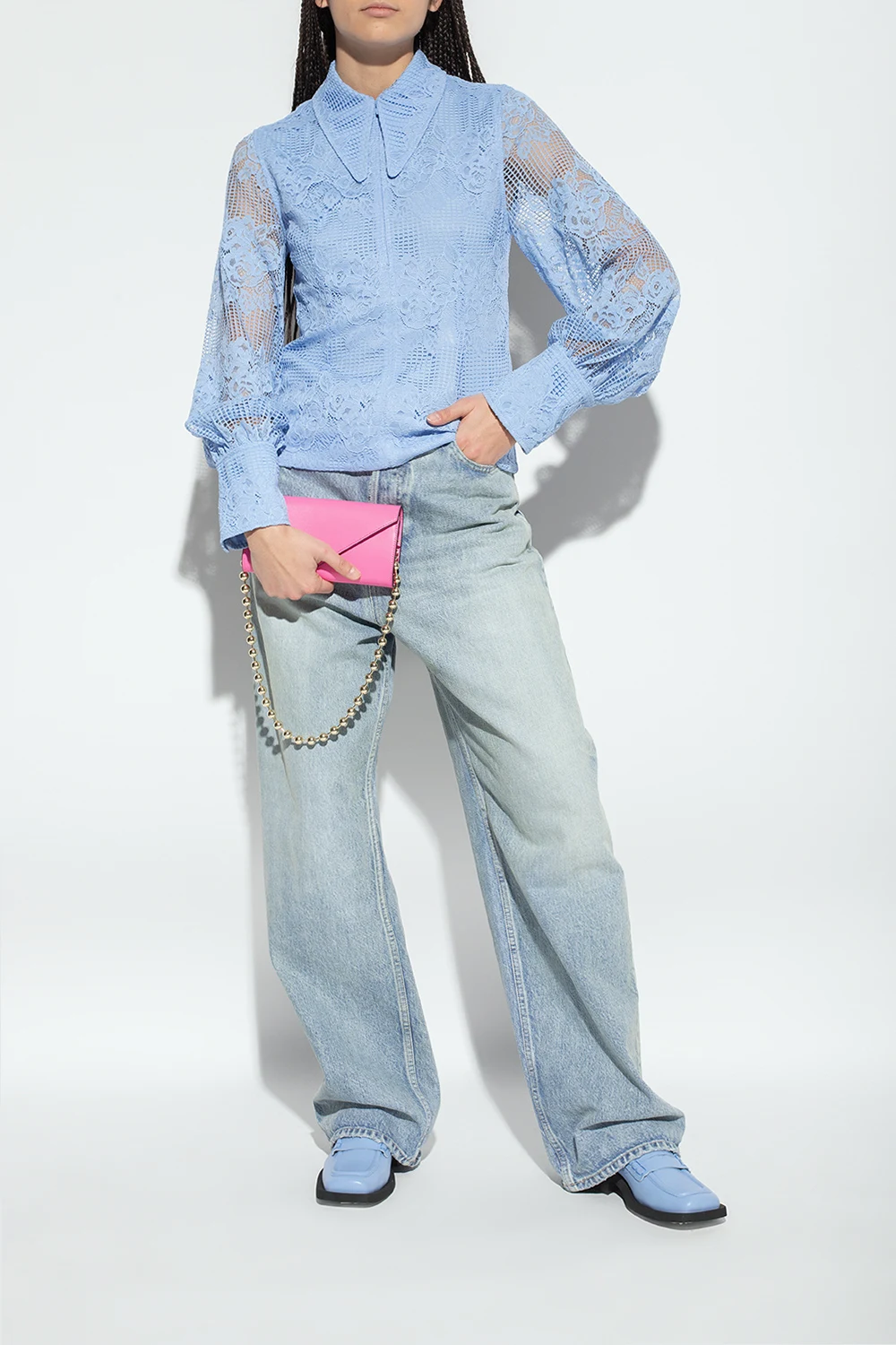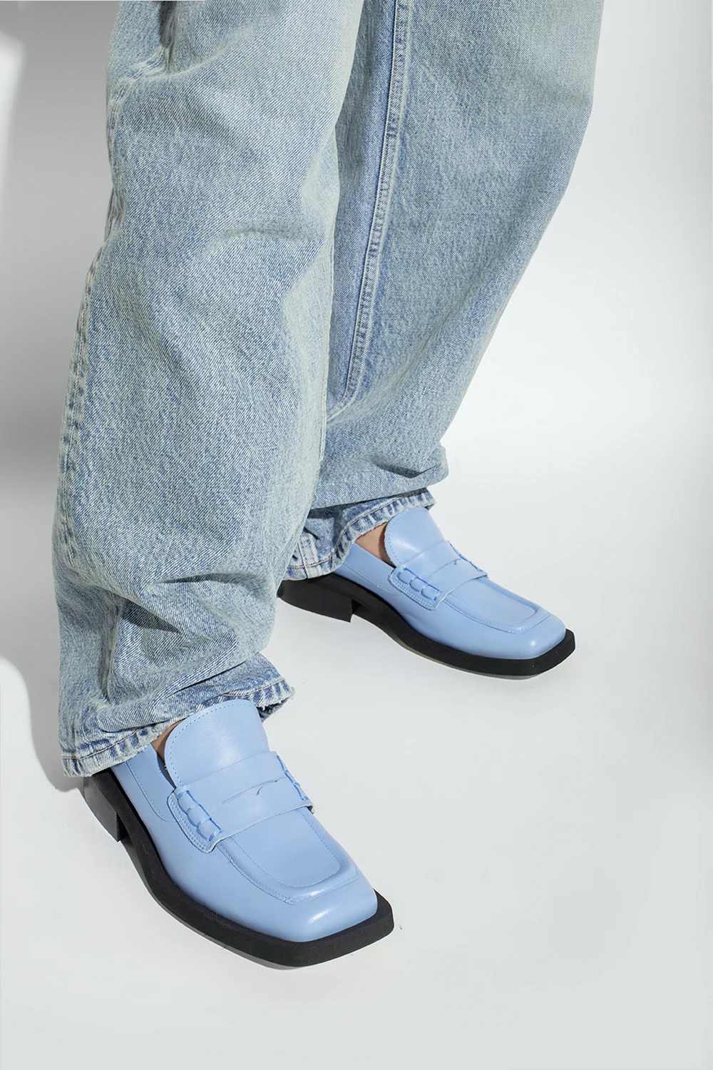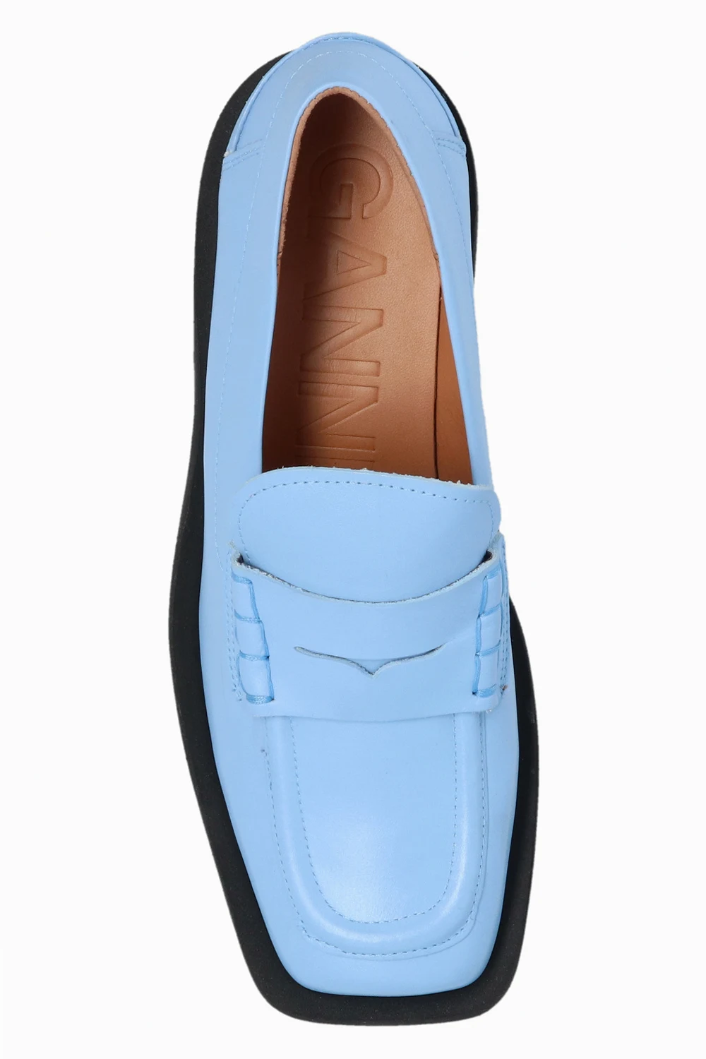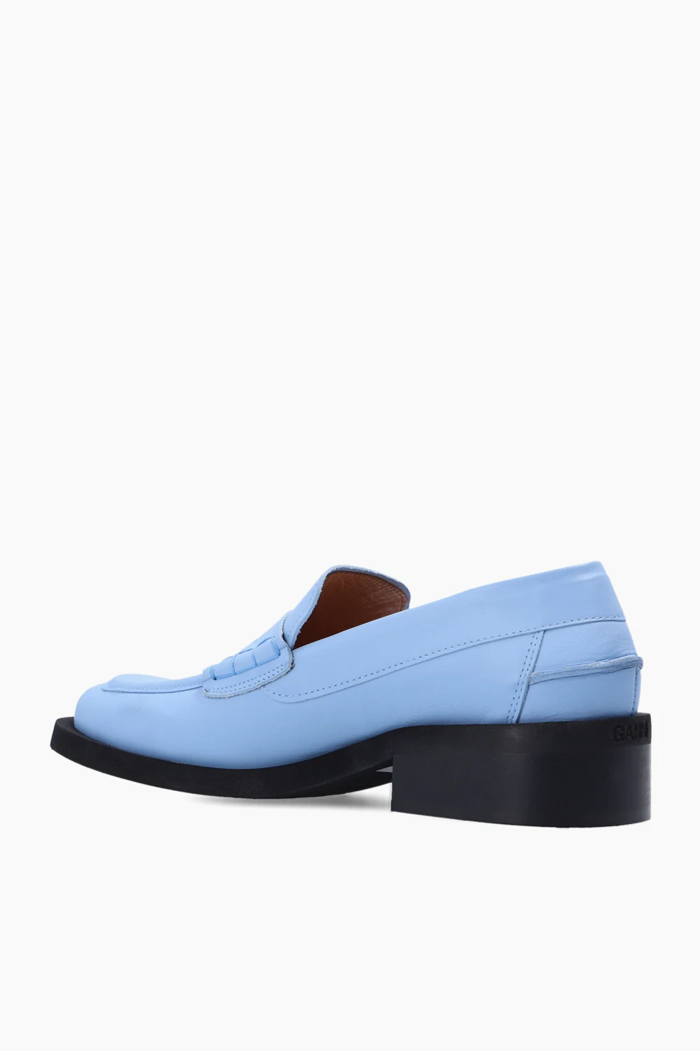 Jasnoniebieskie mokasyny Ganni. Wykonane ze skóry. Czarna, gumowa podeszwa.