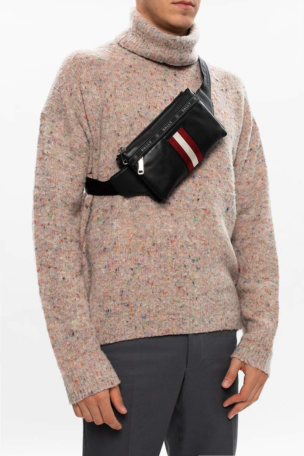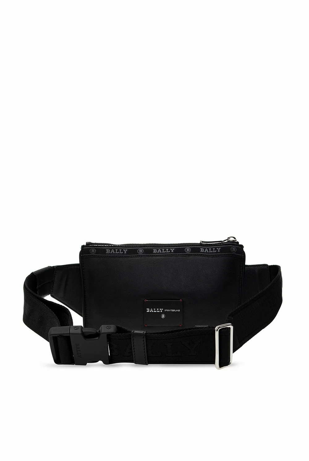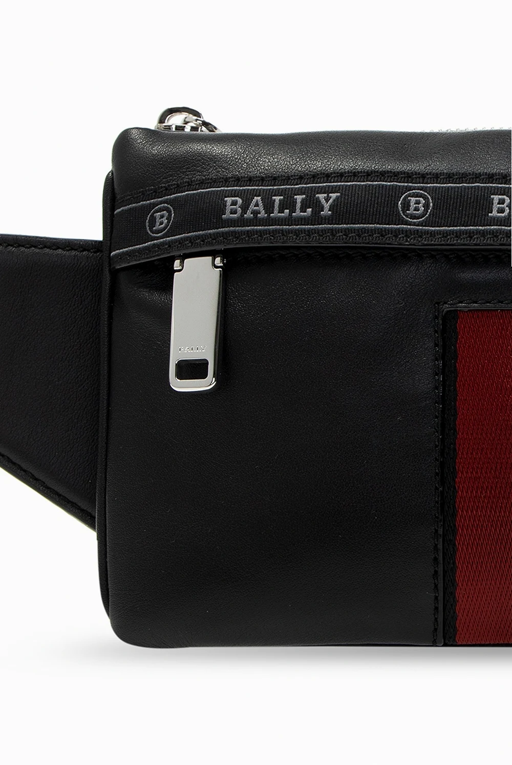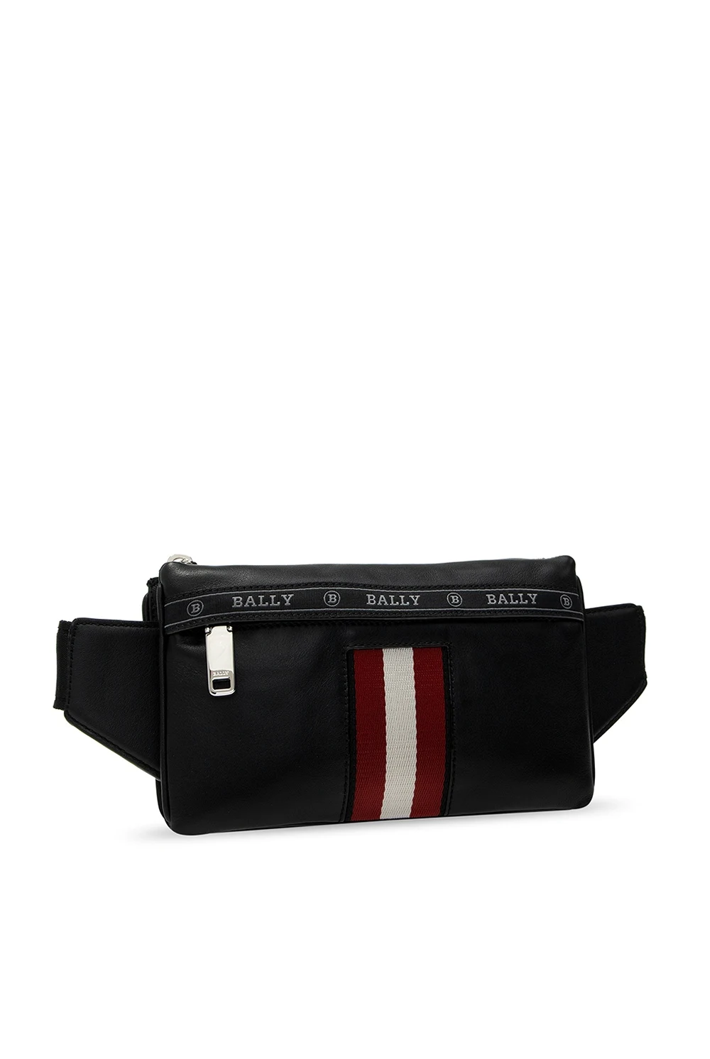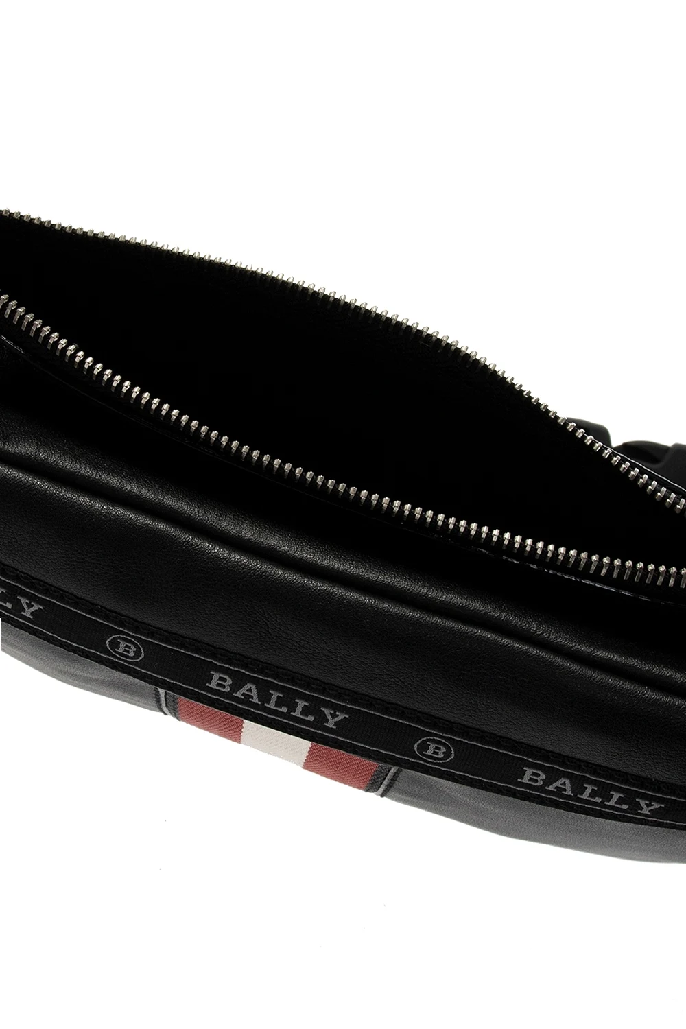 Czarna torba na pas, model ‘Helvet’ Bally. Zamykana na zamek. Ozdobiona rypsowym paskiem z wyszytym logo w kolorze szarym. Z przodu kieszeń zapinana na zamek oraz charakterystyczne dla marki trzy paski w kolorze czerwono-biało-czerwonym. Z tyłu naszywka z logo. Regulowany pas. Wewnątrz komora.