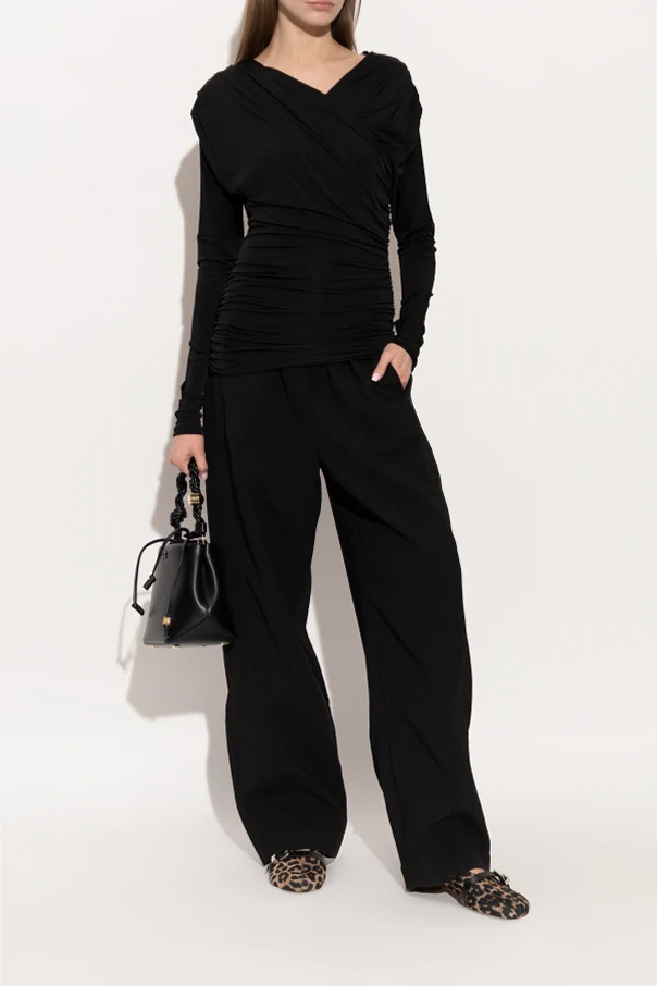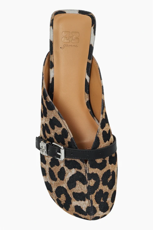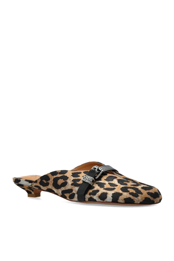 Wyrafinowane klapki na obcasie marki Ganni zachwycają niezwykłym połączeniem klasyki i ekstrawagancji. Kształt typu mule na niskim, szerokim obcasie „kaczuszka”, z subtelnie wydłużonym, smukłym noskiem oraz odkrytą piętą, nadaje sylwetce lekkości i szyku.