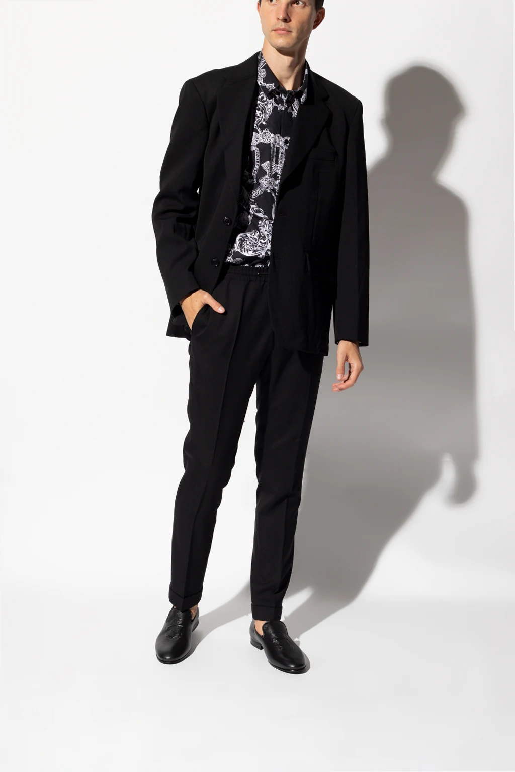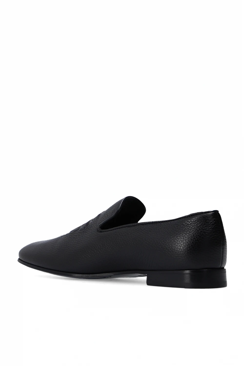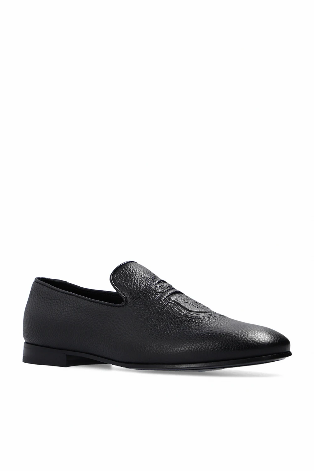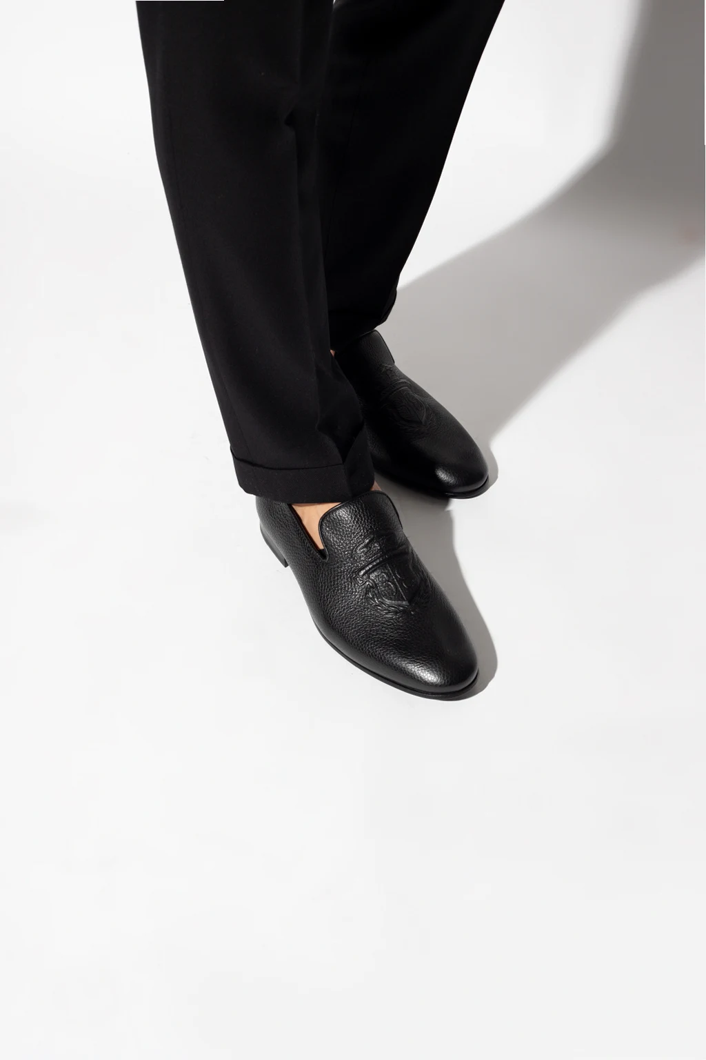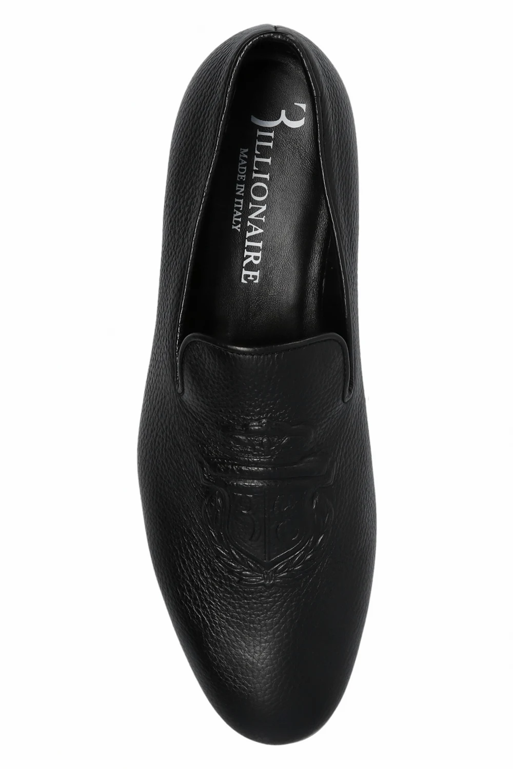 Czarne buty typu ‘loafers’ Billionaire. Wykonane ze skóry. Ozdobione wytłoczonym wzorem z logo. Migdałowy nosek. Czarna, skórzana podeszwa.