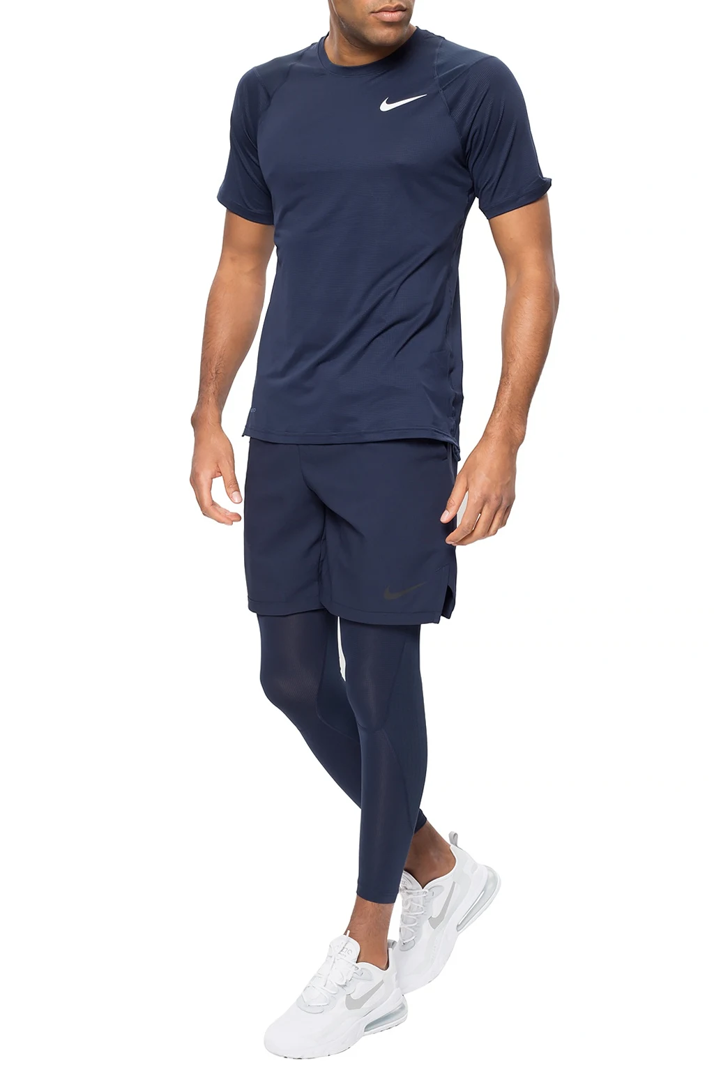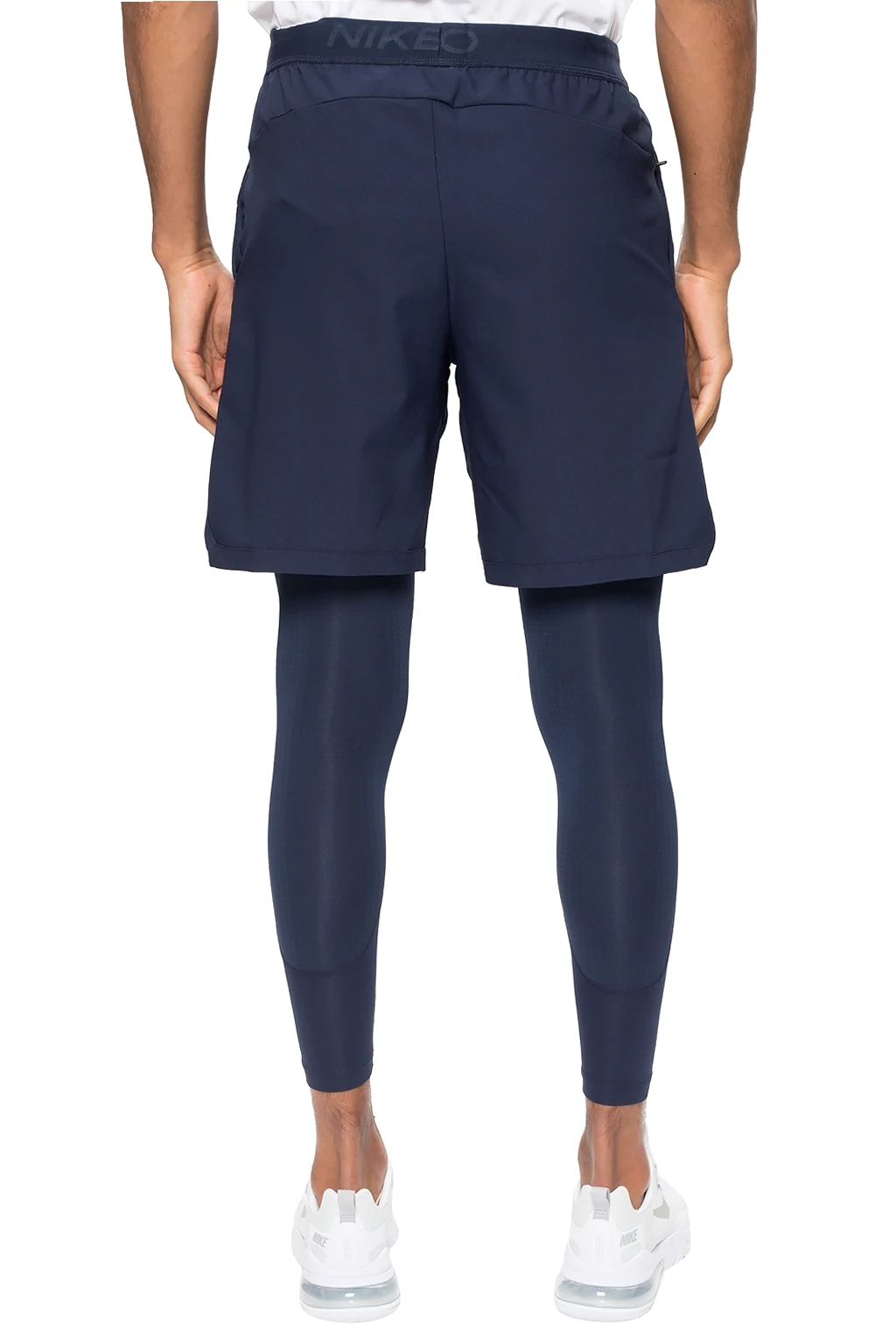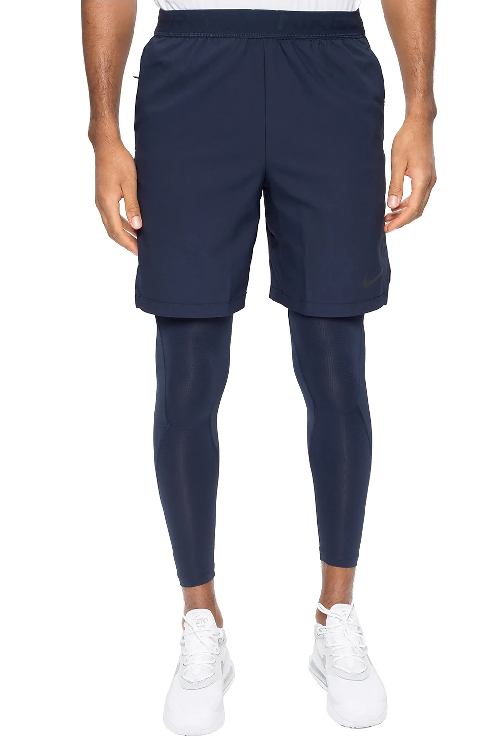 Granatowe szorty Nike. W pasie ściągane trokami. Ozdobione logo. Trzy kieszenie: dwie wsuwane oraz jedna zamykana na zamek.