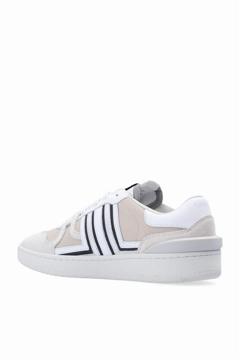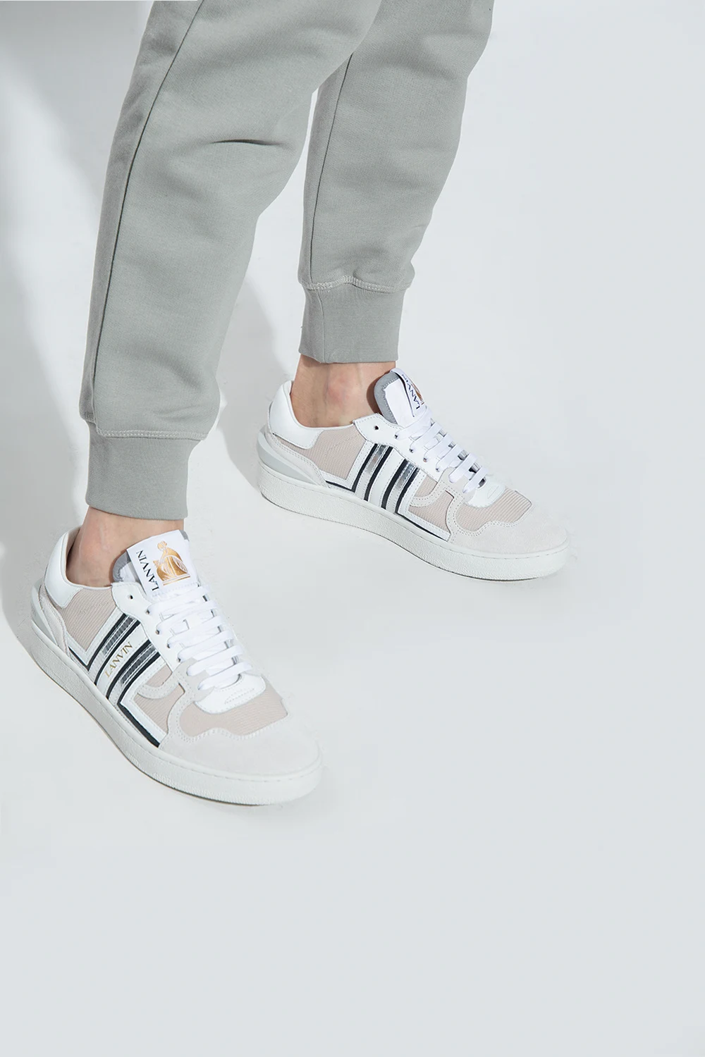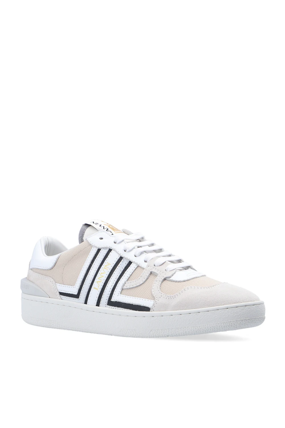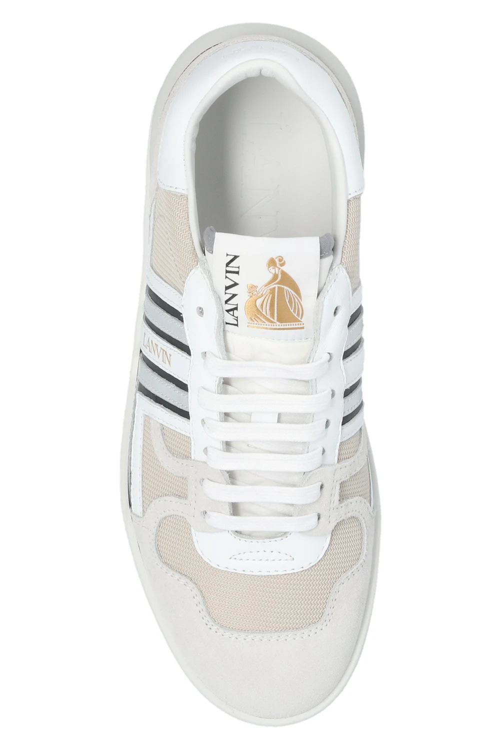 Kremowo-biało-szare, sznurowane buty sportowe, model 'Low Clay' Lanvin. Na języku ozdobione naszywką z logo. Z boku ozdobione skórzanymi paskami w kolorze białym oraz srebrnym. Wykończone zamszem. Jasnoszara, gumowa podeszwa.