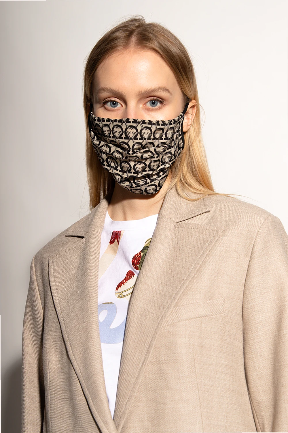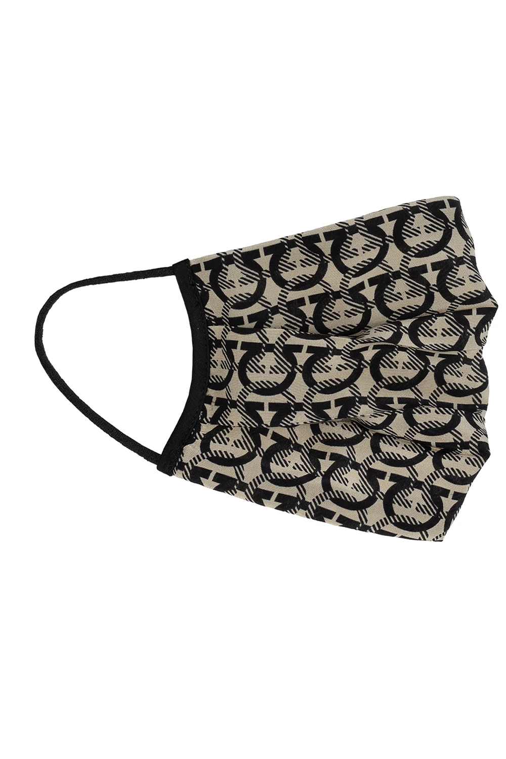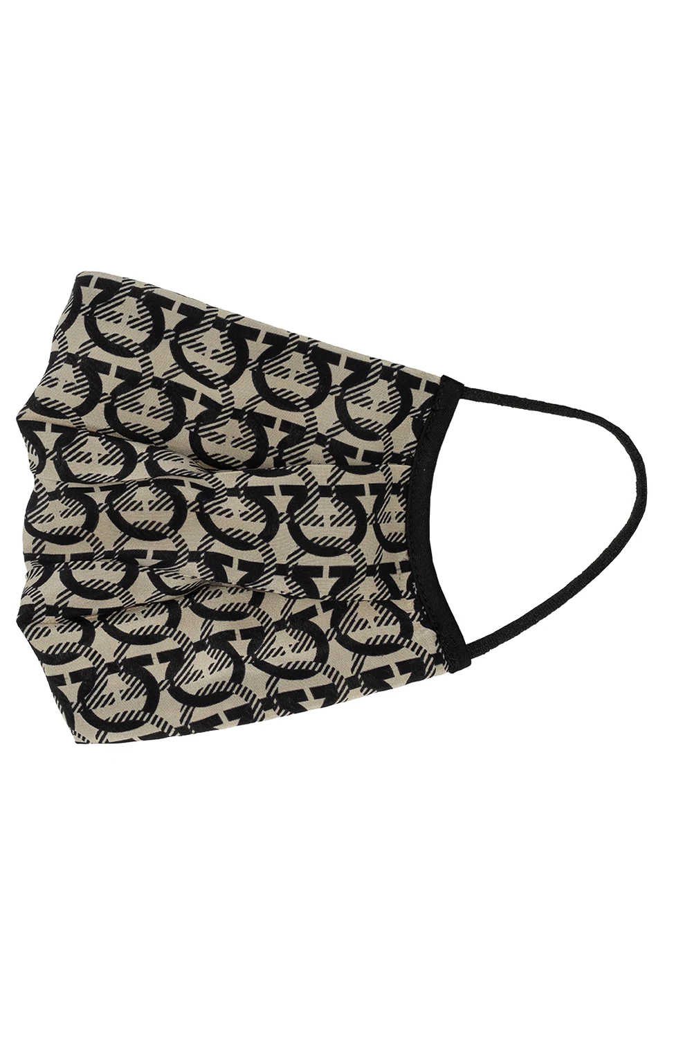 Beżowo-czarna maska Salvatore Ferragamo. Wykonana z jedwabiu. Ozdobiona wzorem z logo. Dołączony woreczek.