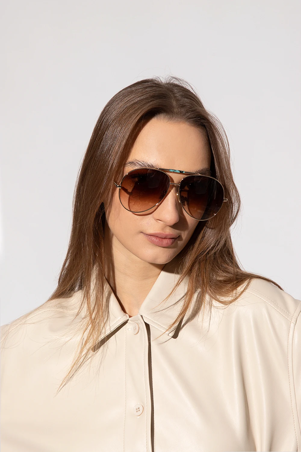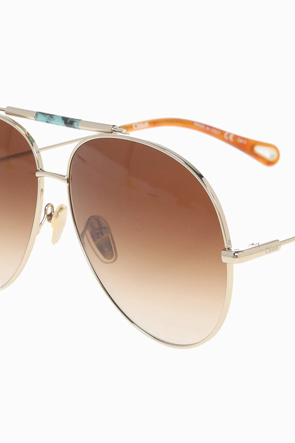 Okulary przeciwsłoneczne w kolorze złotym Chloé. Z przodu dekoracyjny mostek w kolorze czarno-niebieskim imitujący marmur. Zauszniki z logo zakończone otworami umożliwiającymi zapięcie biżuterii. Brązowe, gradientowe, certyfikowane soczewki 100% UVA i UVB. Dołączone pudroworóżowe etui z wytłoczonym logo oraz miejscem na kartę.