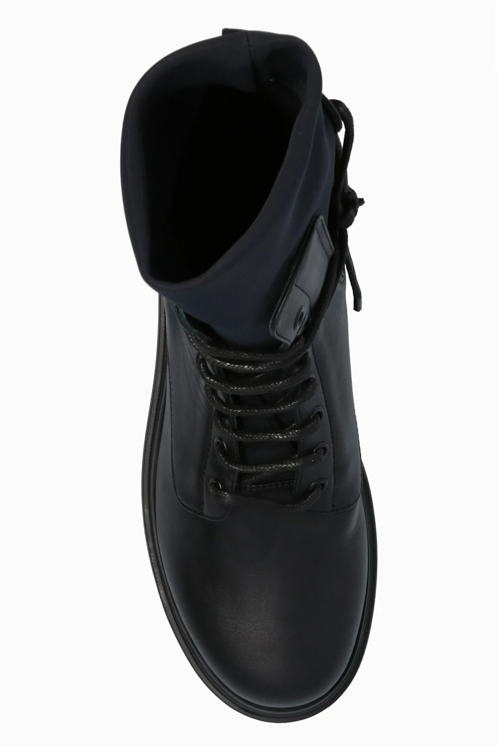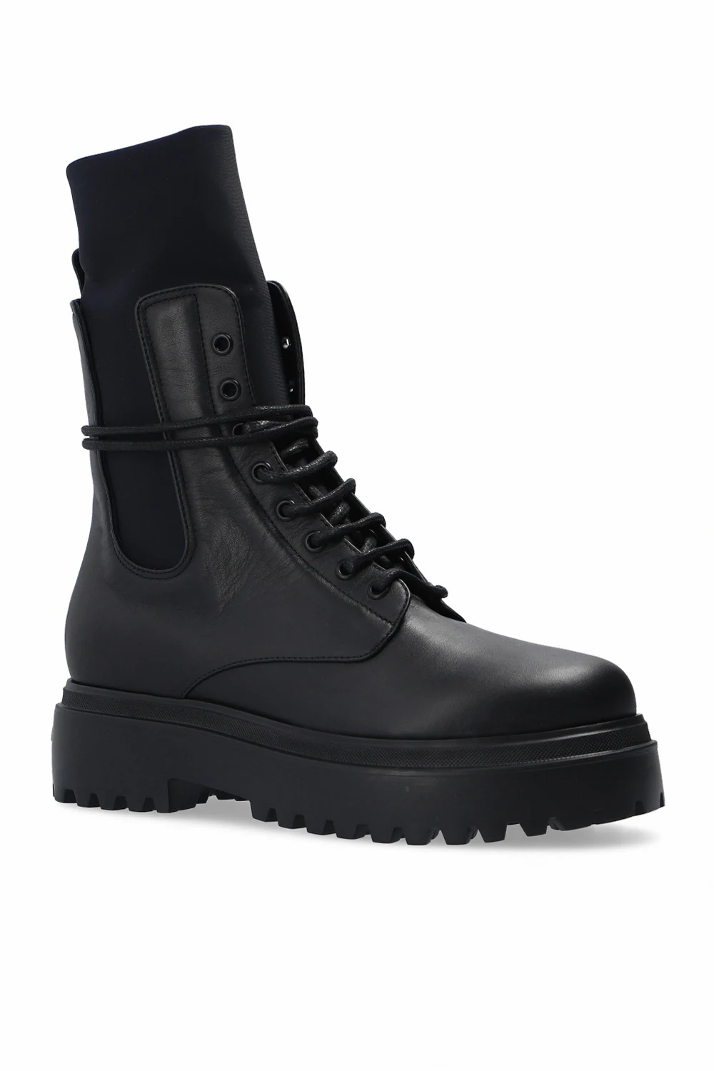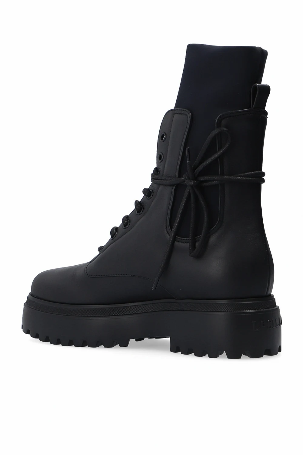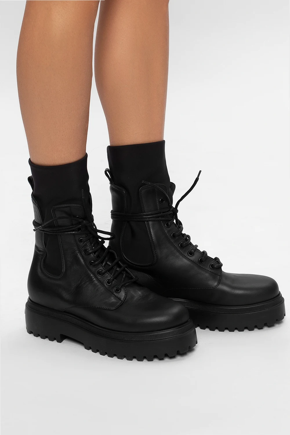 Czarne, sznurowane botki na platformie, model ‘Ranger’ Le Silla. Wykonane ze skóry oraz elastycznego materiału. Czarna, gumowa podeszwa.
