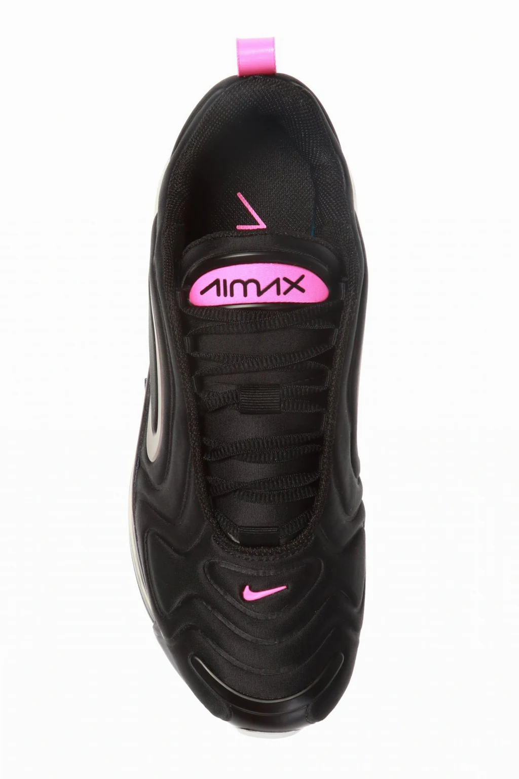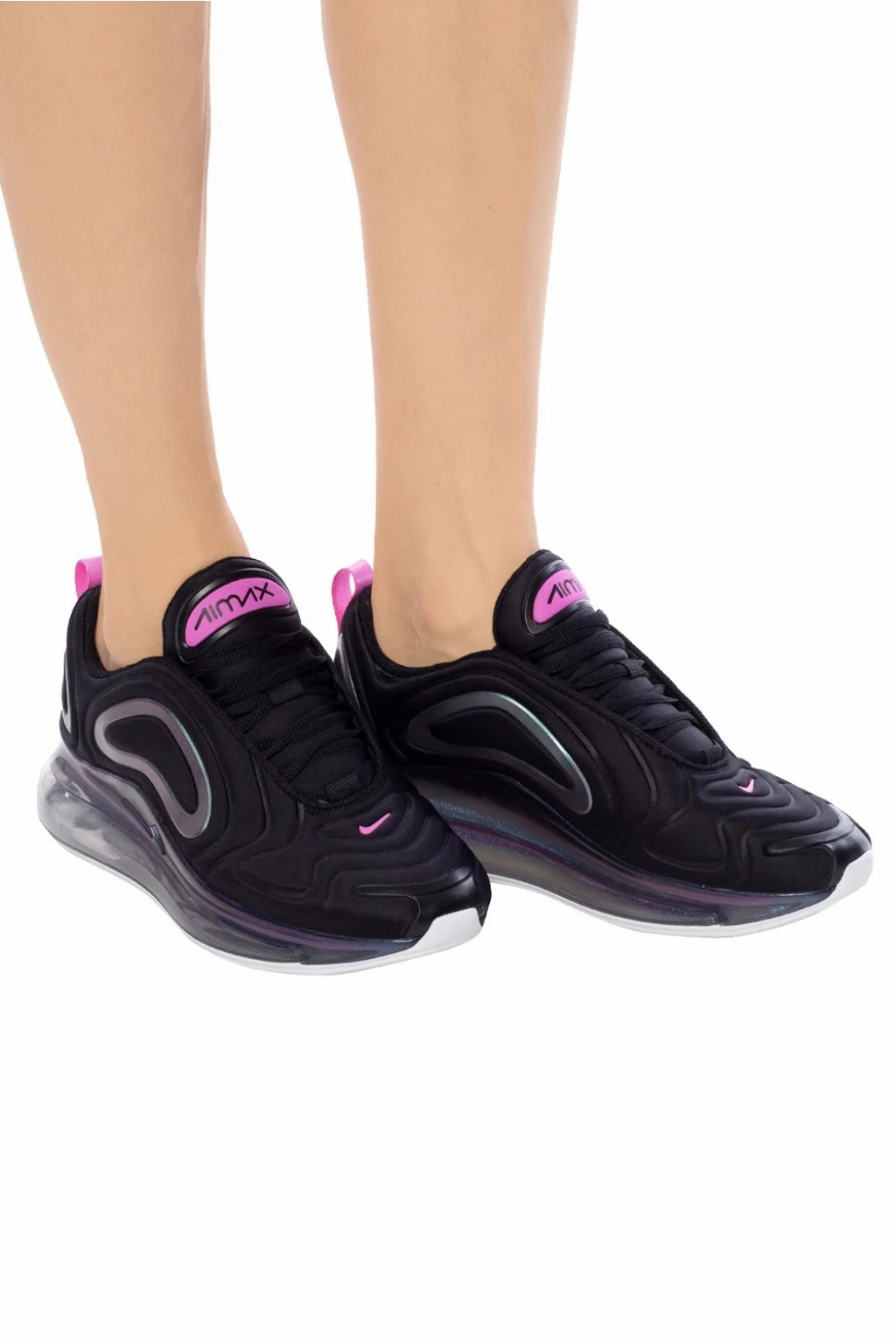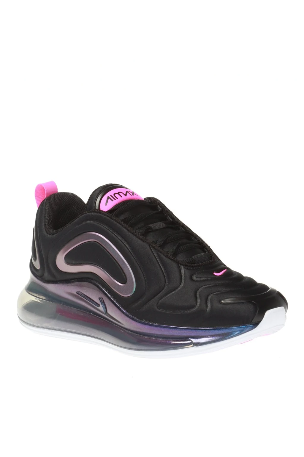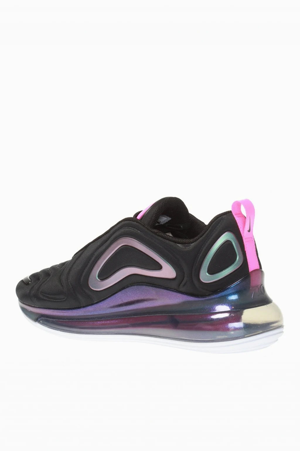 Czarne, sznurowane buty sportowe, model ‘Air Max 720 SE’ Nike. Dekoracyjne wstawki w kolorze fioletowo-niebieskim z efektem holograficznym. Wyszyte logo w kolorze różowym. Profilowane linie na cholewce inspirowane rozchodzącymi się falami. Poduszka gazowa Nike Air zapewniająca amortyzację na całej długości. Biało-różowo-fioletowa, transparentna, gumowa podeszwa.