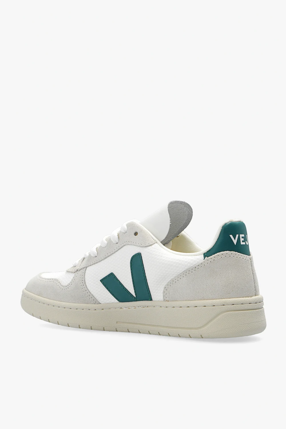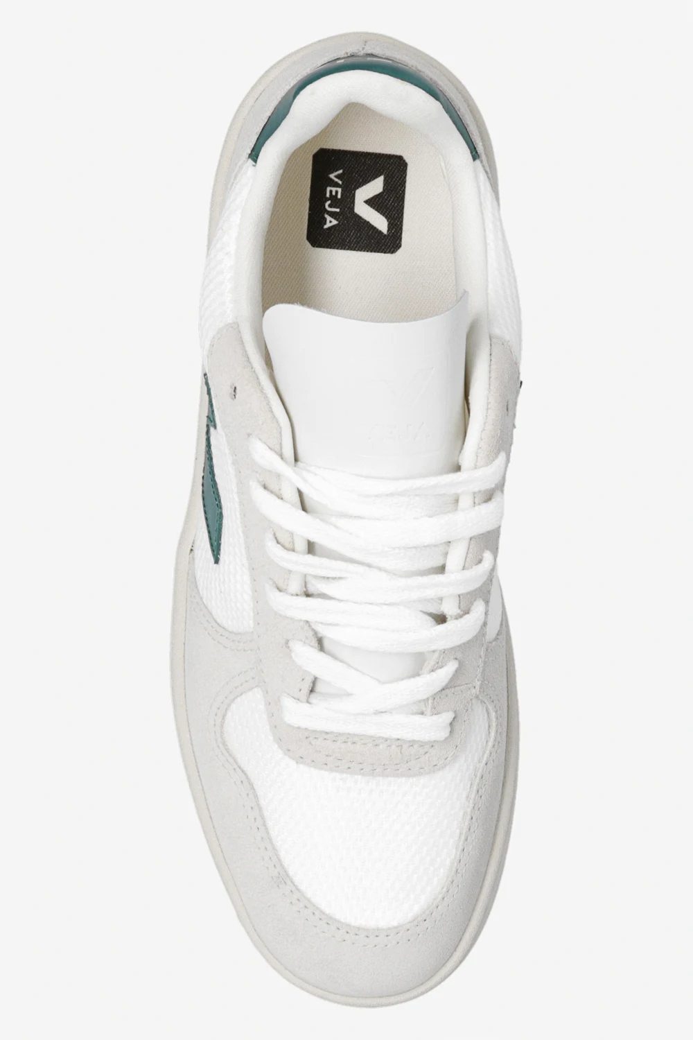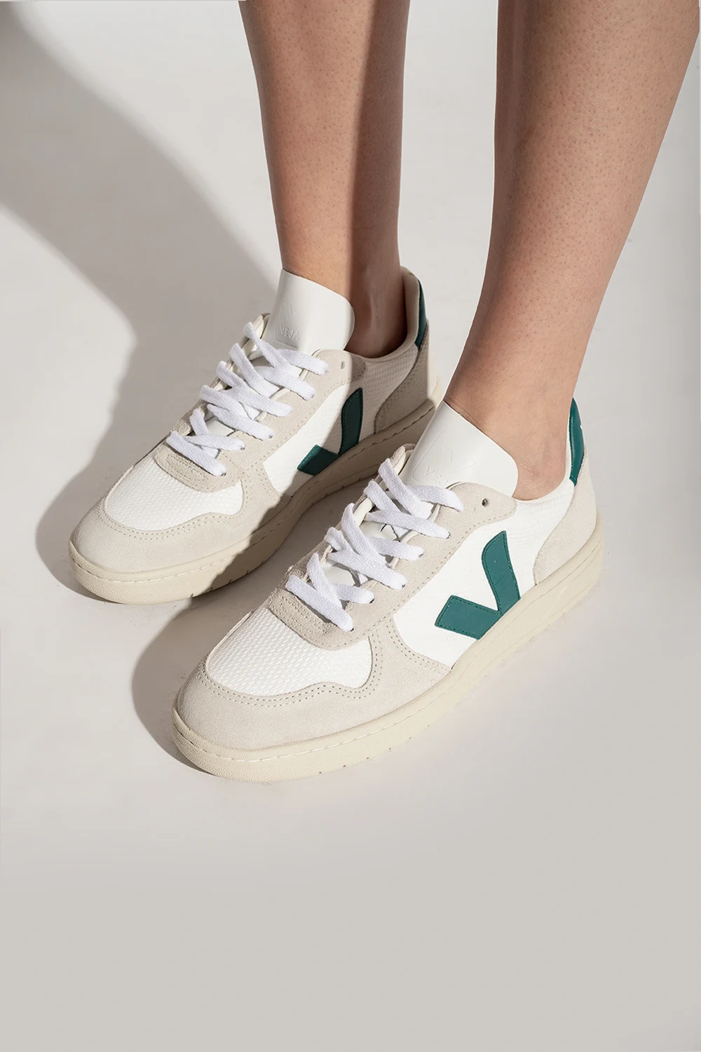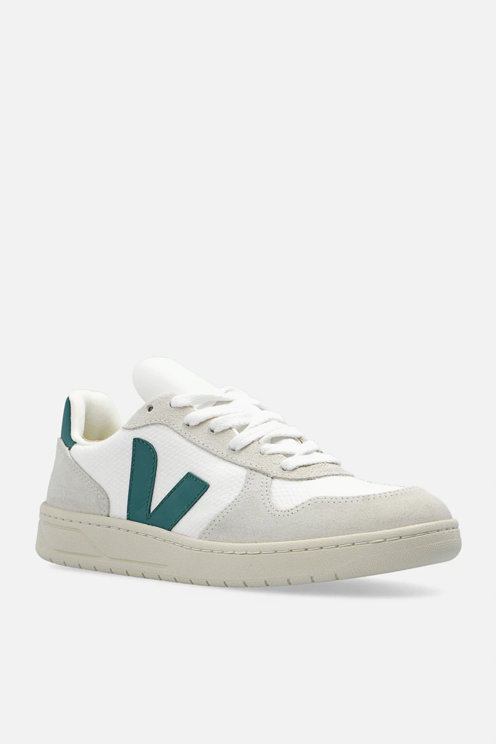 Biało-szare, sznurowane buty sportowe, model 'V-10 B-Mesh' Veja. Wykonane z nubuku, skóry i siatki (100% poliester z recyklingu). Na języku wytłoczone logo. Charakterystyczna dla marki naszywka w kolorze zielonym wykonana z gumy oraz odpadów ryżowych. Sznurówki wykonane z organicznej bawełny. Warstwa wewnętrzna o specjalnej, siateczkowej strukturze wykonana z materiału pochodzącego z recyklingu – cechuje się wyjątkową odpornością na tarcie. Wkładka wykonana z trzciny cukrowej, gumy Amazon, bawełny organicznej i pochodzącej z recyklingu pianki EVA. Kremowa podeszwa wykonana z gumy amazońskiej, odpadów ryżowych i gumy z recyklingu.
