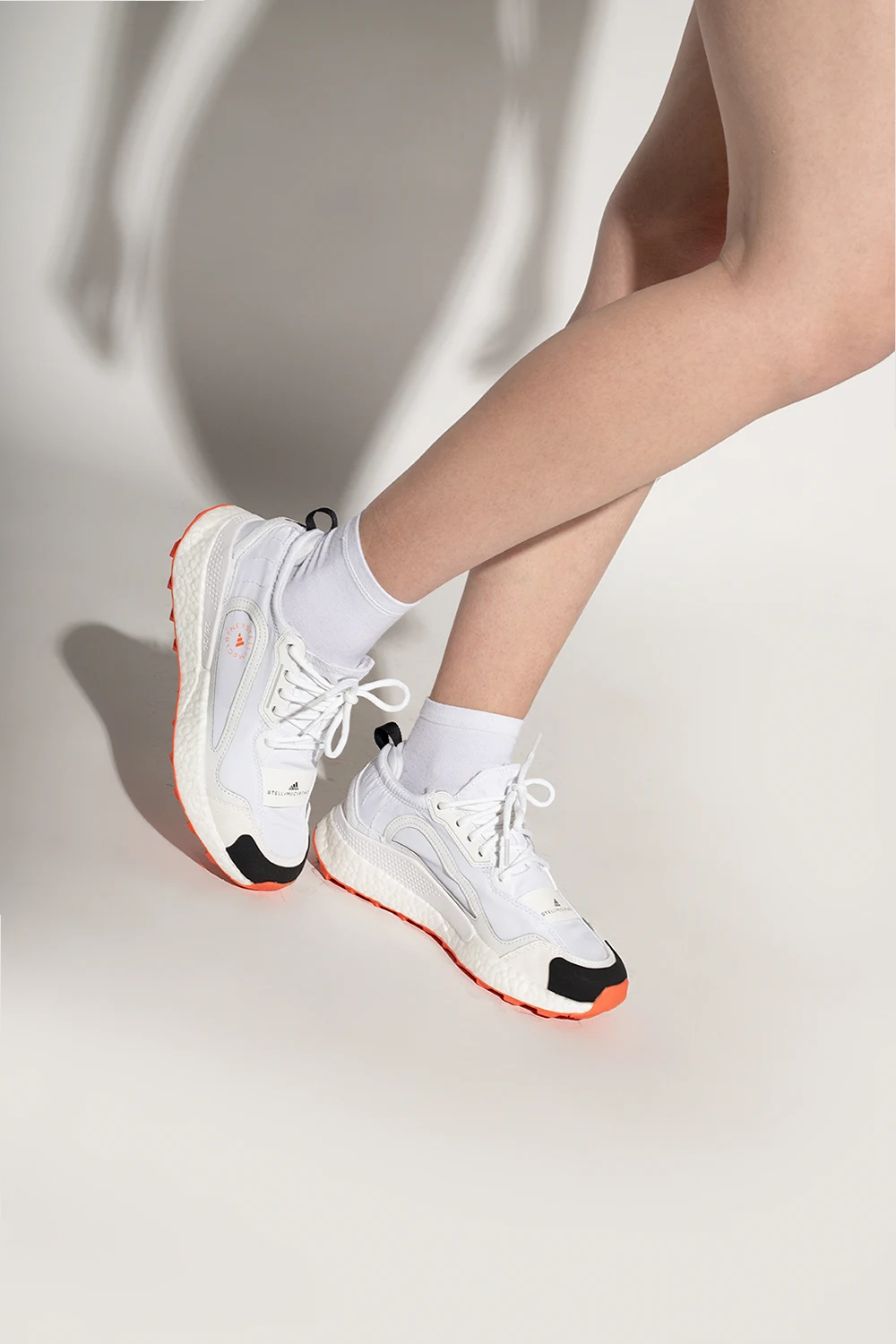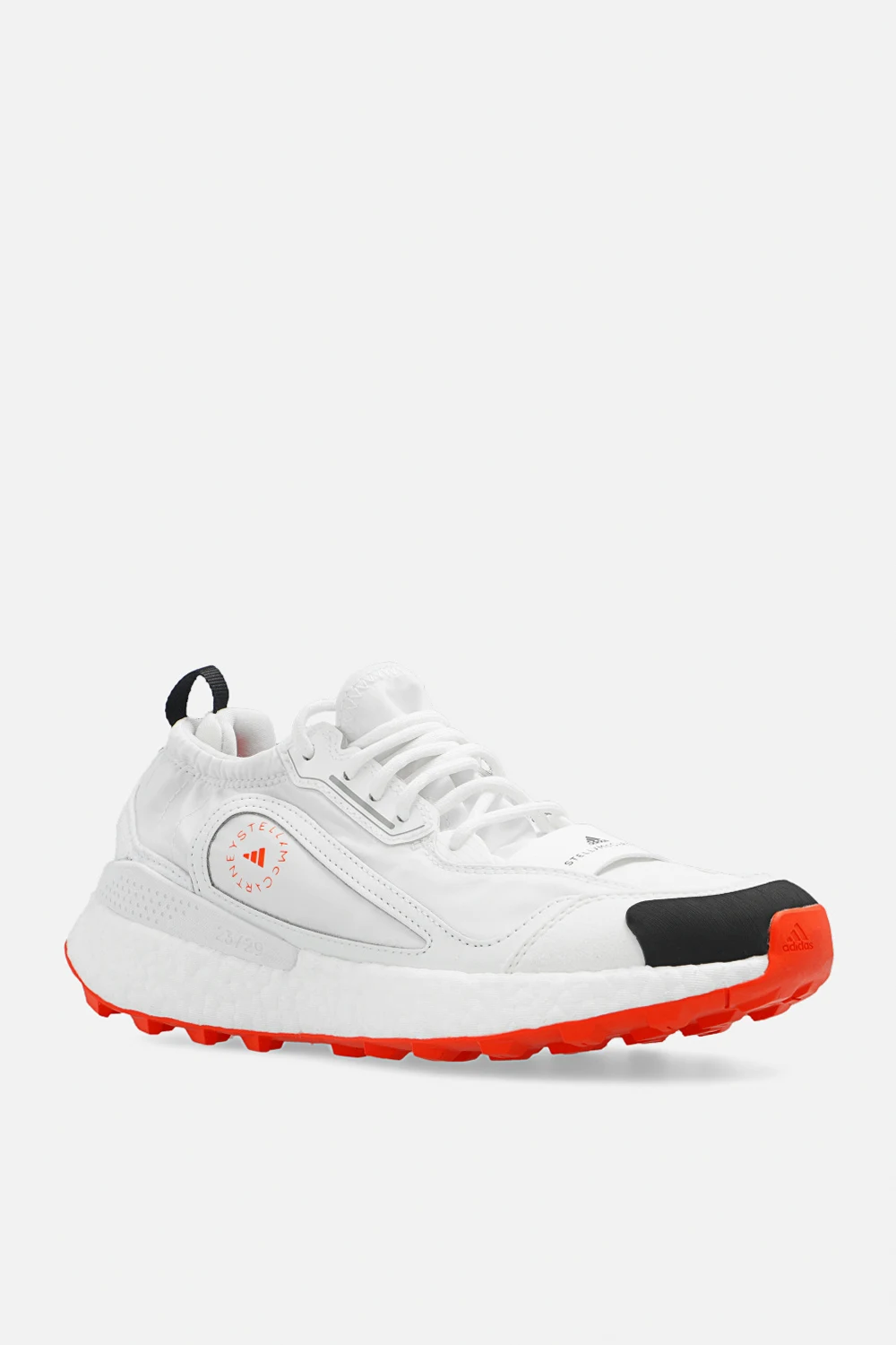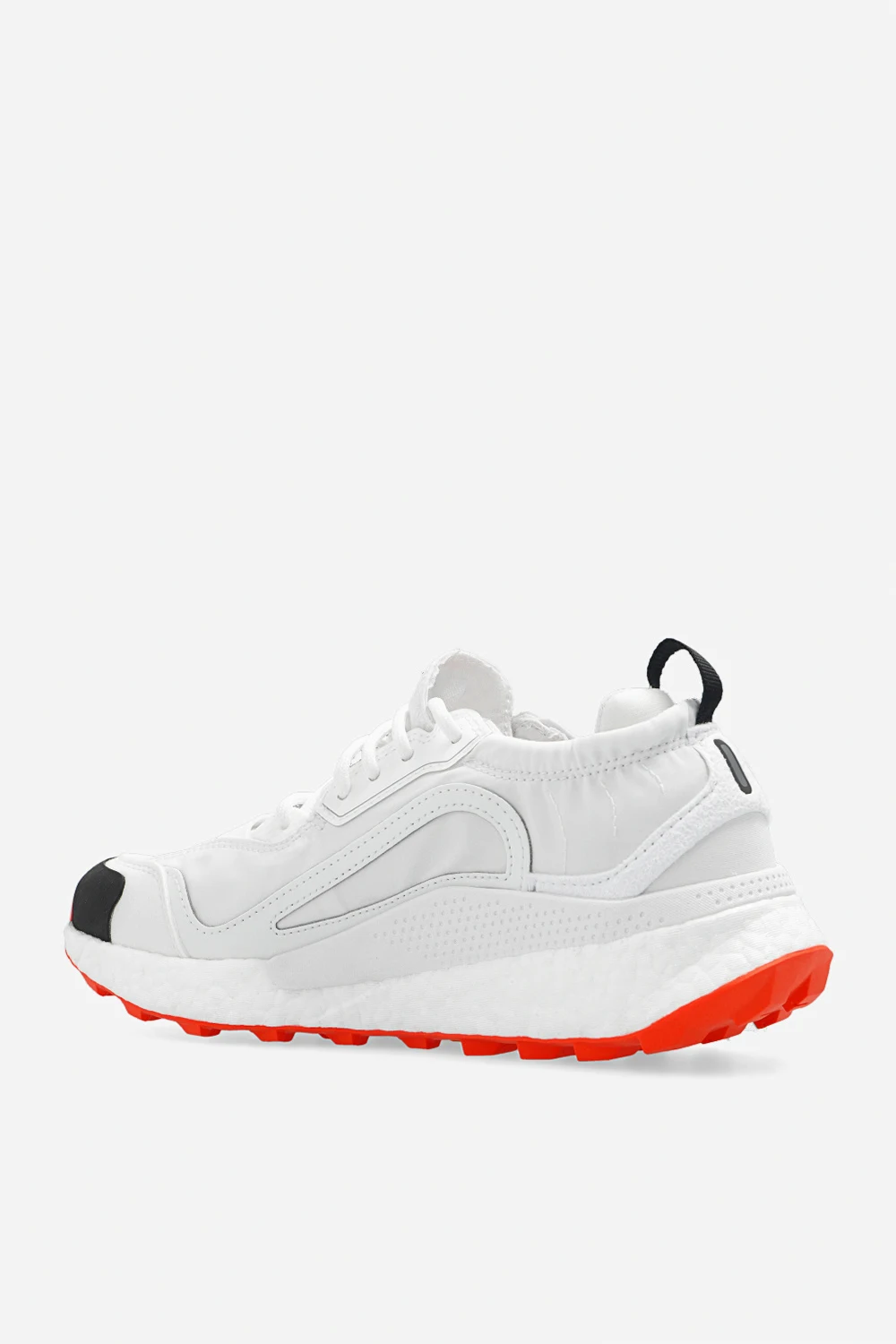 Białe, wsuwane i sznurowane buty do biegania, model ‘Outdoor Boost 2.0 Light’ ADIDAS by Stella McCartney. Wykonane z Primegreen- linii wysokiej jakości materiałów pochodzących z recyklingu. Cholewka wykonana jest w 50% z materiałów pochodzących z recyklingu. Model nie zawiera nowo wyprodukowanego poliestru. Ozdobione logo w kolorze czarnym i pomarańczowym. Technologia COLD.RDY zapewnia izolację i zatrzymuje ciepło. Podeszwa środkowa ‘Boost’. Pomarańczowa podeszwa z gumy Continental™ wykończona żłobieniami ‘Terrex’.