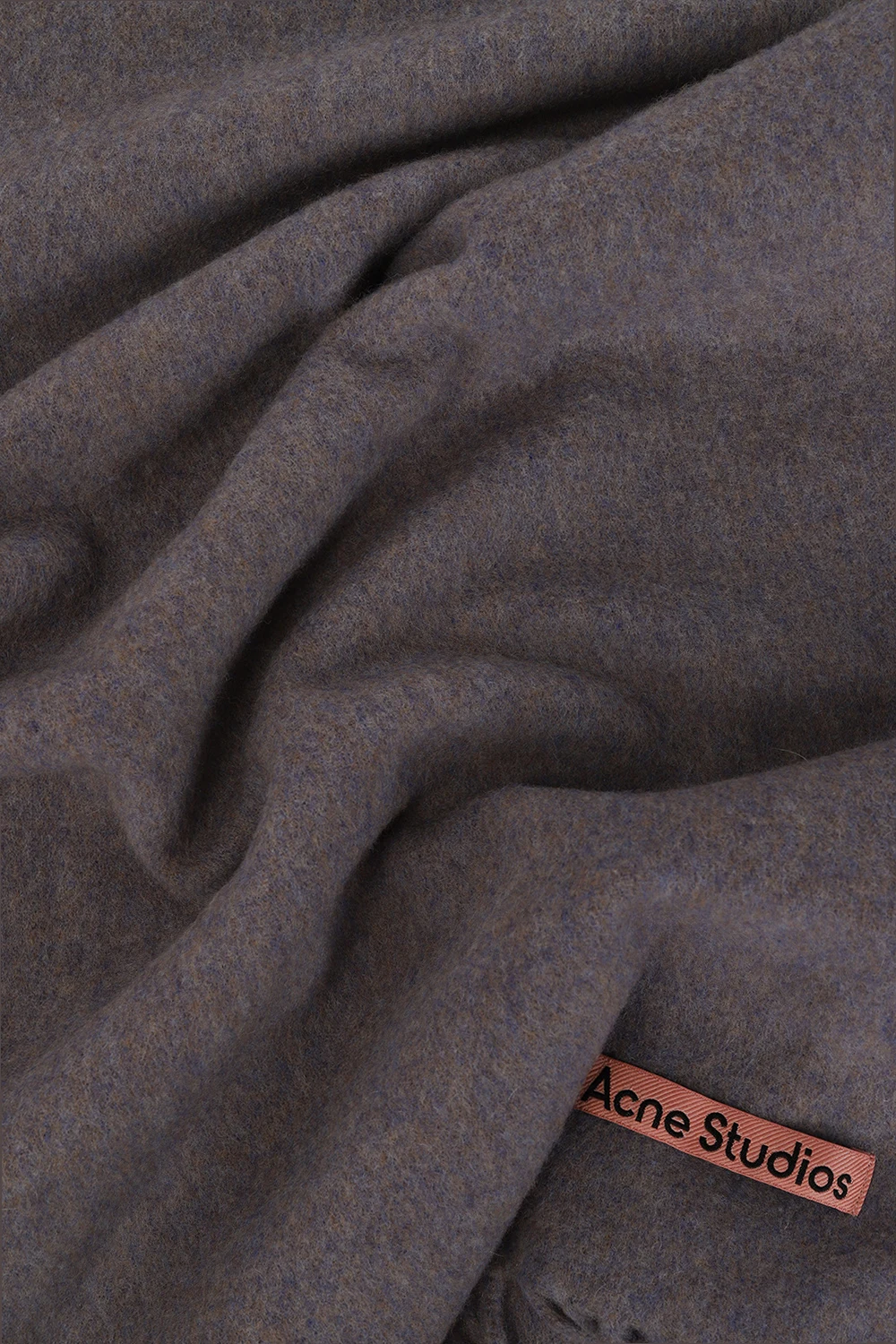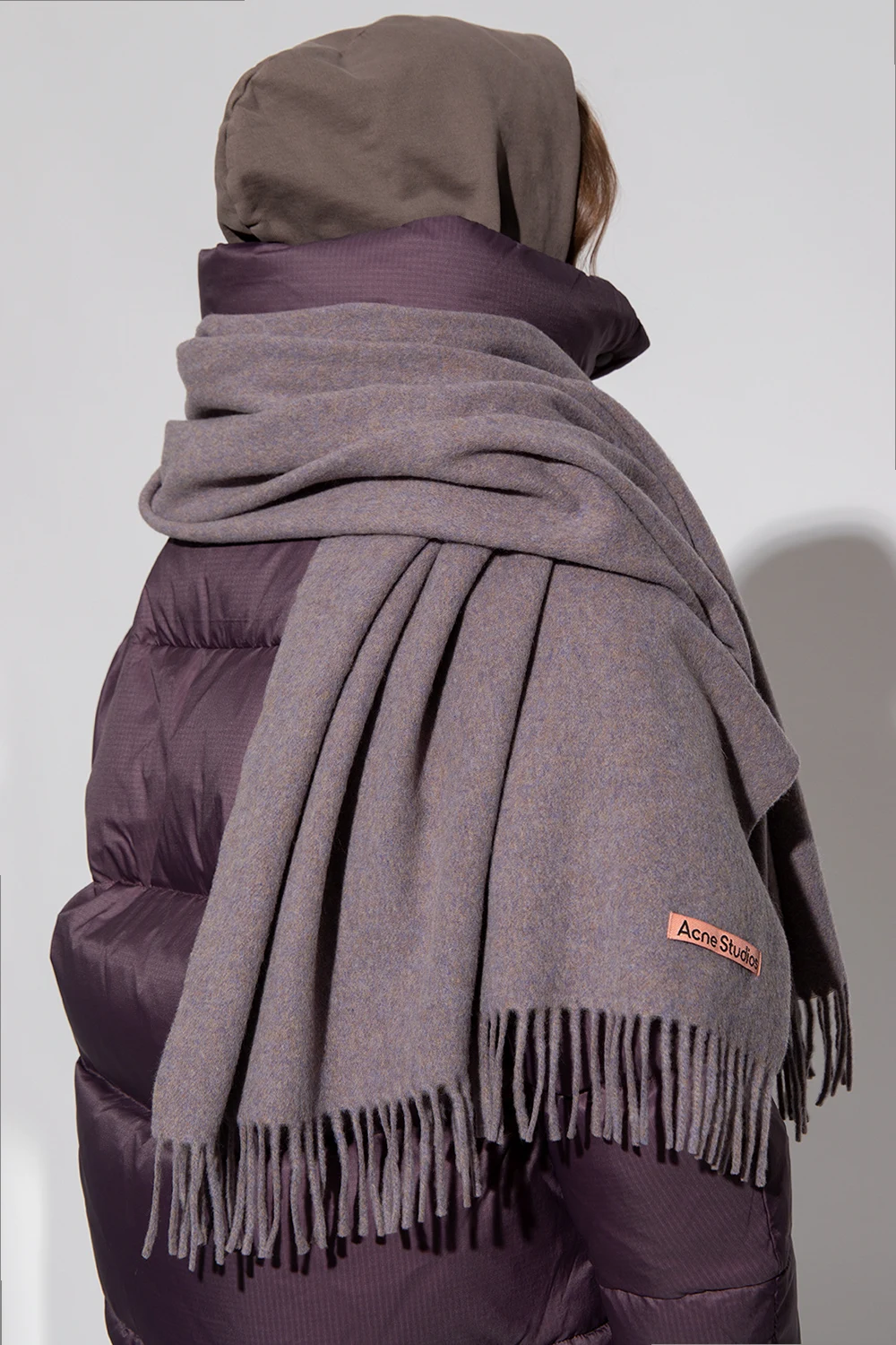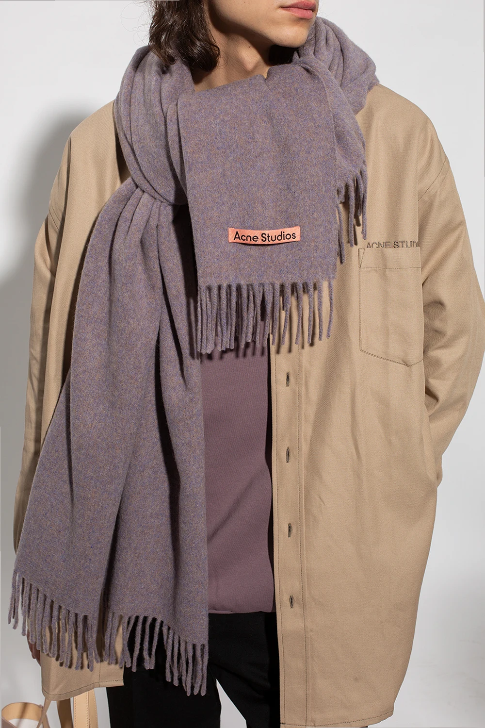 Fioletowy szal Acne Studios. Wykonany z wełny. Ozdobiony naszywką z logo. Wykończony frędzlami.