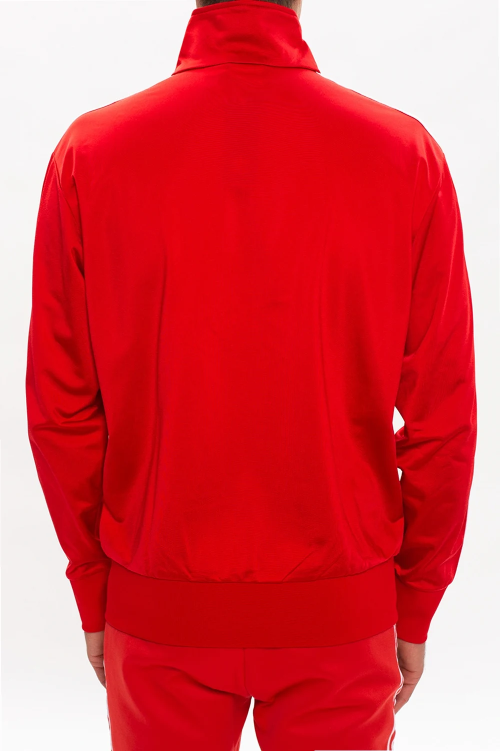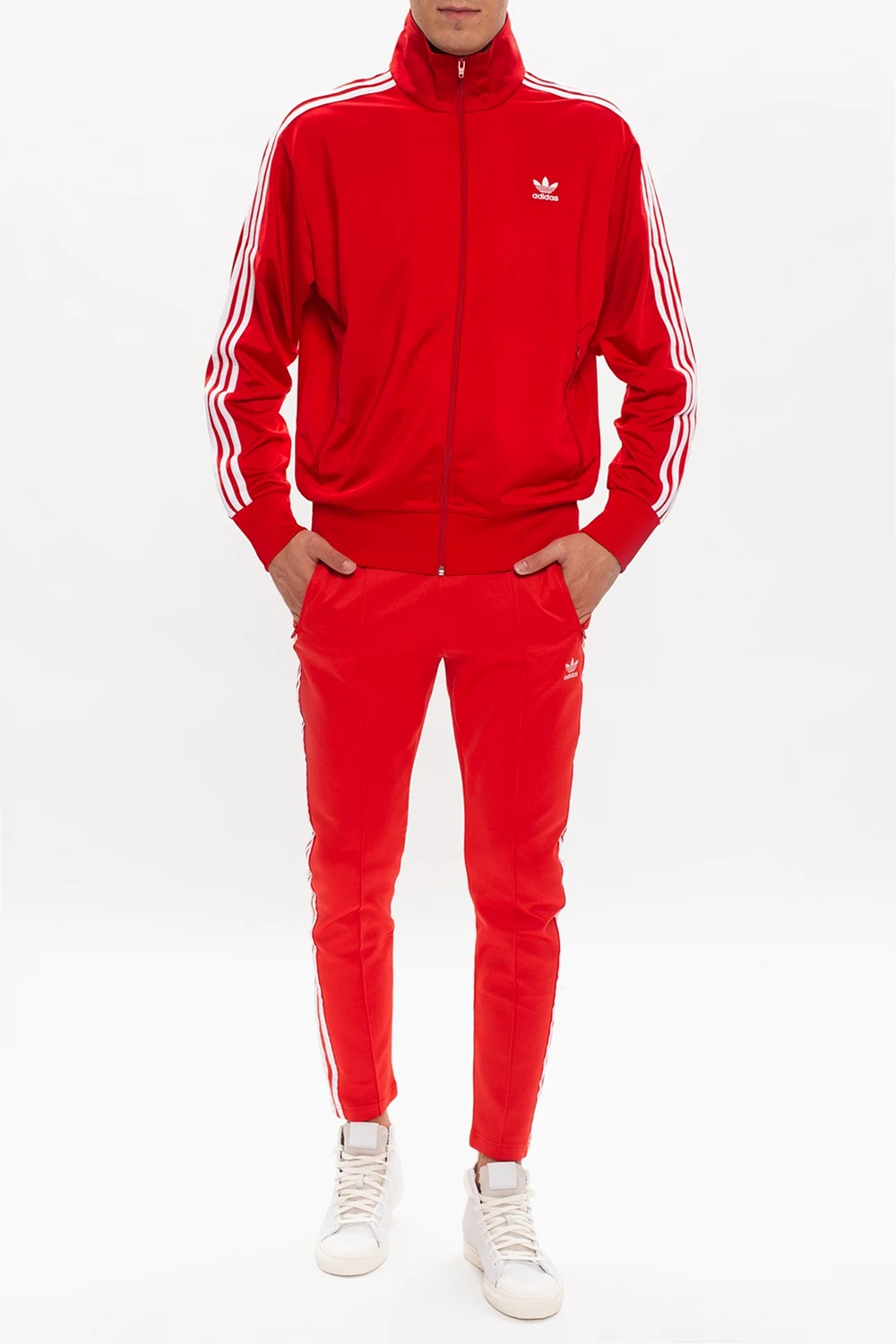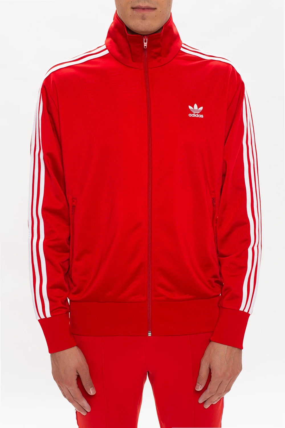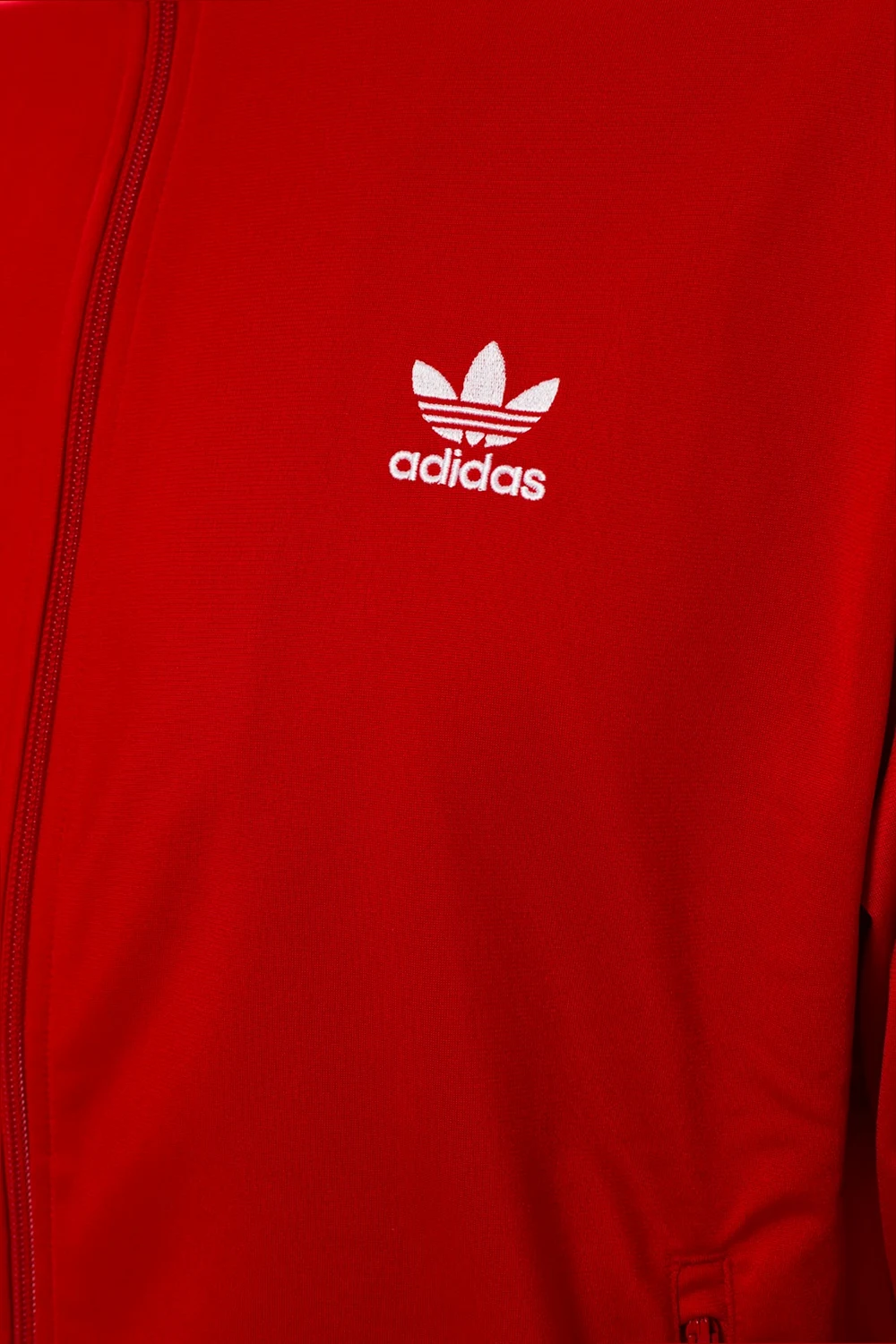 Czerwona bluza ADIDAS Originals. Zapinana na zamek. Ozdobiona wyszytym logo oraz charakterystycznymi dla marki potrójnymi paskami w kolorze białym. Dwie kieszenie zapinane na zamki. Rękawy zakończone ściągaczami.