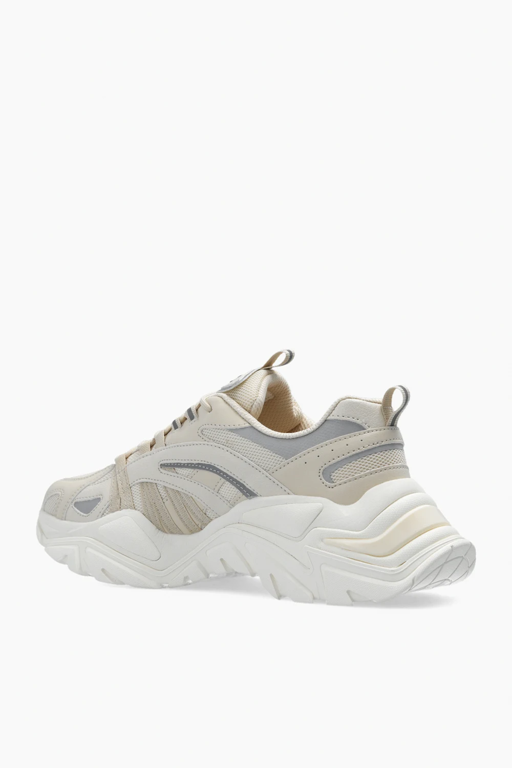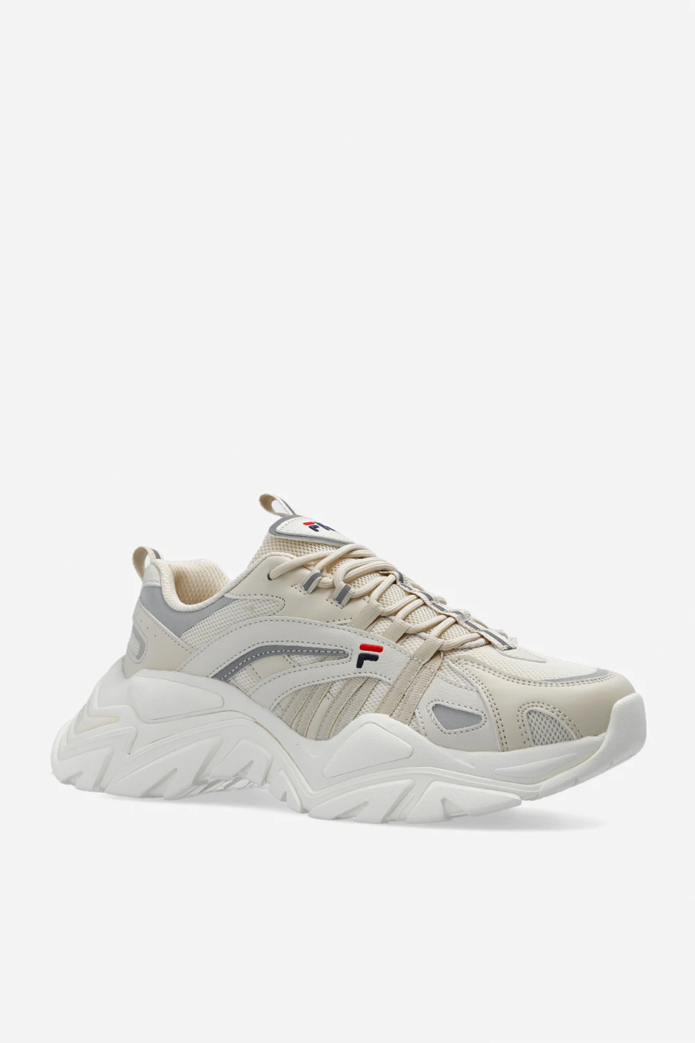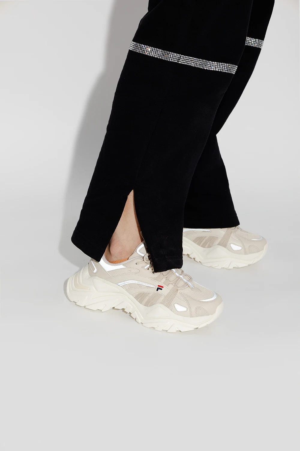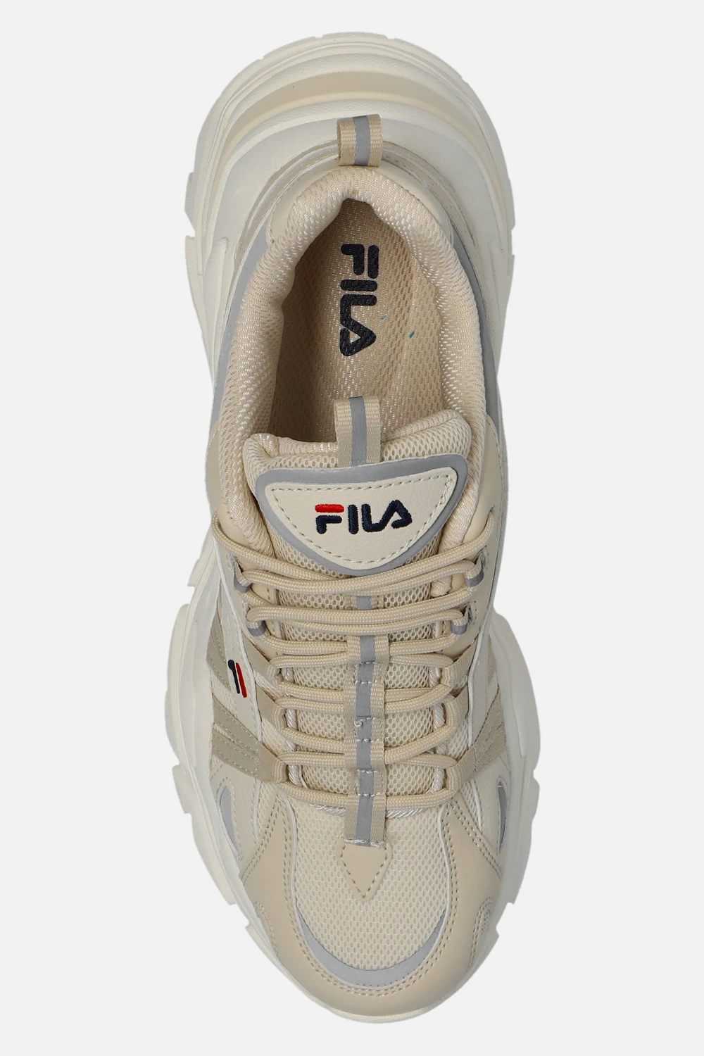 Beżowe, sznurowane buty sportowe, model ‘Electrove’ Fila. Wykonane z imitacji skóry. Na języku naszywka z logo. Z boku wyszyty czerwono-granatową nicią monogram. Odblaskowe wstawki. Biało-kremowa podeszwa wykonana z gumy.