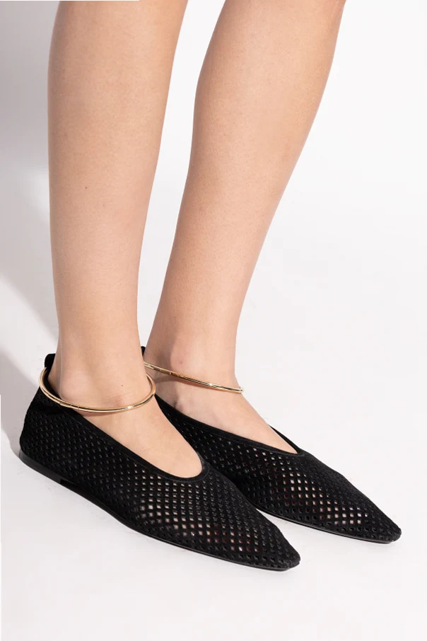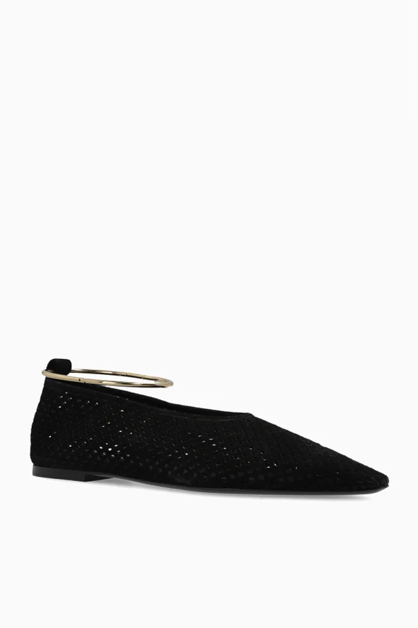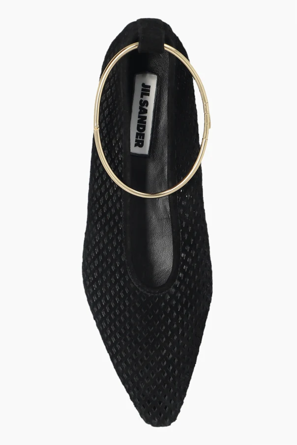 Unikatowym detalem jest metalowa, okrągła obręcz w szlachetnym odcieniu złota, finezyjnie okalająca kostkę niczym bransoleta — odważna alternatywa dla klasycznego zapięcia. Kolor czarny dopełnia całości kompozycji, podkreślając ich ekskluzywny, minimalistyczny styl sygnowany przez dom mody Jil Sander.