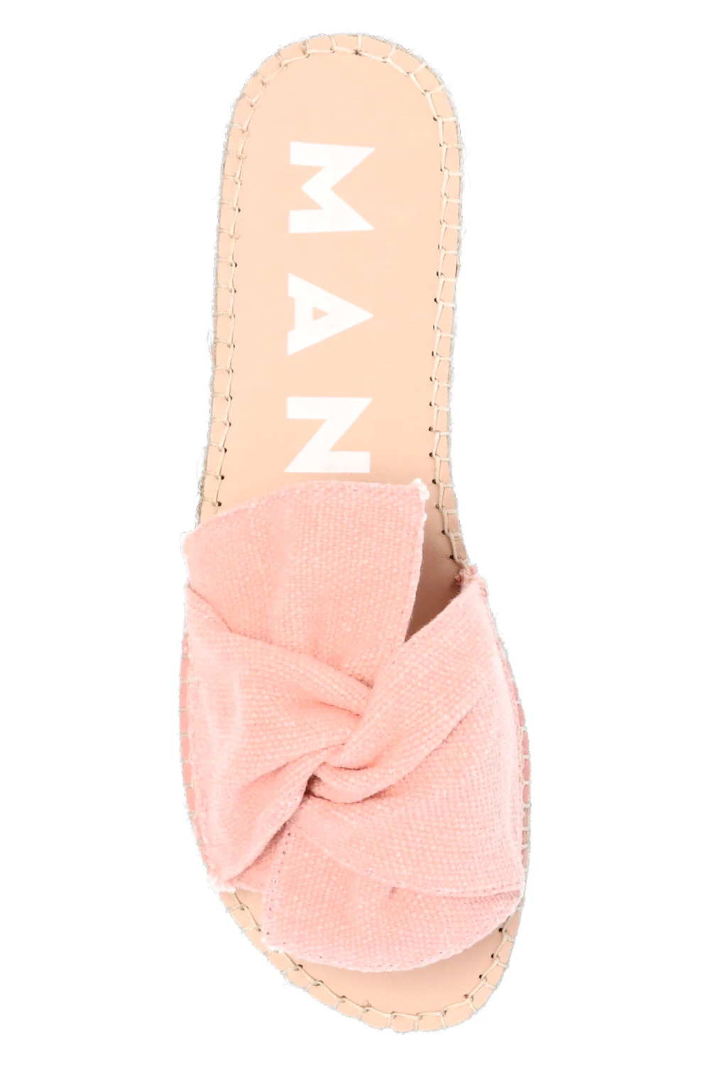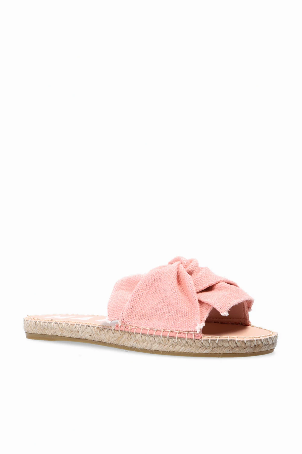 Różowo-beżowe klapki, model ‘Hamptons’ Manebi. Dekoracyjne wiązanie. Wykonane ze skóry. Podeszwa wykonana z naturalnej juty wykończonej cienką warstwą kauczuku w kolorze beżowym.
