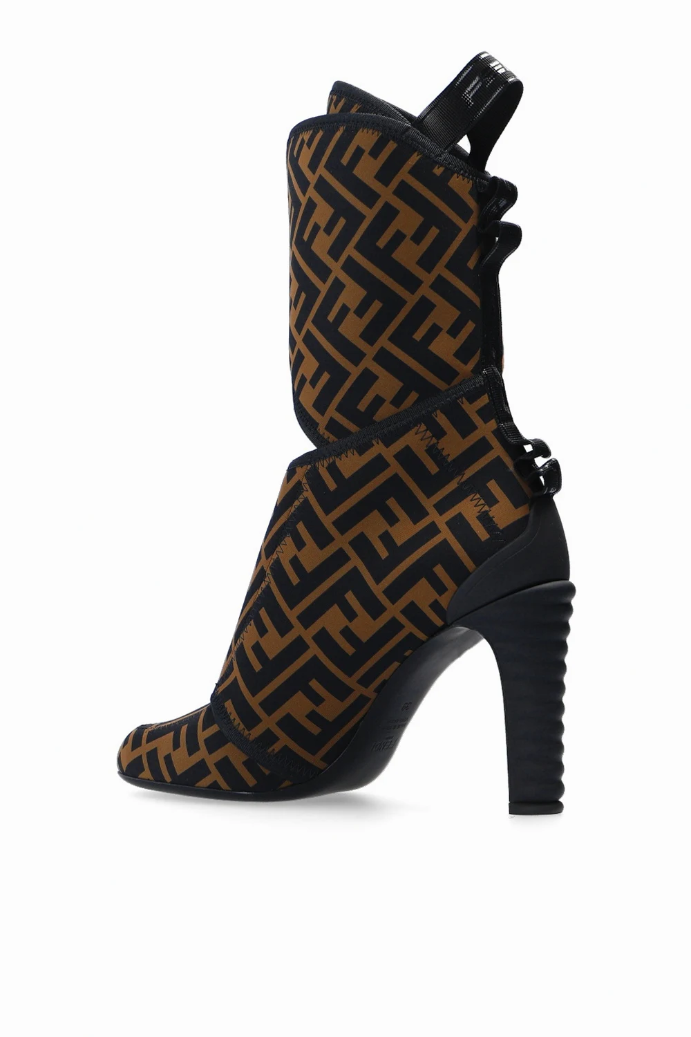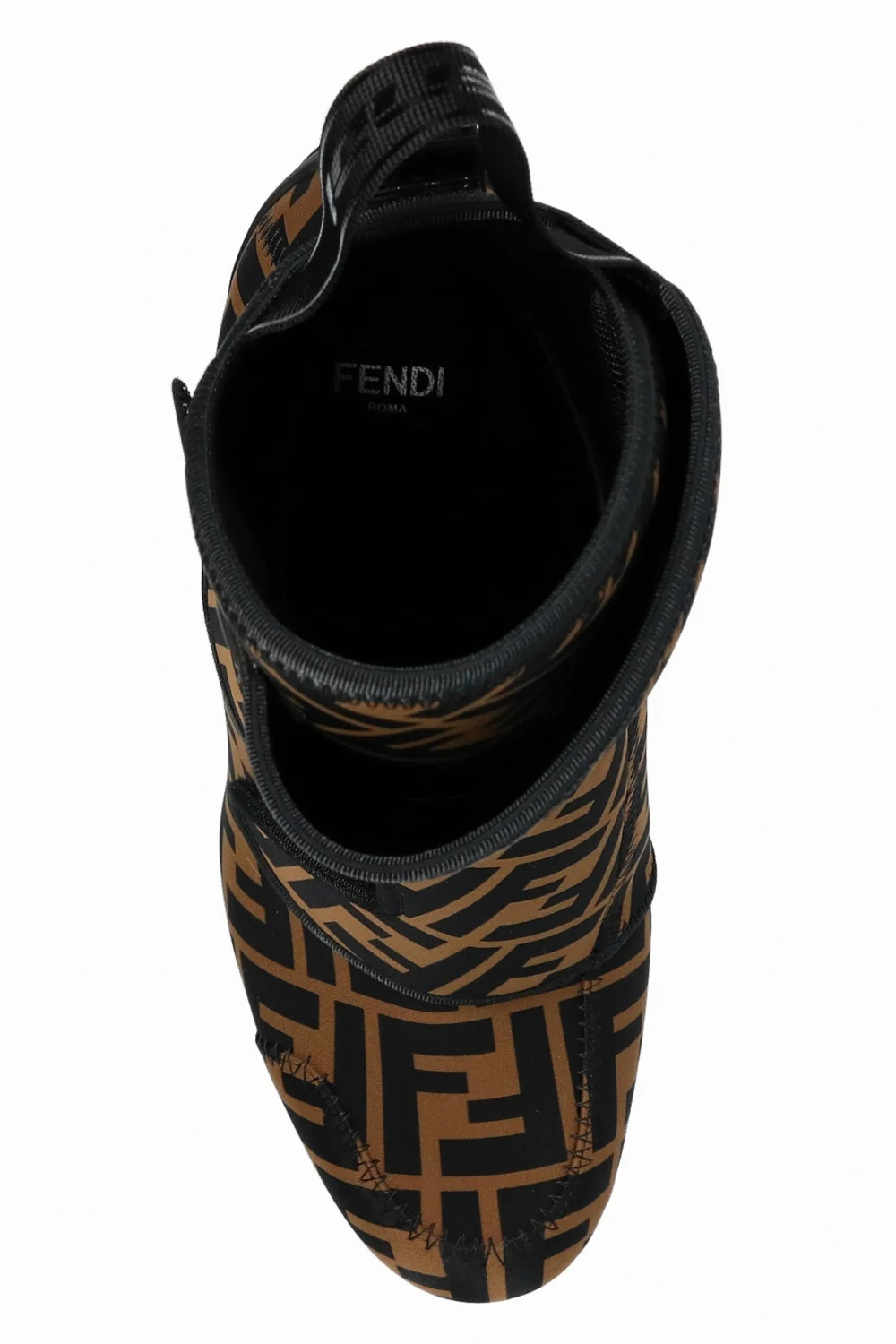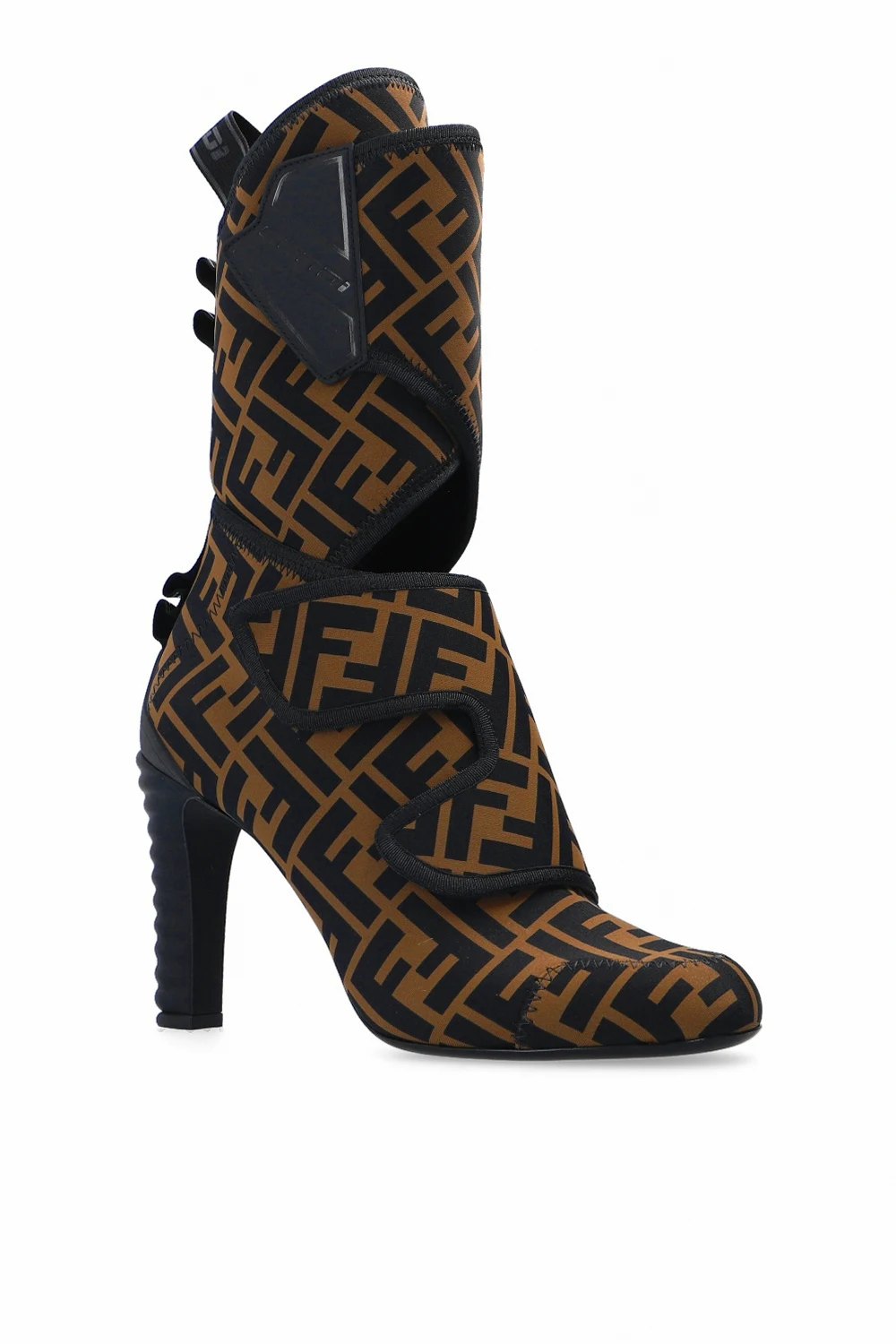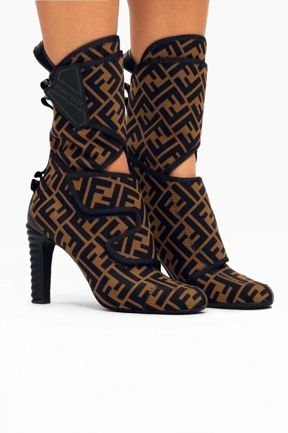 Brązowo-czarne botki za kostkę Fendi. Zapinane na paski z rzepami. Ozdobione nadrukowanym wzorem z logo. Czarna, skórzana podeszwa.
