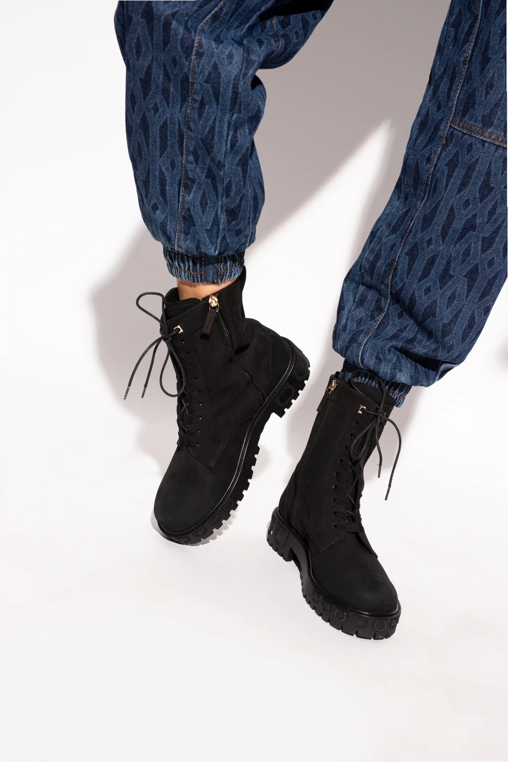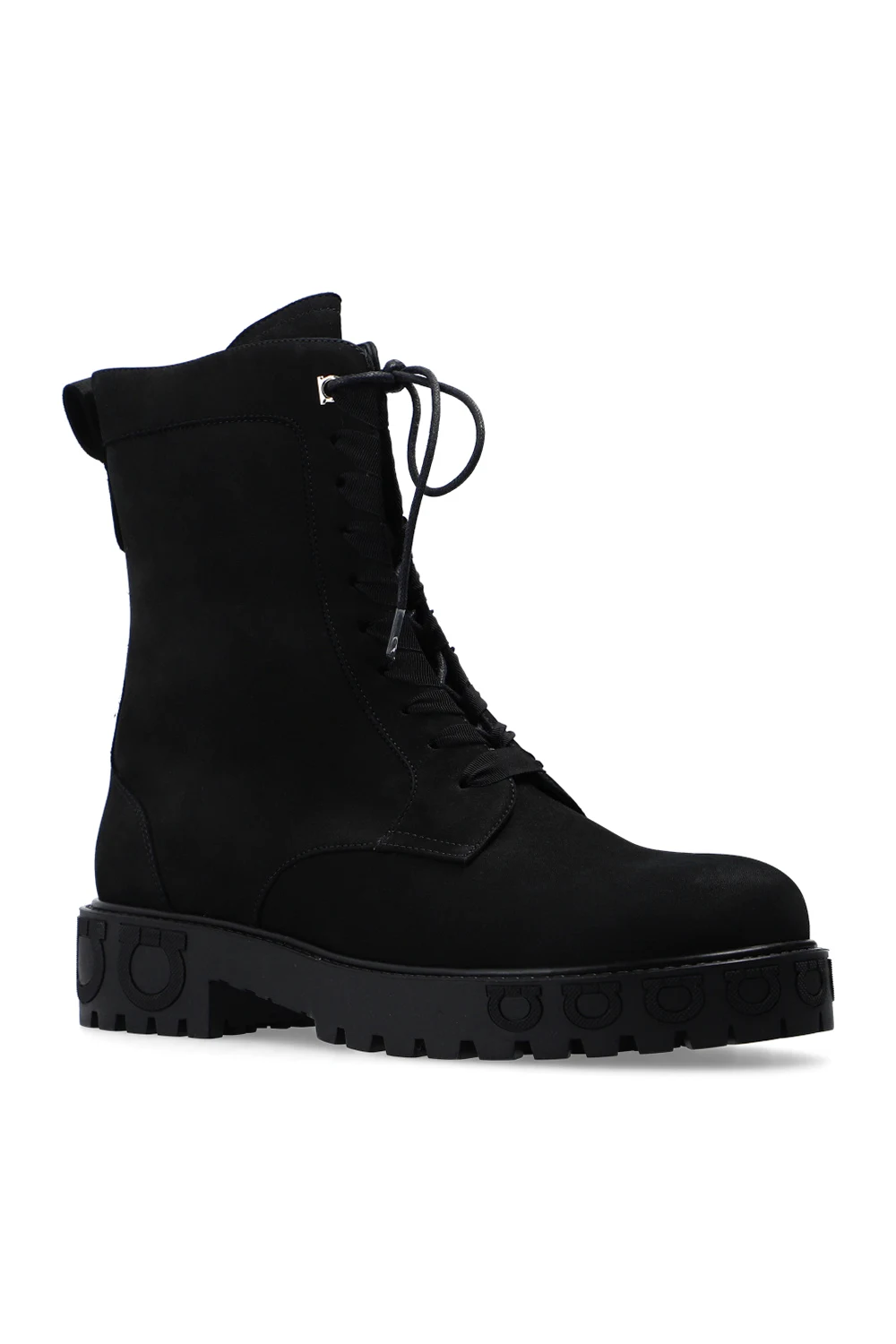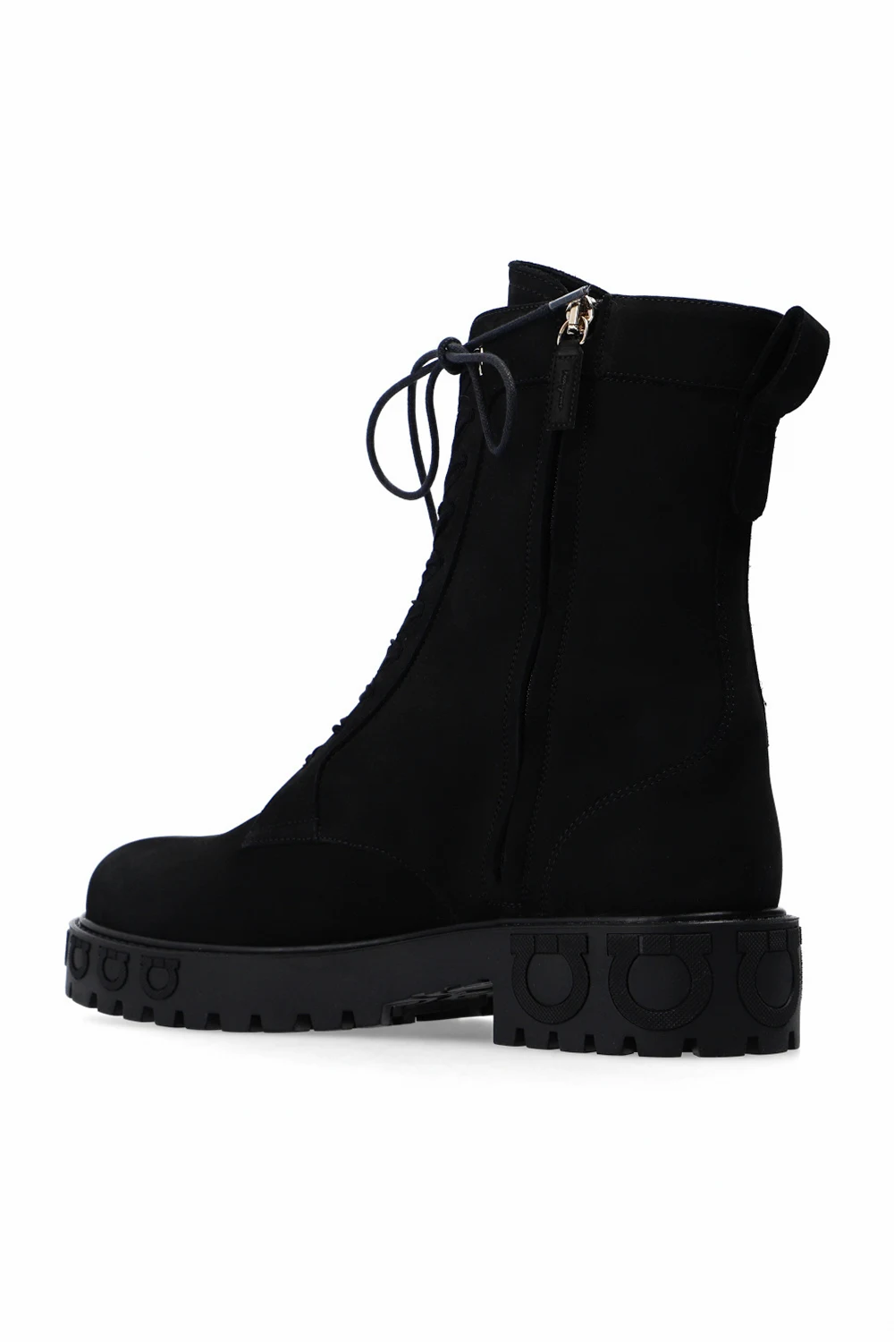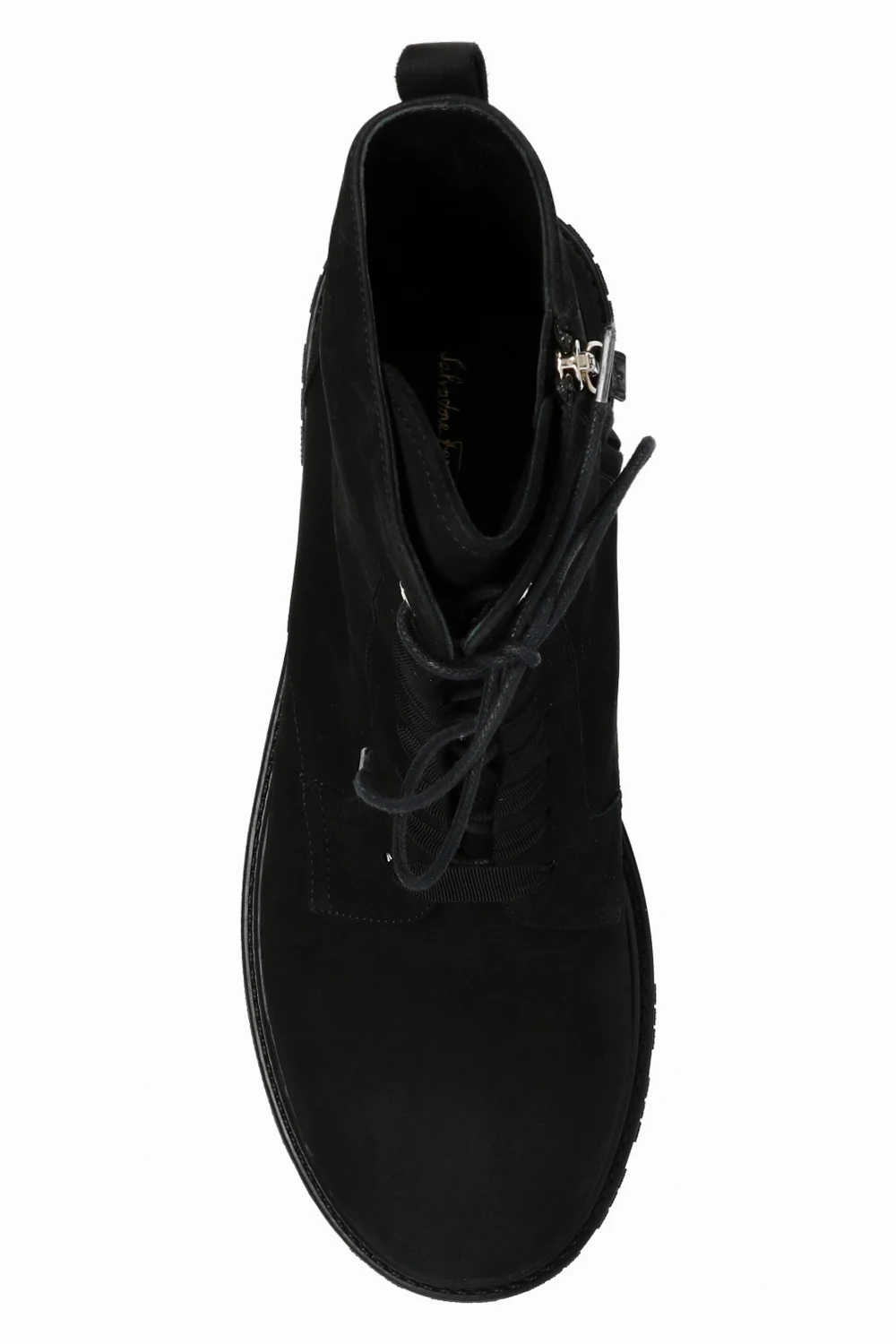 Czarne, sznurowane buty za kostkę, model ‘Chopper’ Salvatore Ferragamo. Wykonane ze skóry cielęcej. Zapinane na zamek. Ozdobione wzorem z logo. Migdałowy nosek. Czarna, gumowa podeszwa.