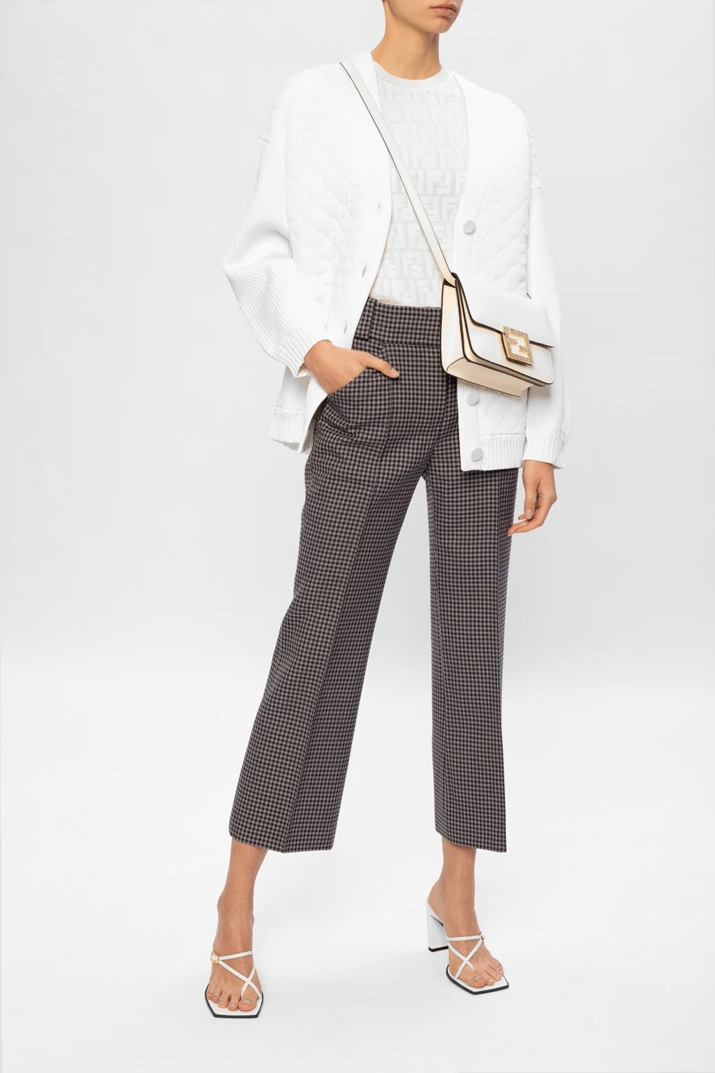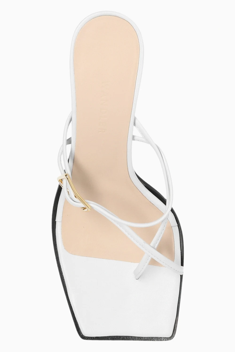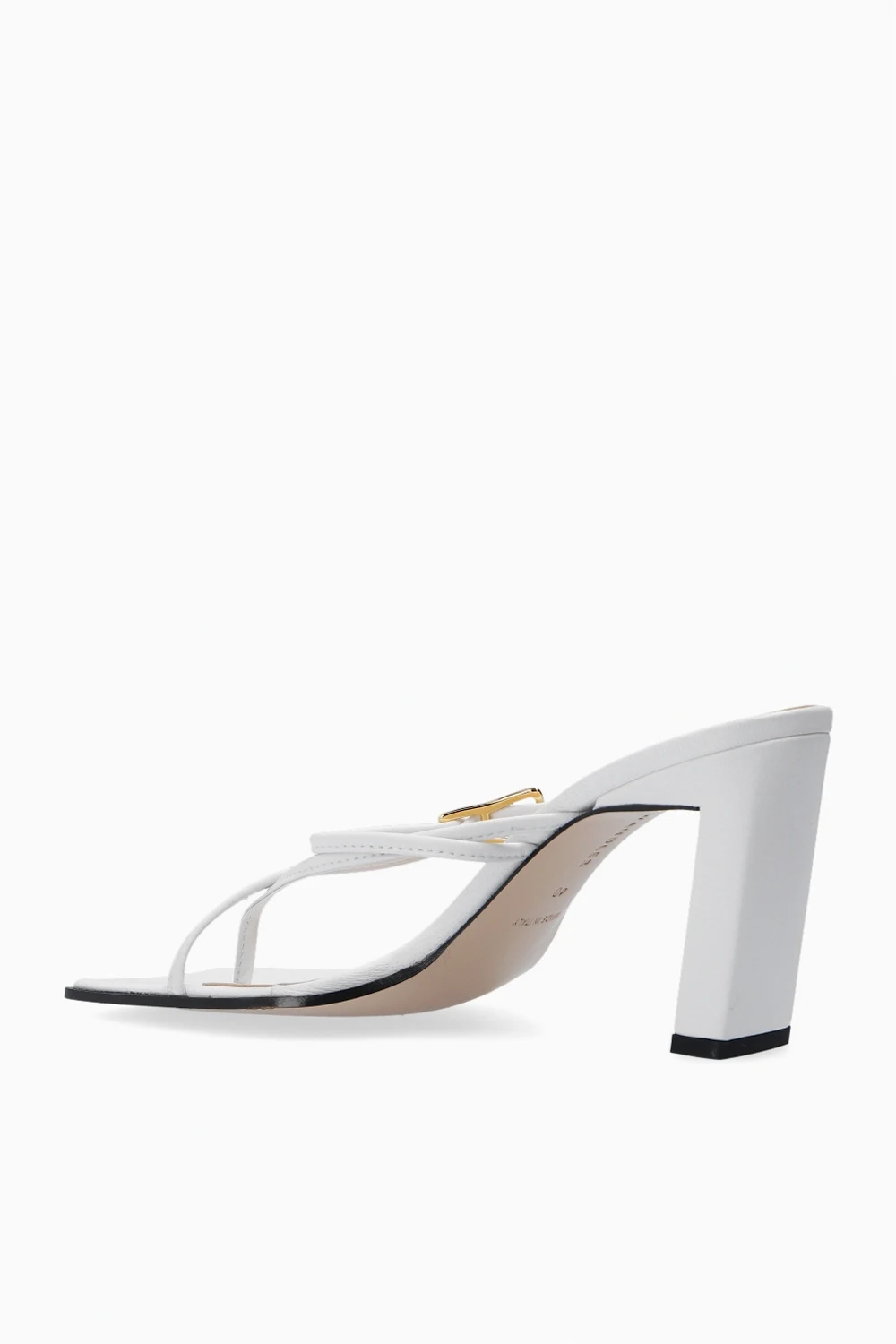 Białe klapki na obcasie, model ‘Yara’ Wandler. Wykonane z jagnięcej skóry. Metalowa aplikacja w kolorze złotym. Kremowa, skórzana podeszwa.